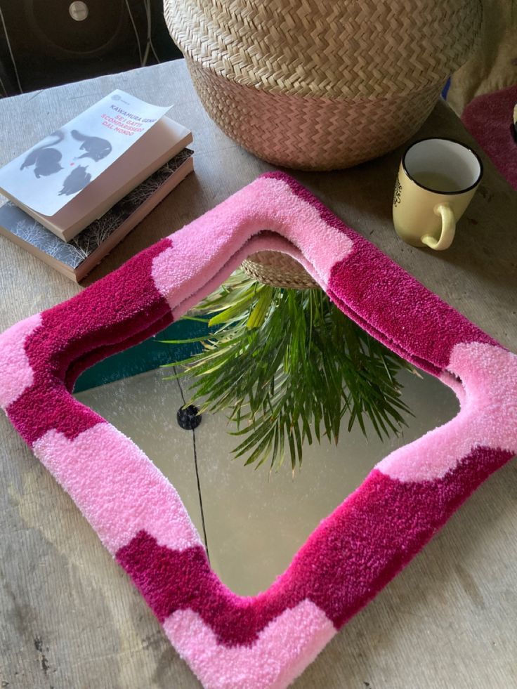 Espejo decorativo enmarcado con la técnica de tufting. El marco tiene una forma ligeramente distorsionada, como si estuviera suavemente ondulado. El diseño es de rayas diagonales y fluidas que alternan entre un rosa fucsia intenso y un rosa pastel suave, creando un fuerte contraste visual. Es una pieza que evoca un estilo Barbiecore o groovy de los 70 y es ideal para añadir una textura suave y un toque de color vibrante a un tocador o pared