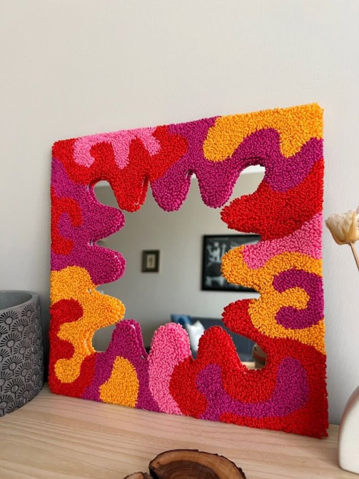 Espejo de pared con un marco grueso y muy colorido, realizado con la técnica de tufting que le da un aspecto shaggy y texturizado. El diseño es un mosaico de formas orgánicas y curvas que se entrelazan. La paleta de colores es intensa, dominada por el rojo carmesí, fucsia brillante, amarillo sol y naranja. El borde interno del espejo es irregular y sigue el contorno de las formas, dando una apariencia de patrón derretido o “lava lamp”. Es una pieza de diseño de interiores que se inscribe en la estética neopop y maximalista