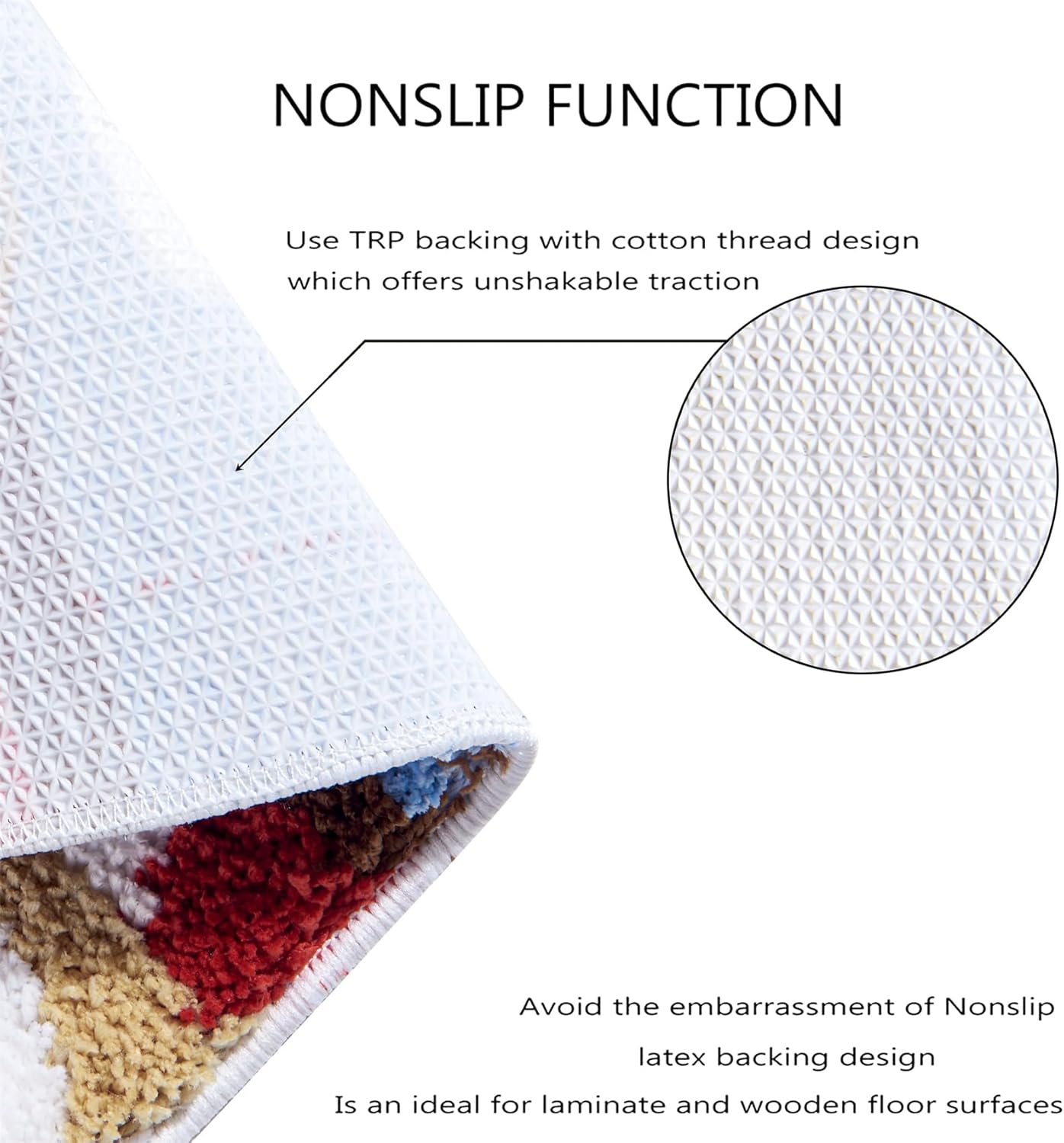 Nuestra alfombra bohemia de Navidad cuenta con una parte trasera de goma antideslizante, añadiendo miles de puntos antideslizantes en la parte posterior de la alfombra decorativa temática de invierno para evitar que se resbale o se pliegue al pisarla.