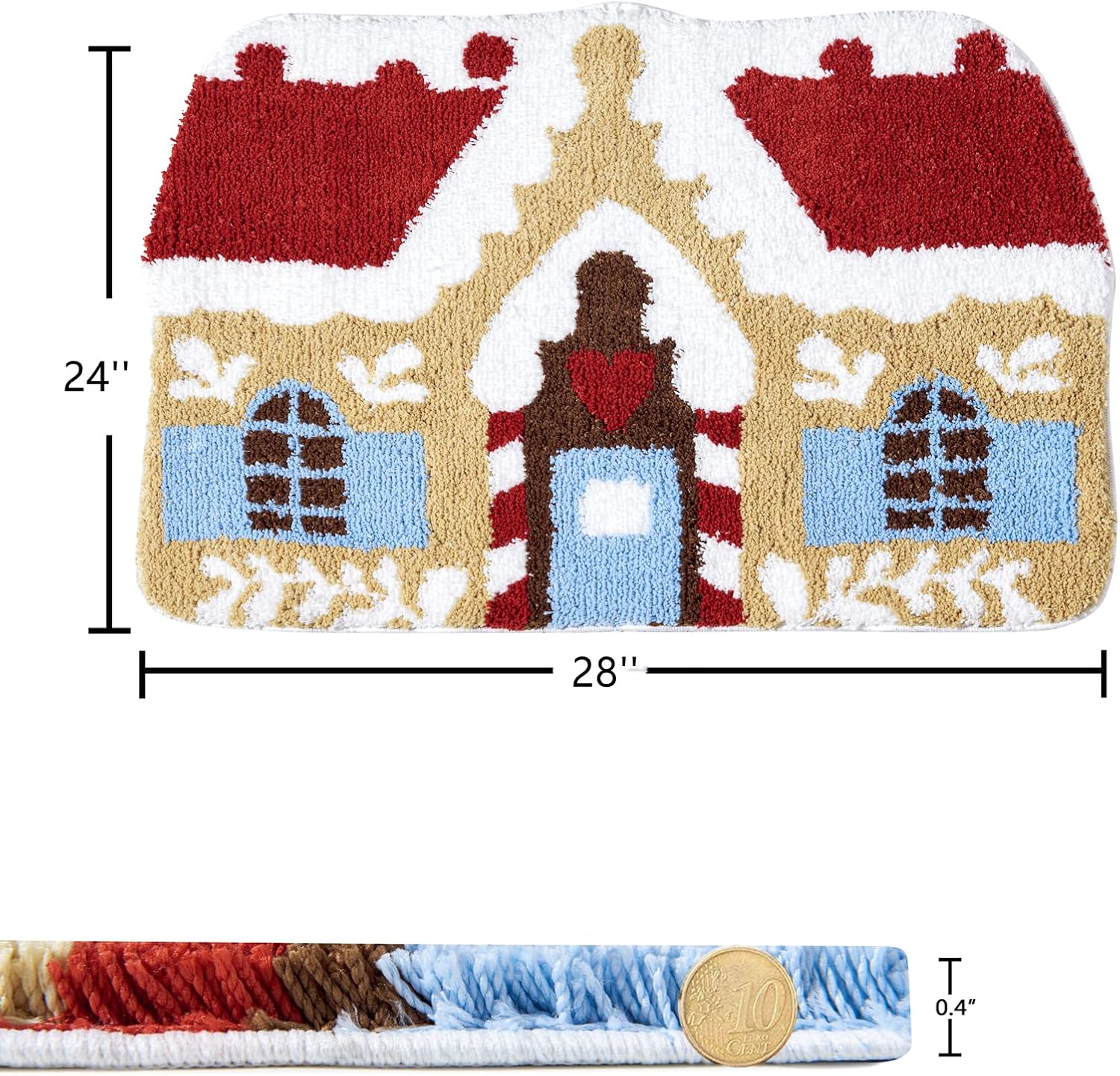 La alfombra festiva está hecha con microfibra de felpa de alta calidad. Mide 2 x 3 (aprox. 91.4 cm) (toma la longitud más larga debido al diseño moldeado), el pelo mide 0.4 (aprox. 1.0 cm) de altura, muy suave y acogedor al tacto. Es ideal para mantener tus pies calientes de suelos de madera fría.