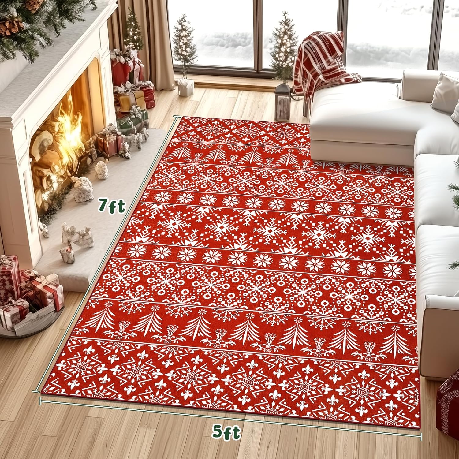 Findosom Alfombra de Navidad lavable de 5 x 7 pies, antideslizante, suave, grande con copo de nieve rojo, alfombra de lana sintética de pelo bajo para sala de estar, pasillo, cocina, entrada