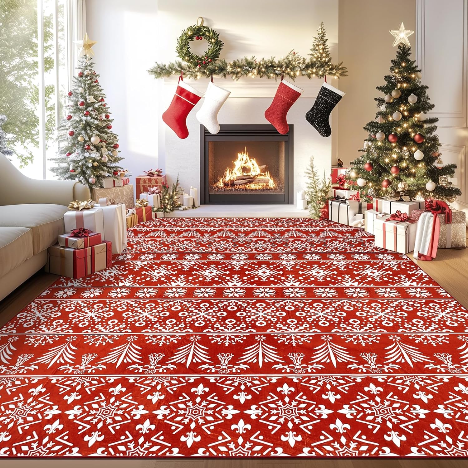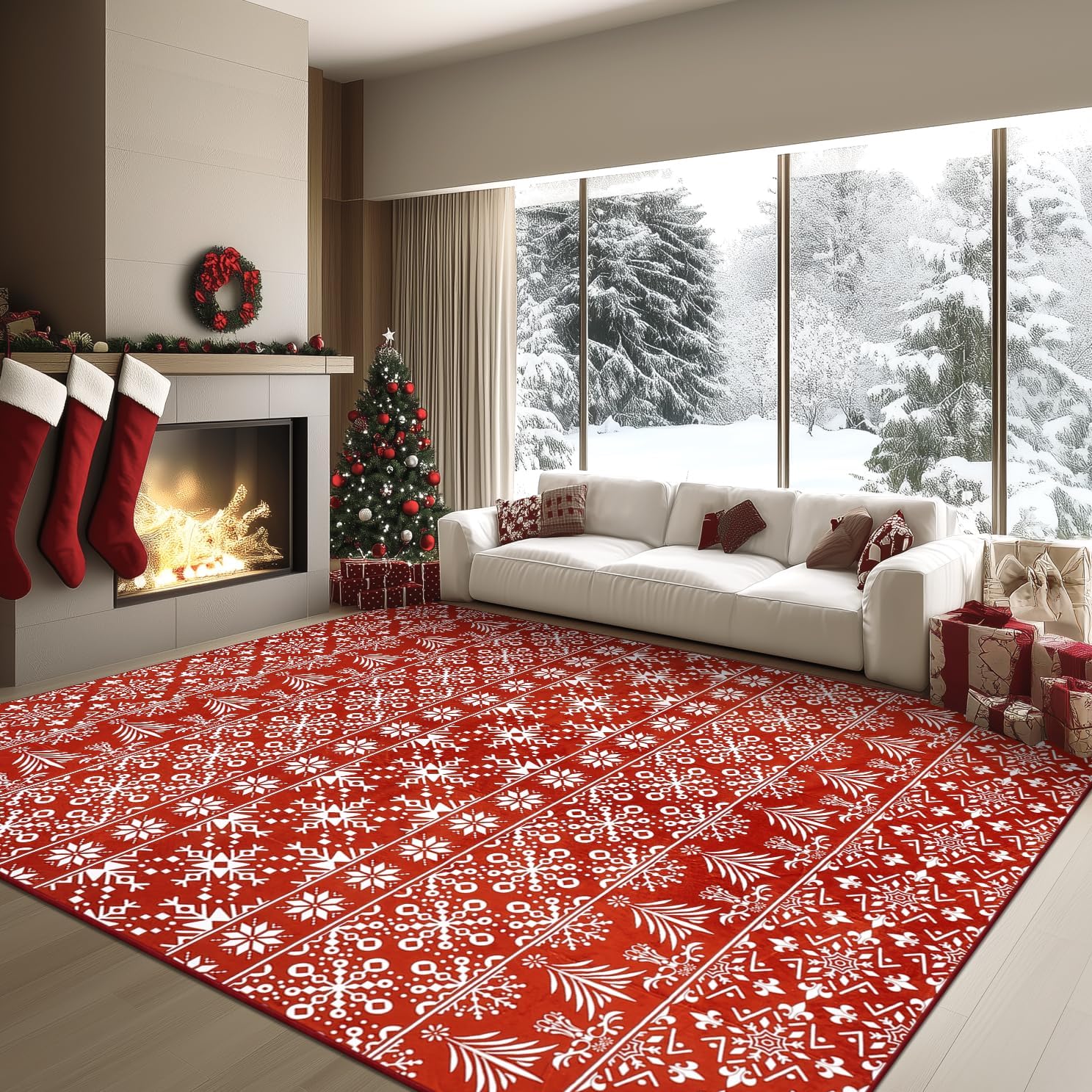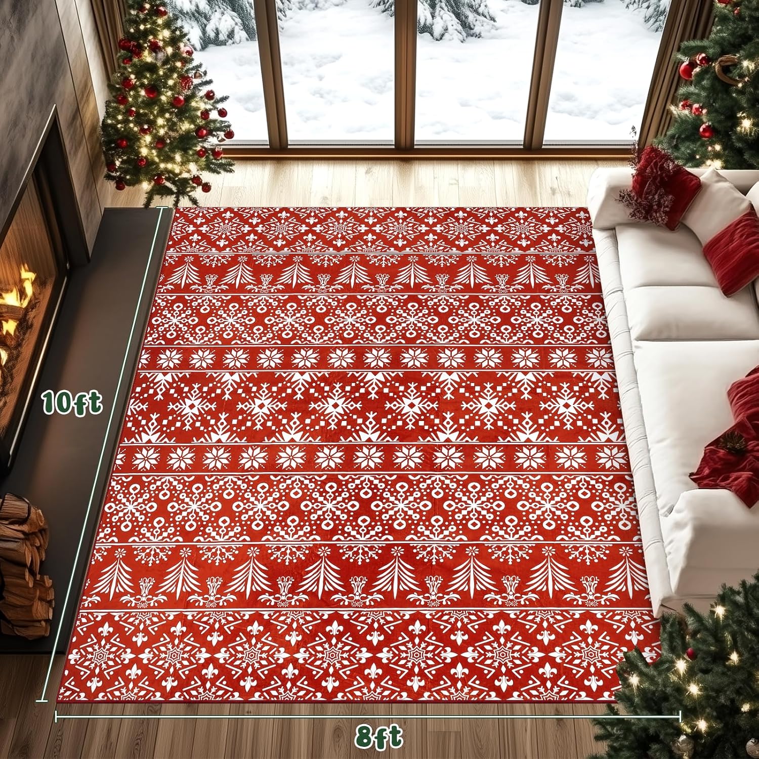 Diseño navideño festivo: transforma tu hogar en un país de las maravillas de invierno con nuestra alfombra de Navidad bellamente diseñada de 8 x 10 (aprox. 25.4 cm), con vibrantes motivos navideños como copos de nieve rojos y árboles de Navidad. Perfecto para añadir un toque de decoración navideña a tu sala de estar, dormitorio, entrada o cualquier espacio de tu hogar
