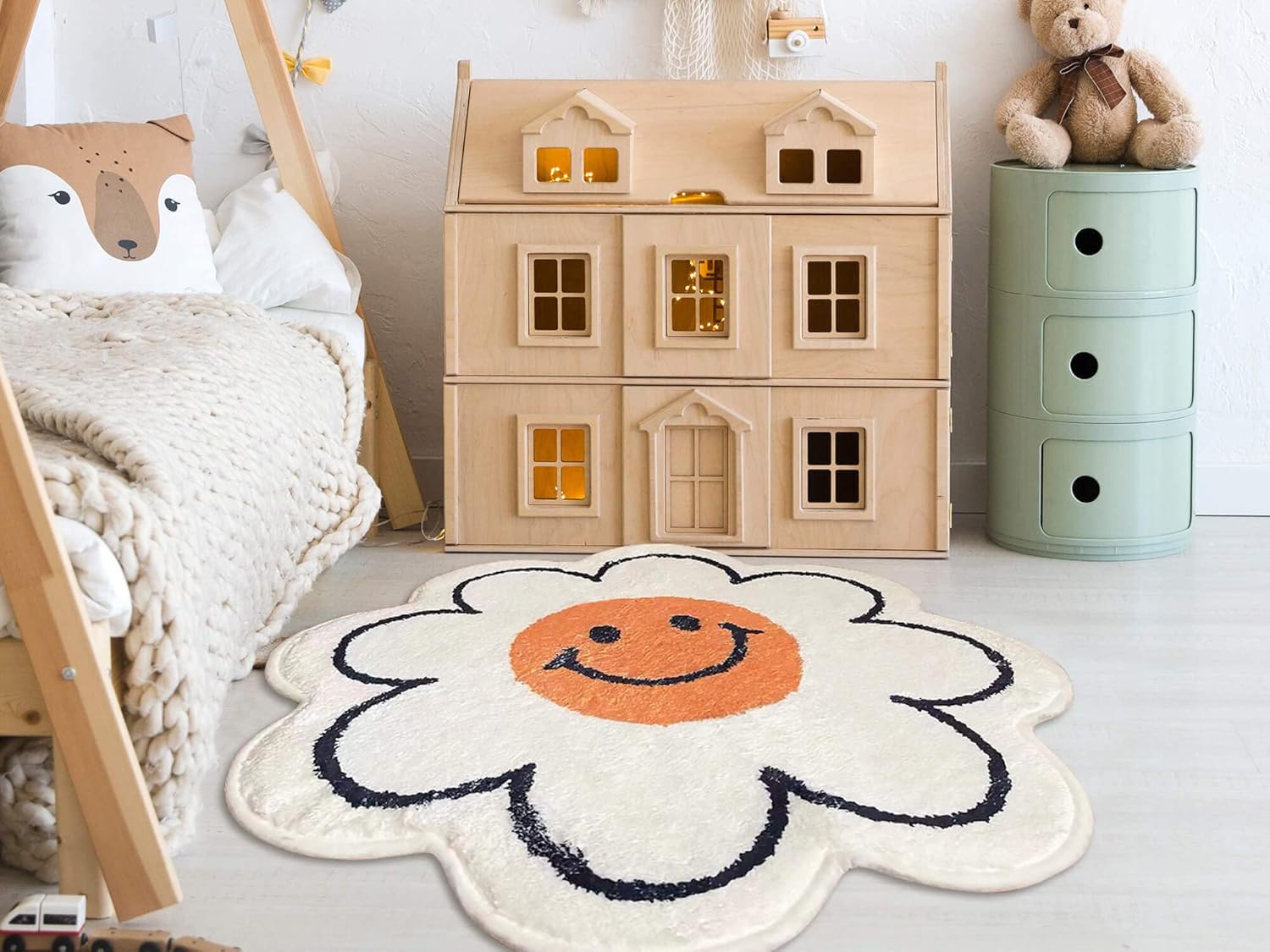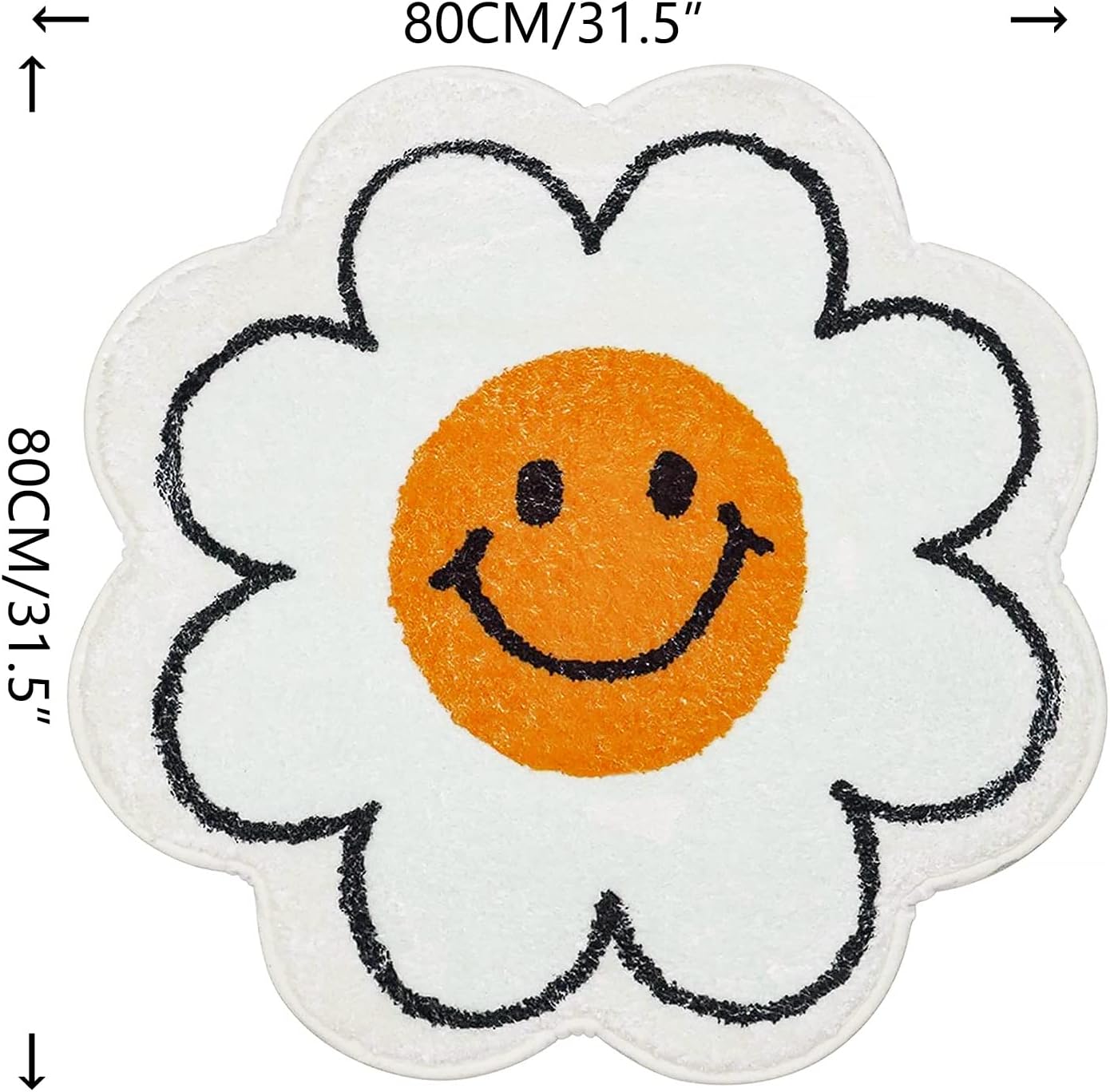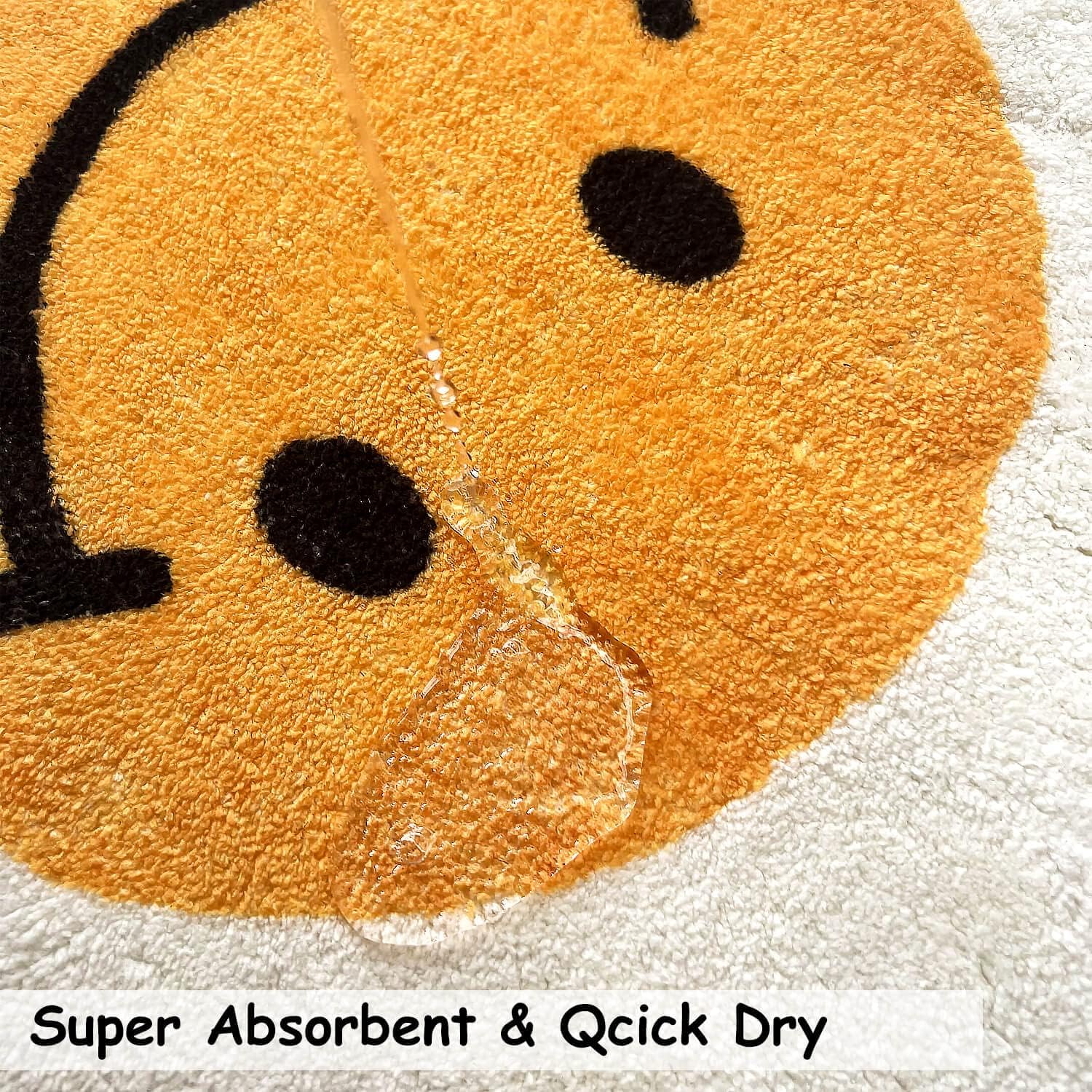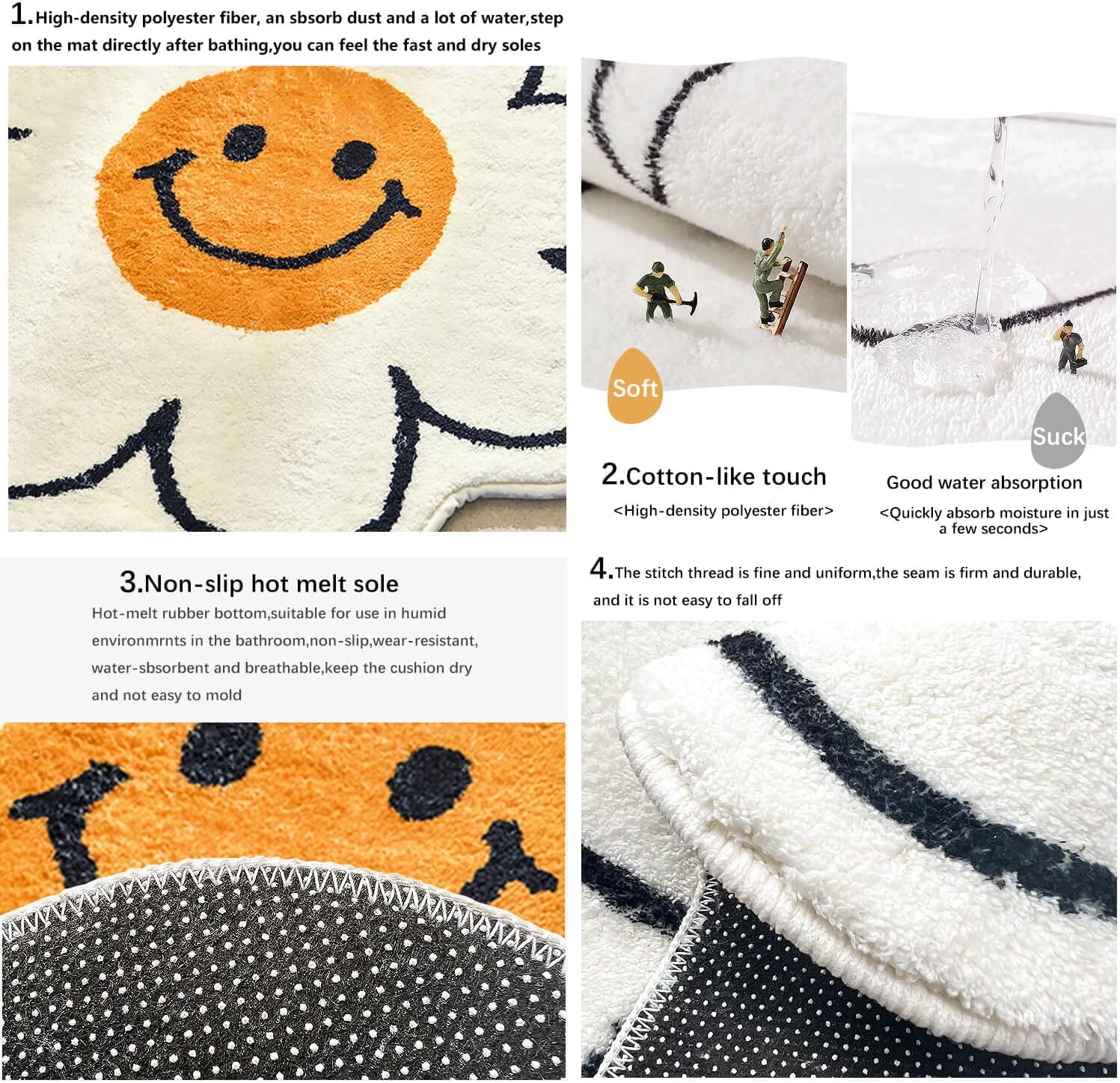 Colores brillantes y decorativos: la alfombra de baño Happy Face es de colores brillantes y tiene una retención de color duradera, la superficie de felpa blanca con la cara feliz amarilla se ve muy linda y hermosa, no puede evitar amarla, especialmente adecuada como alfombra de decoración de habitación.
