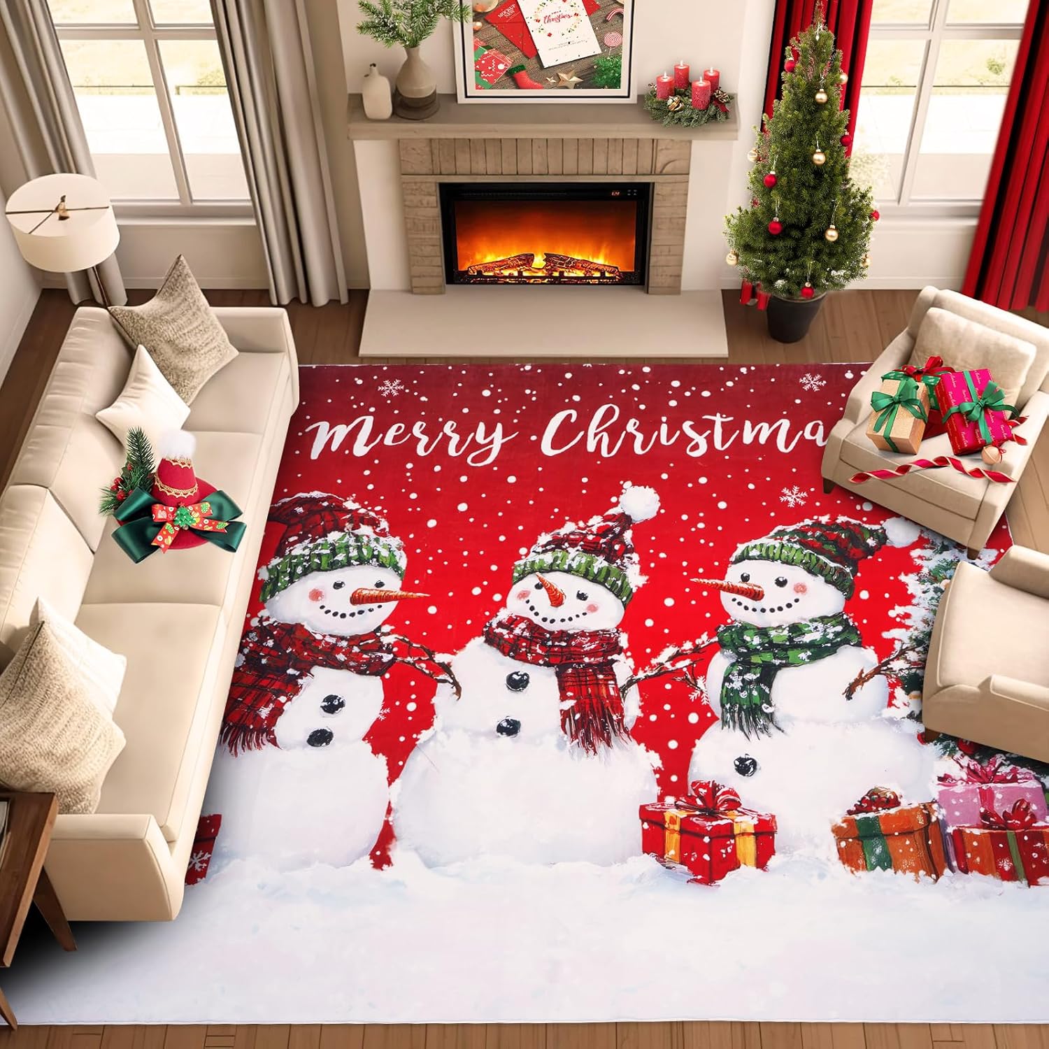 FRAMICS Alfombra de área de Navidad de 8 x 10 pies, alfombra de muñeco de nieve de Navidad para dormitorio, alfombra lavable para sala de estar, alfombra roja antideslizante para decoración de