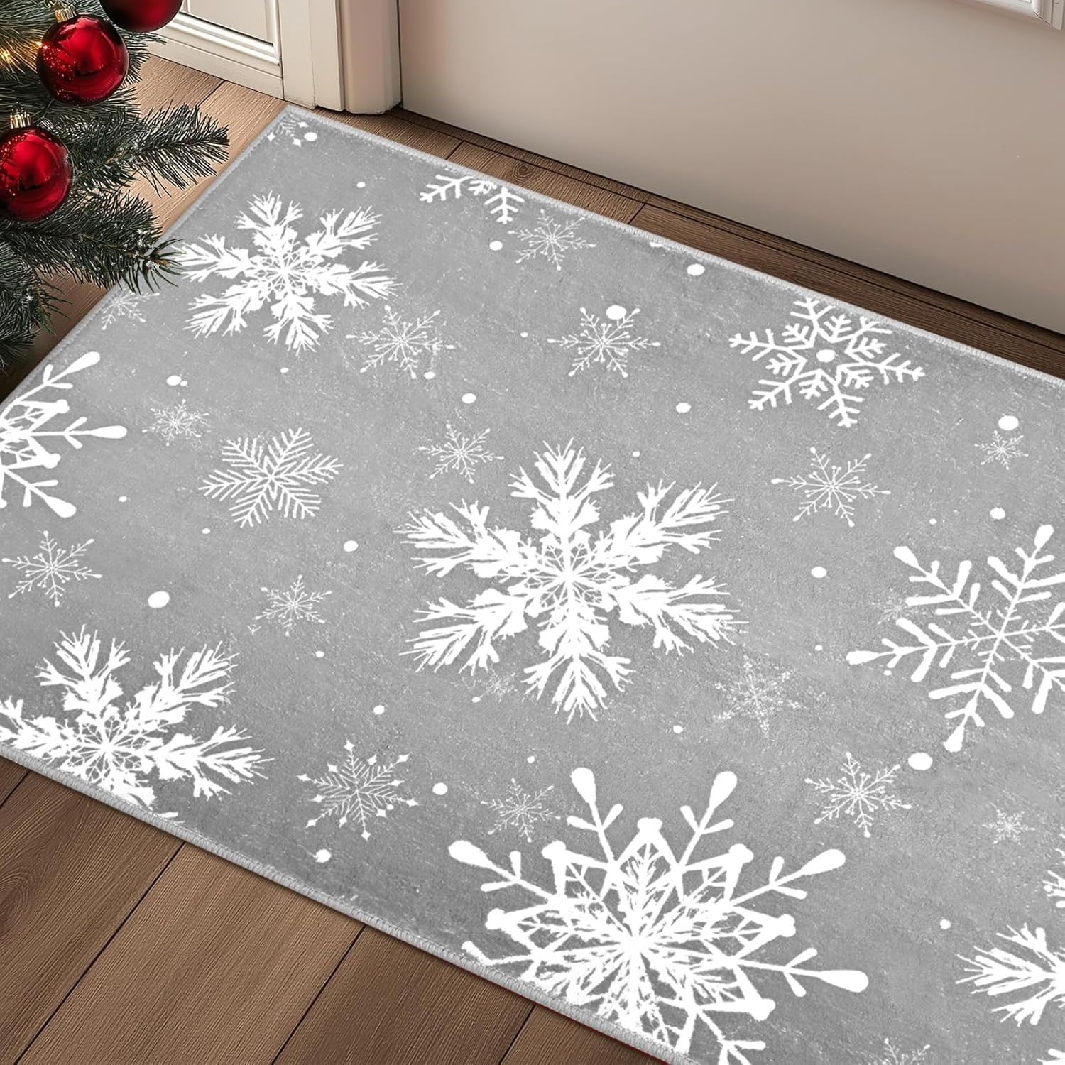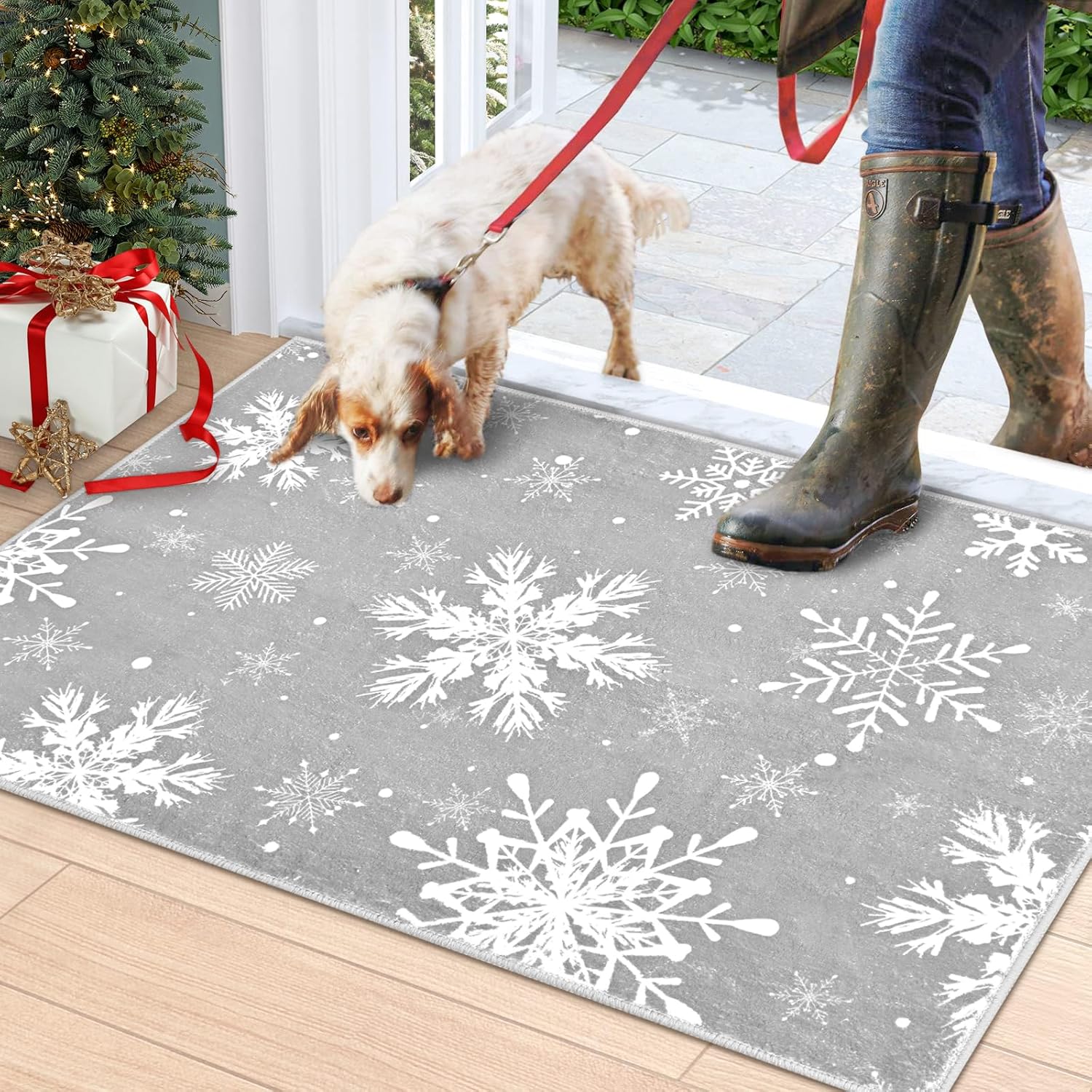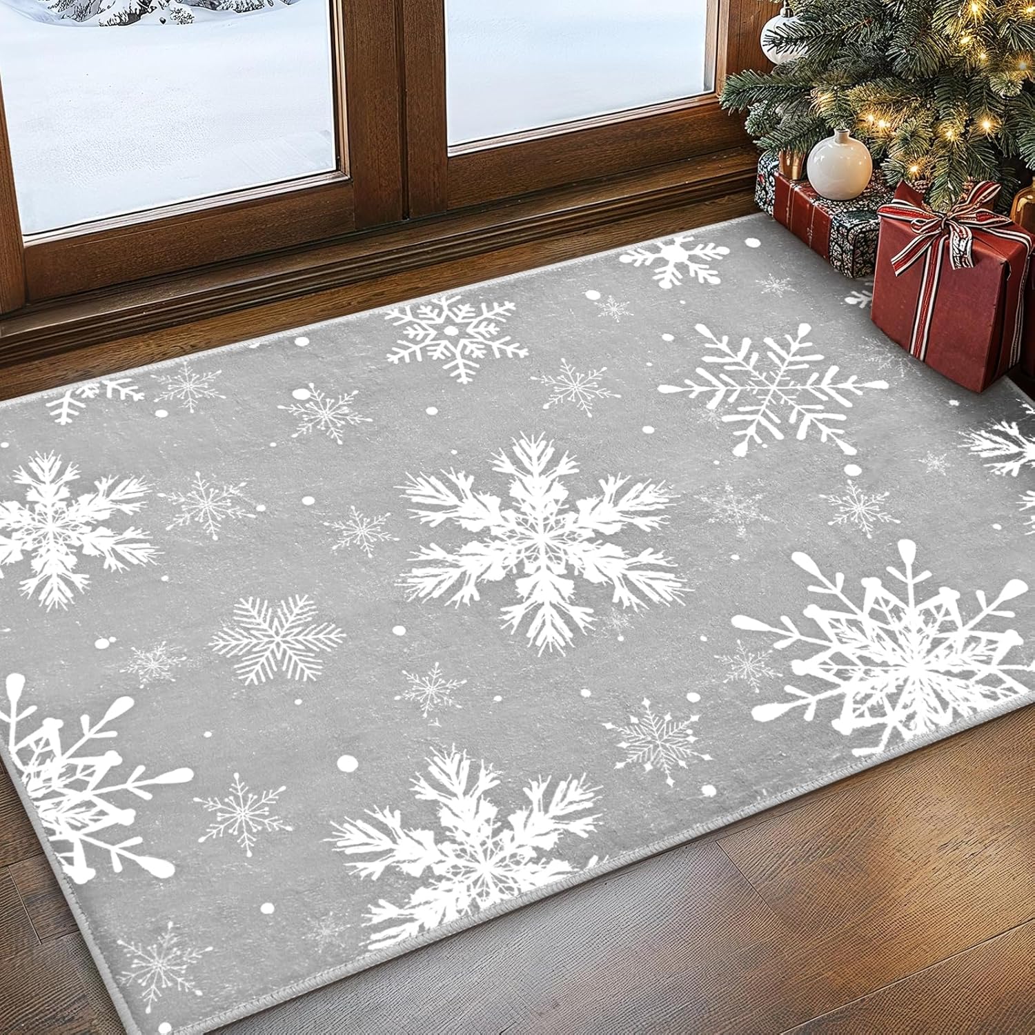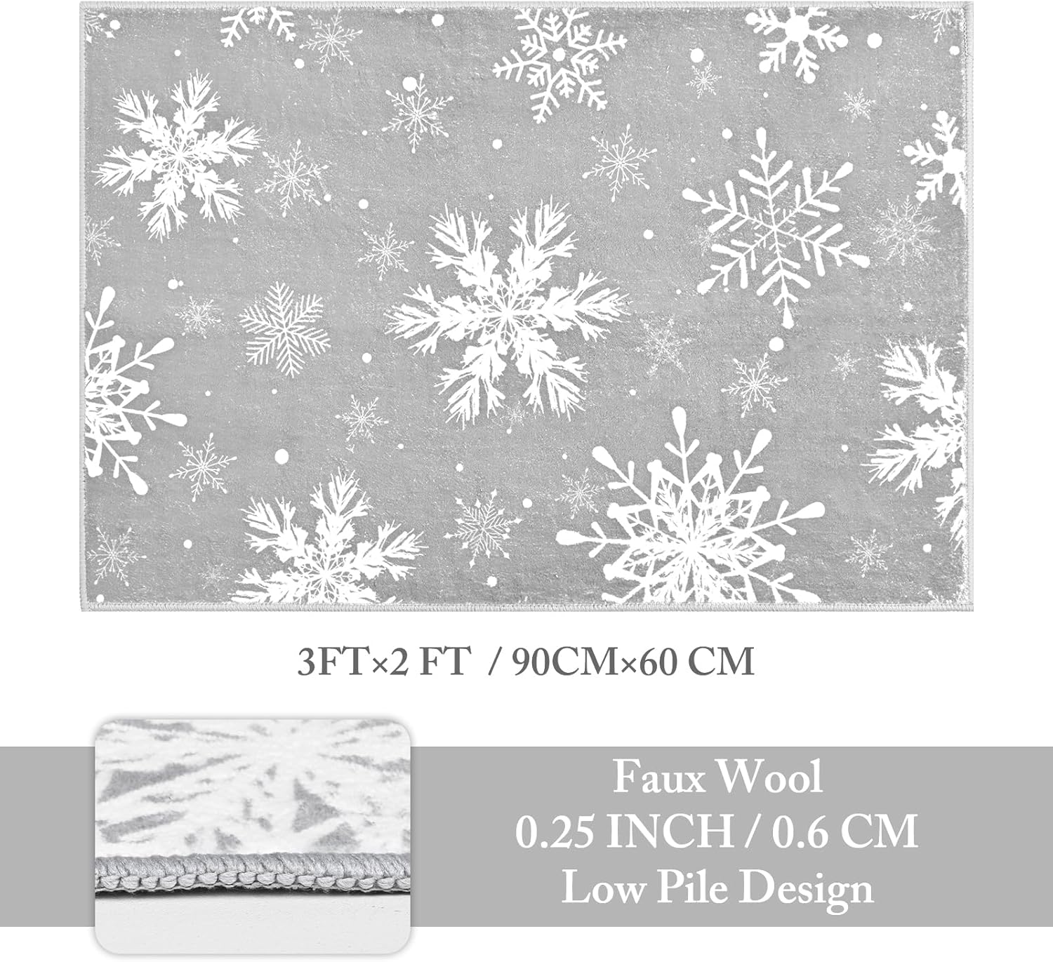 Alfombra de Navidad 2×3: el tapete de puerta de Navidad con color gris clásico, con diversos diseños de copos de nieve blancos, encantador y exquisito para hacer que tu hogar sea más navideño este invierno. Decoraciones navideñas perfectas