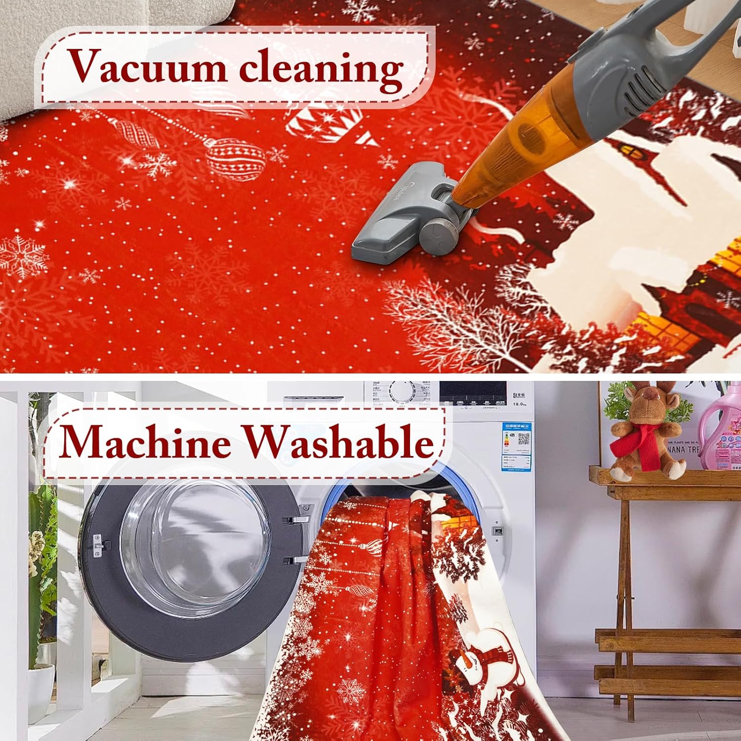 Alfombras lavables: los felpudos de Navidad exteriores se pueden lavar a máquina, aspirar, escoba o espolvorear. El mantenimiento diario es fácil y conveniente, el polvo y la suciedad en la superficie se pueden quitar fácilmente