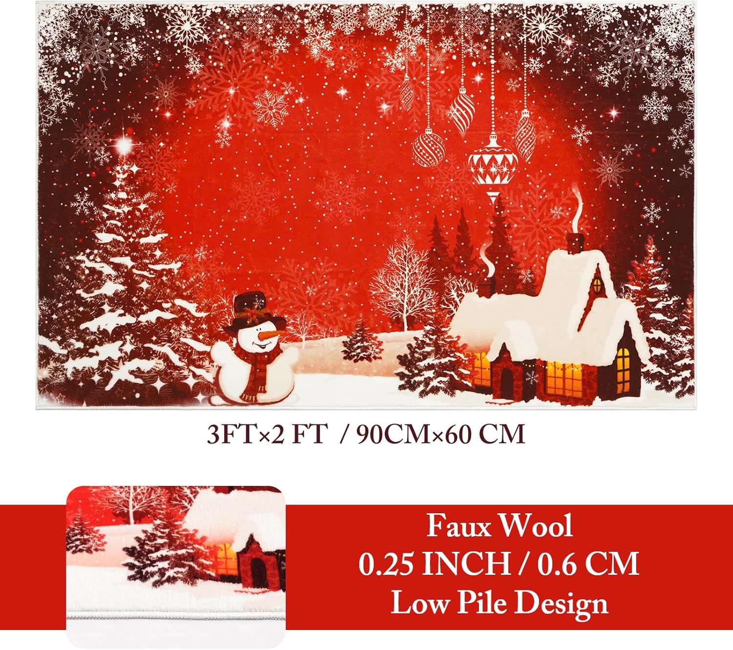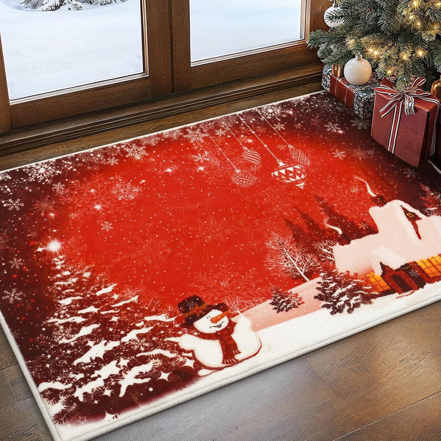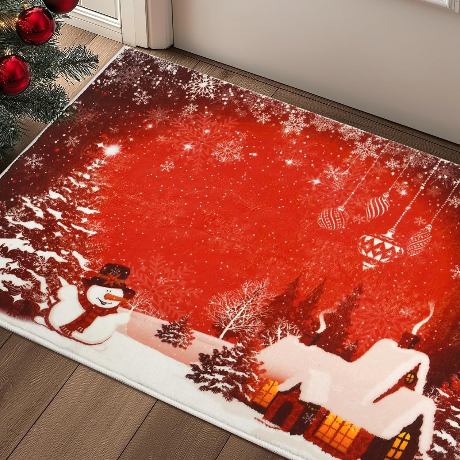 Alfombra de Navidad 2×3: el felpudo de Navidad está diseñado con patrones de copos de nieve, muñeco de nieve y árbol de Navidad, elementos clásicos temáticos navideños y vibrantes tonos festivos que se mezclan perfectamente con su hogar, decoraciones navideñas perfectas