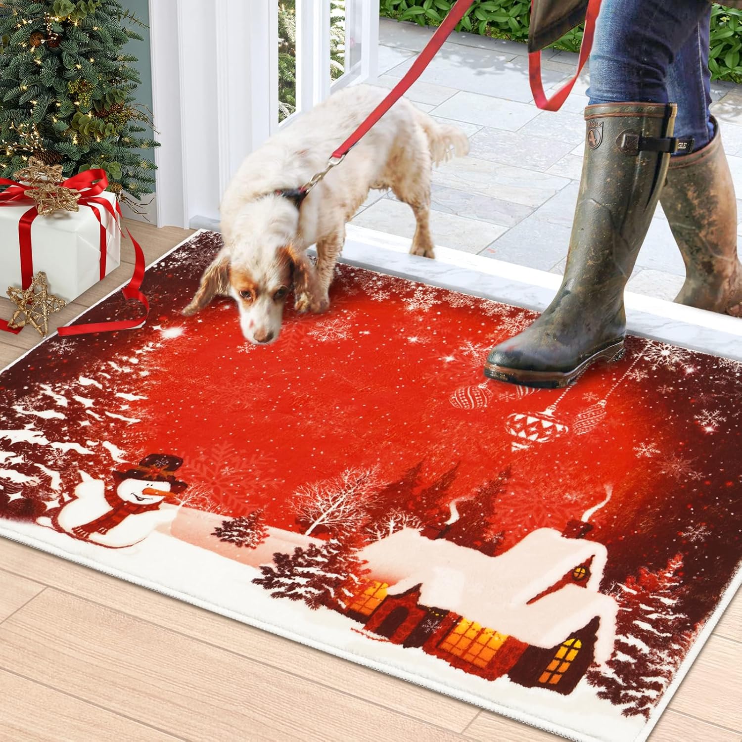 Alfombra de Navidad suave: nuestros tapetes de Navidad para puerta de entrada están hechos de lana sintética duradera y suave, proporcionando un tacto suave tanto para tus pies como para mascotas, creando un área relajante para los niños y tu familia