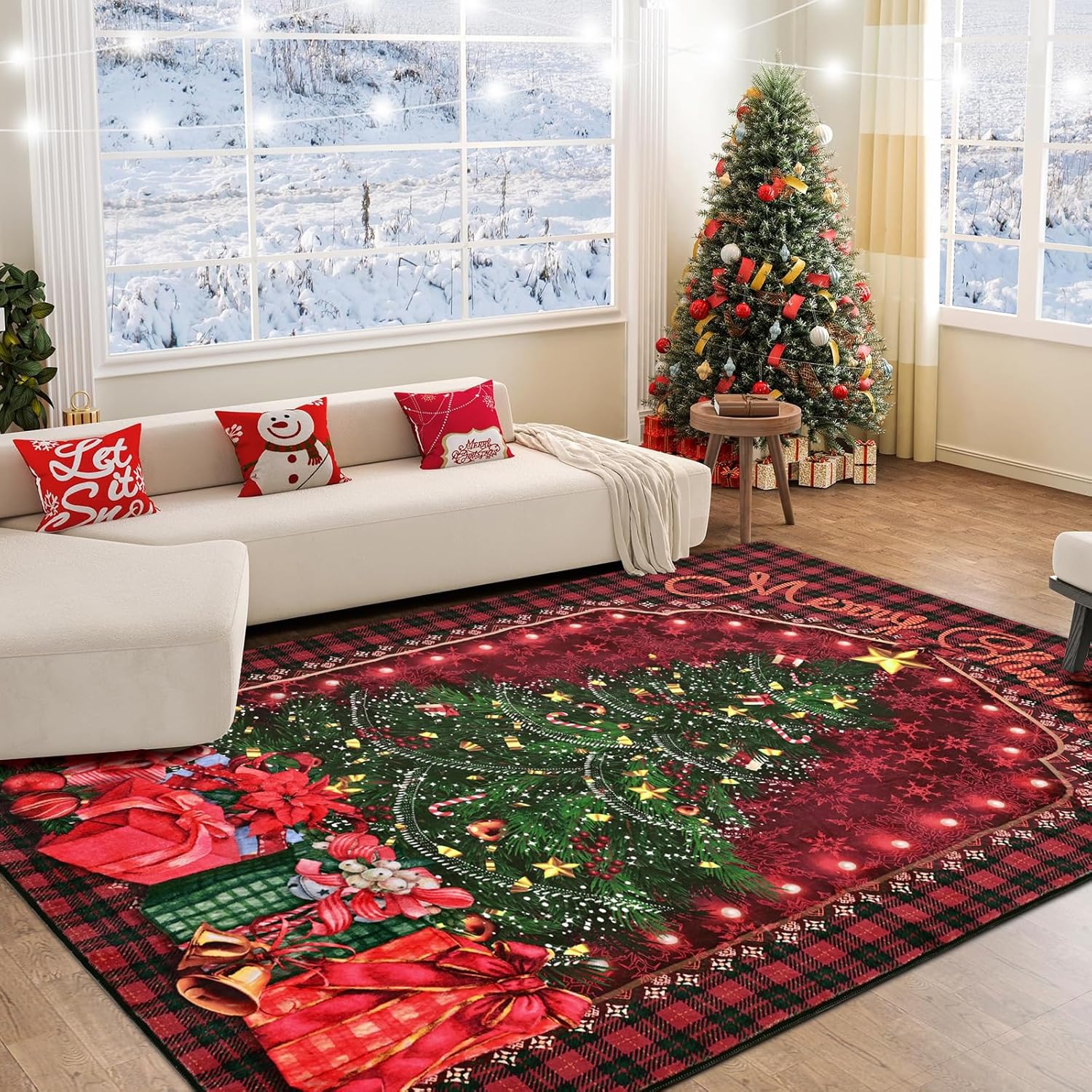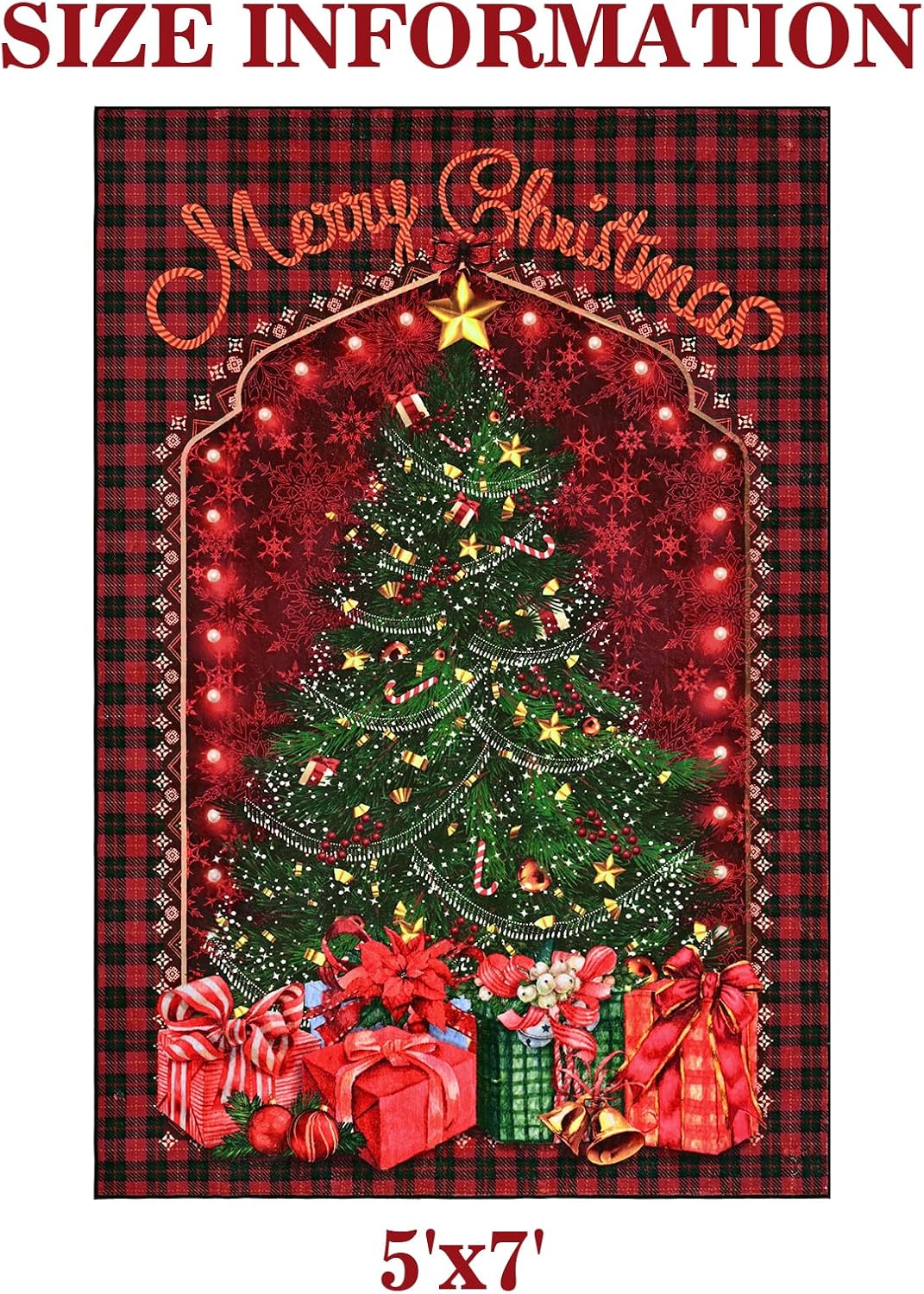 FRAMICS Alfombra de Navidad de 5 × 7, alfombra de árbol de Navidad, a cuadros rojos y negros, alfombra antideslizante lavable para interiores, alfombras de área de Navidad para dormitorio, sala de