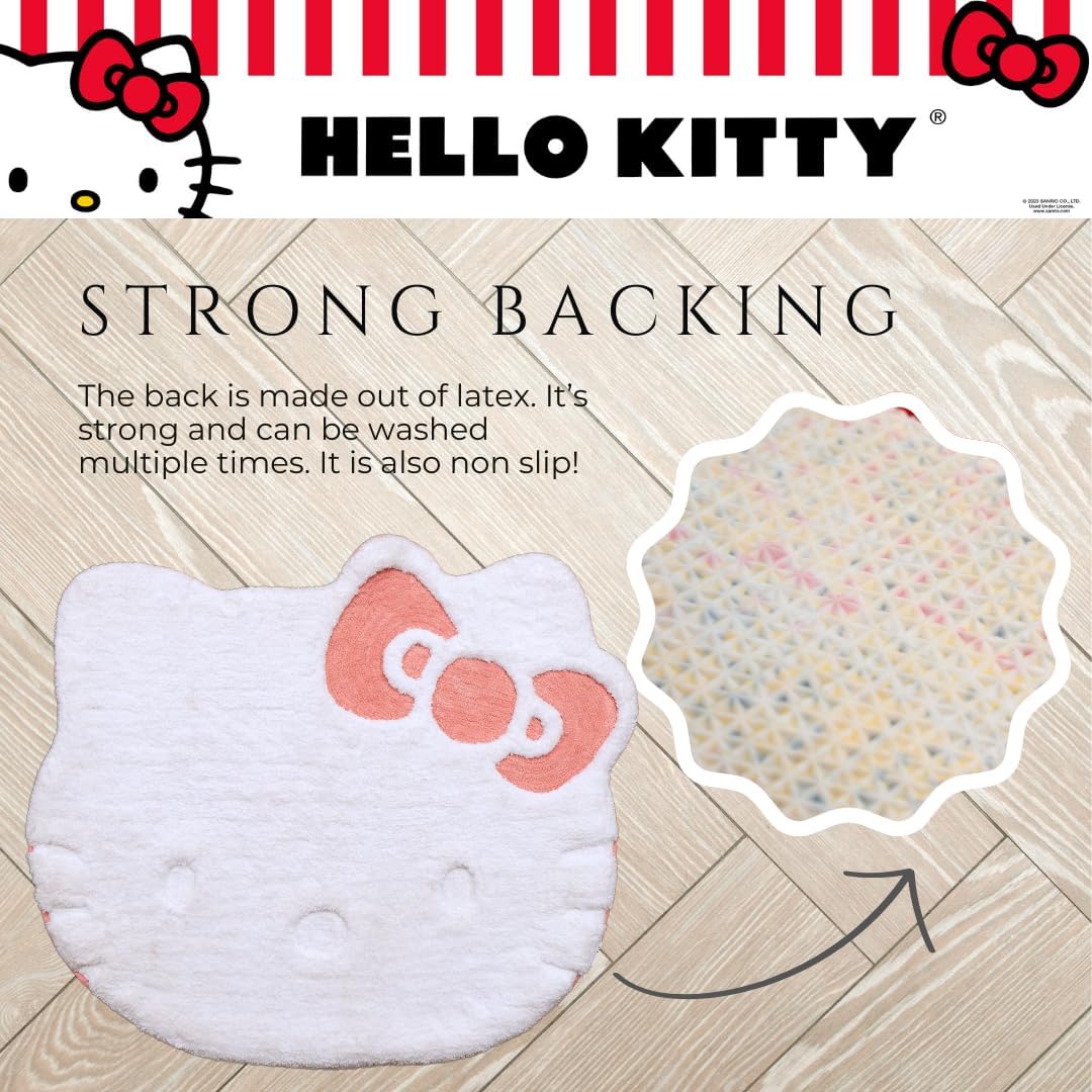 El artículo incluye: una alfombra de área con mechones “Lovin’ Kitty” de Hello Kitty que mide aproximadamente 34.75 x 30 (aprox. 76.2 cm), hecha de poliéster suave y duradero con un respaldo de látex.