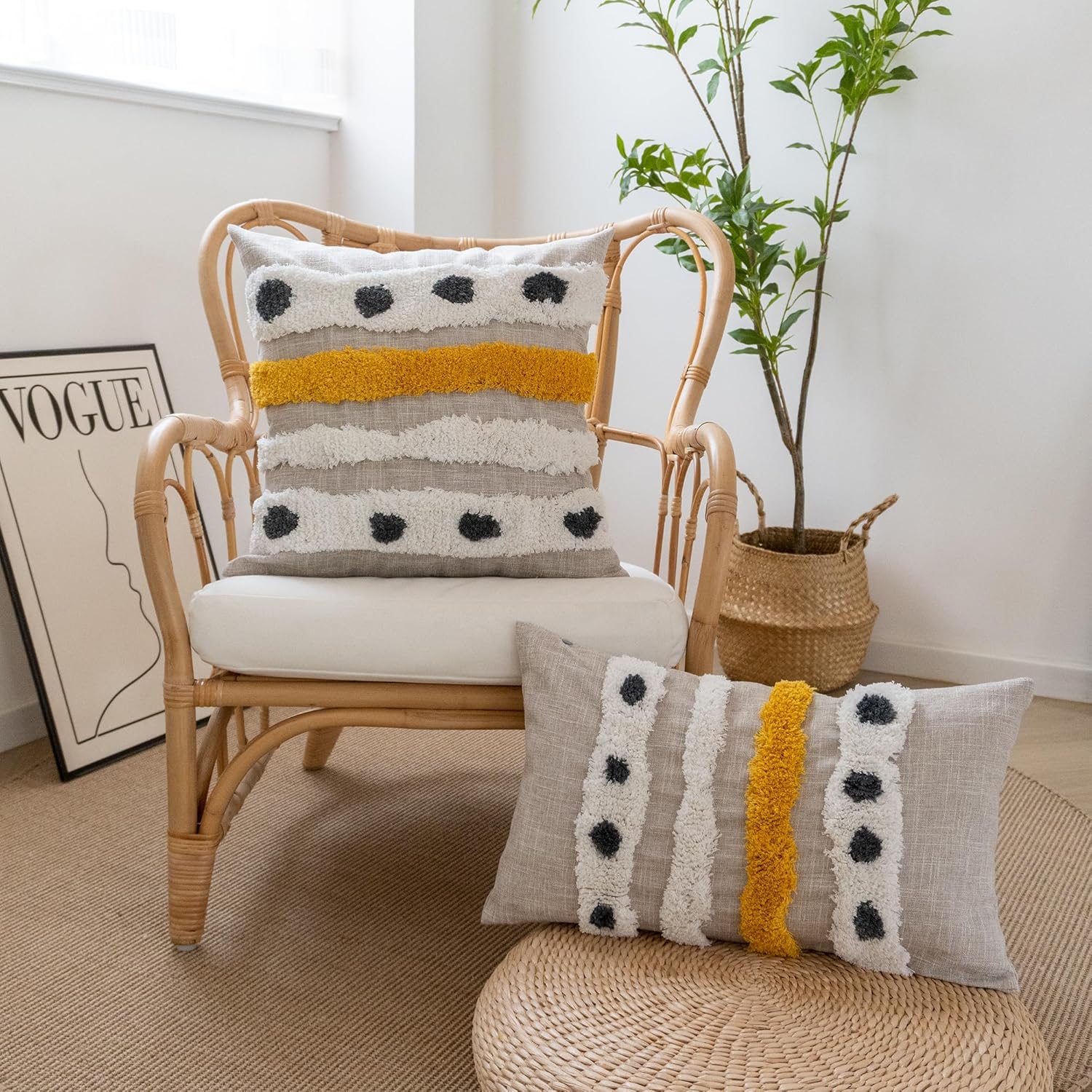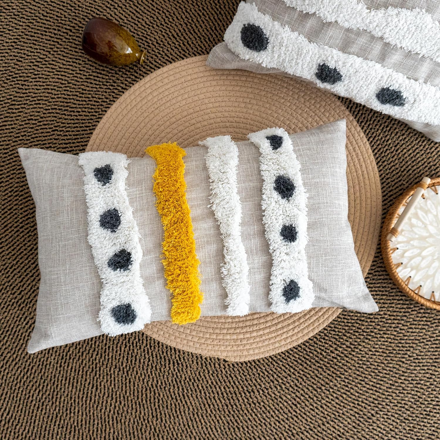 Funda de cojín lumbar bohemia copetuda con rayas tejidas a mano, funda de cojín decorativa simple de lino y algodón para sofá (1 unidad (beige amarillo, 12 x 20 pulgadas)