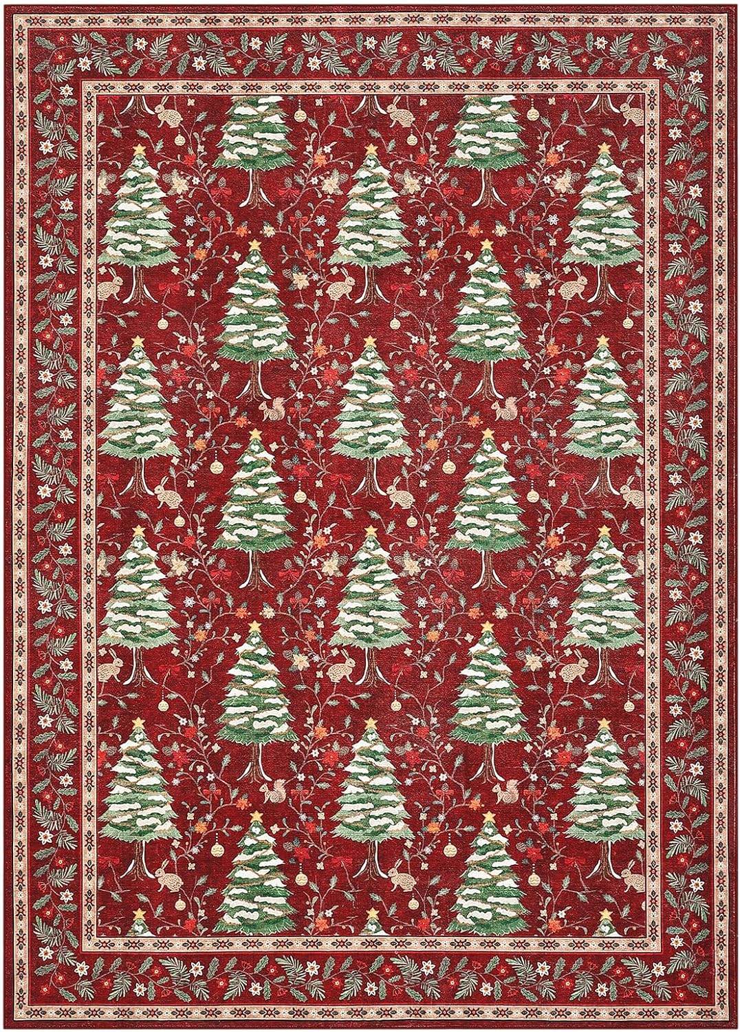 Este diseño caprichoso cuenta con un bosque nevado lleno de animales del bosque y pinos. Resistente al agua, a las manchas y lavable a máquina. Los colores de la alfombra pueden variar ligeramente según tu dispositivo y la iluminación de tu espacio.