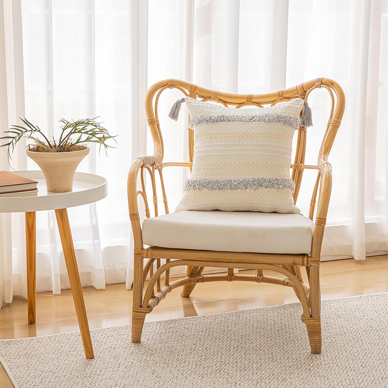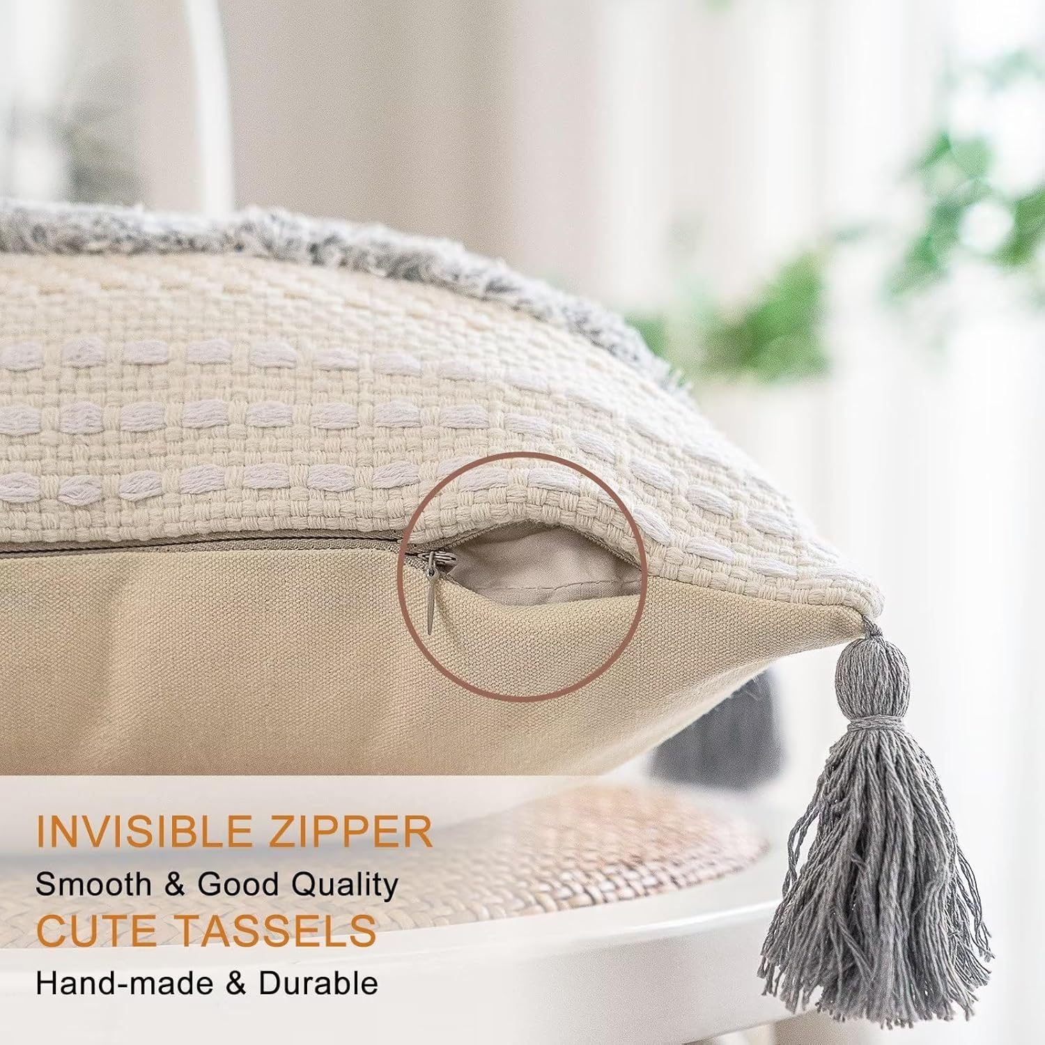Lujosa y duradera: funda de almohada con acento neutro para sofá, tiene diseños únicos y aspecto multitextura. Hay un patrón de cuerda tejida en el centro, así como los bordes exteriores. Entre esas zonas hay muy suave mechones con dos colores. Las esquinas están acentuadas con borlas hechas a mano, que son bonitas y no se caen fácilmente.