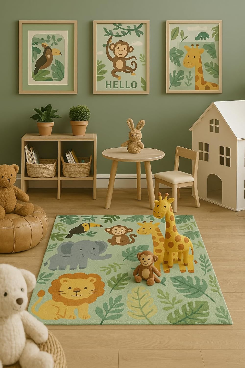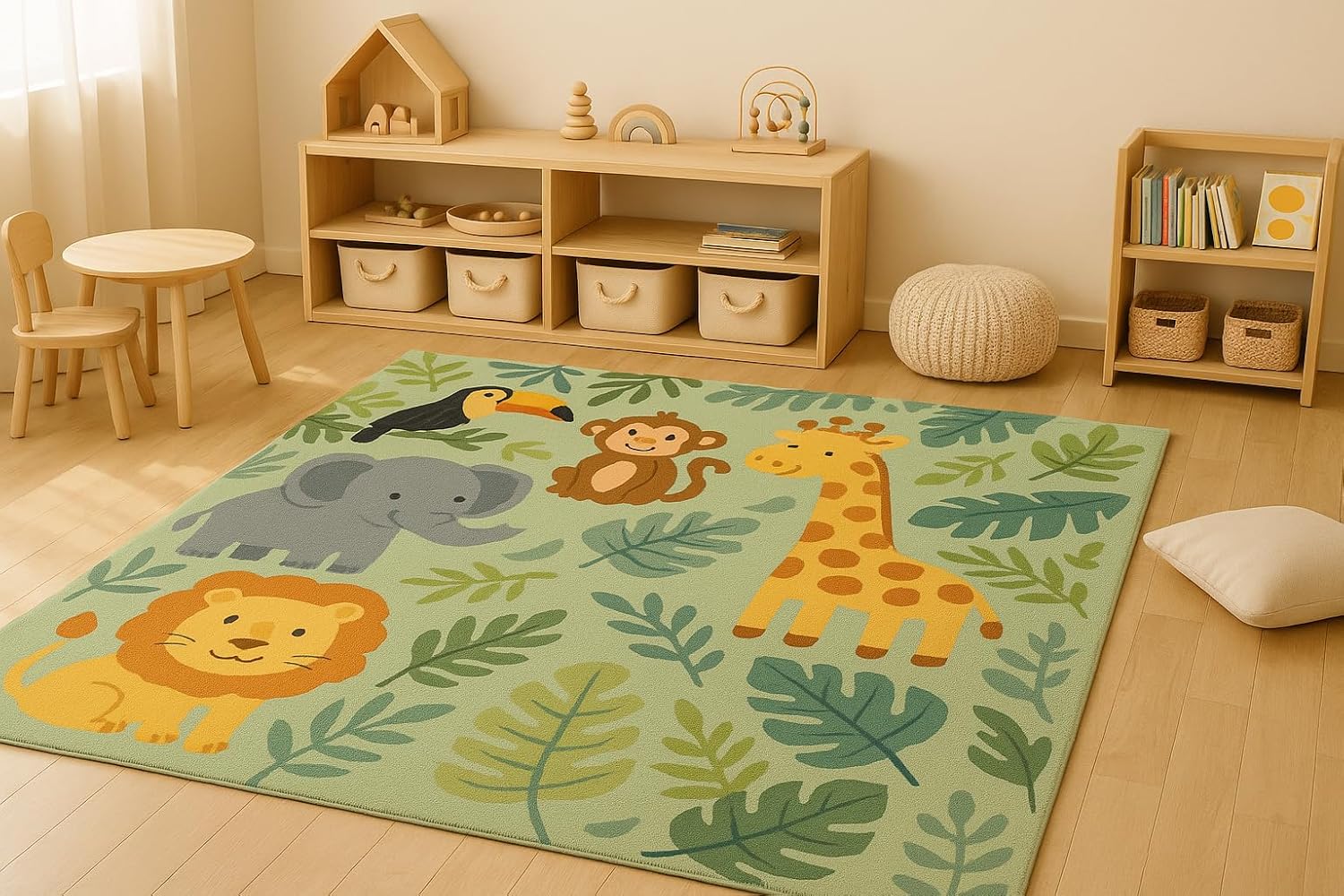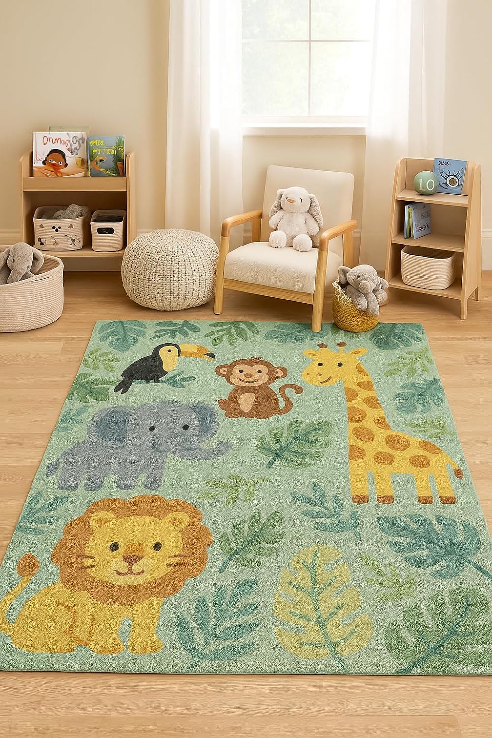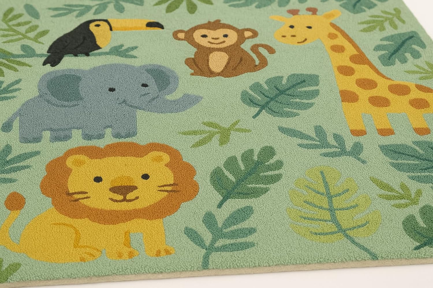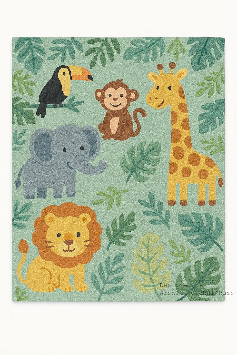 Jungle Safari Animal Kids Rug – Lion, Elephant, Giraffe, Monkey & Toucan Cartoon Play Mat – Soft Nursery & Bedroom Carpet – Durable Washable Rug – Custom (10×14 ft)