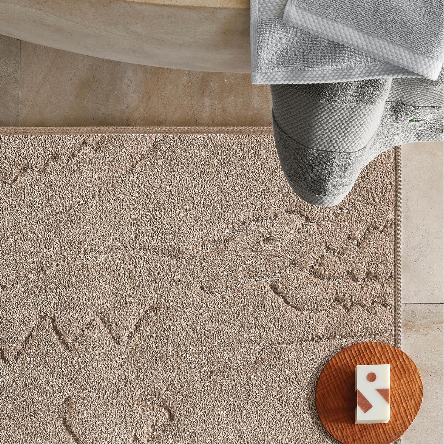 Diseño distintivo de LACOSTE. El clásico cocodrilo Lacoste está grabado en el tejido. Con una paleta completa de colores sólidos brillantes y terrosos, esta alfombra combina con cualquier configuración de baño.