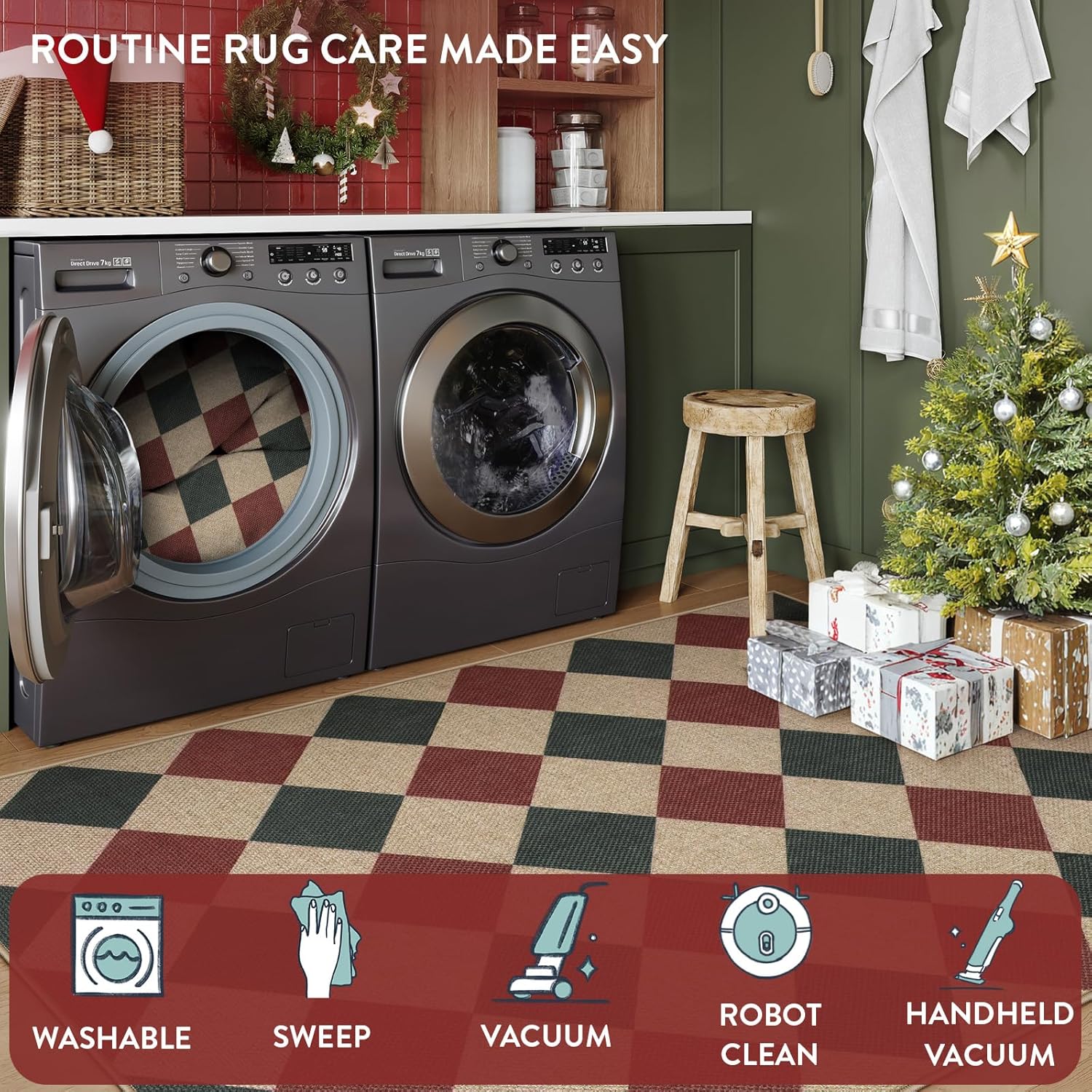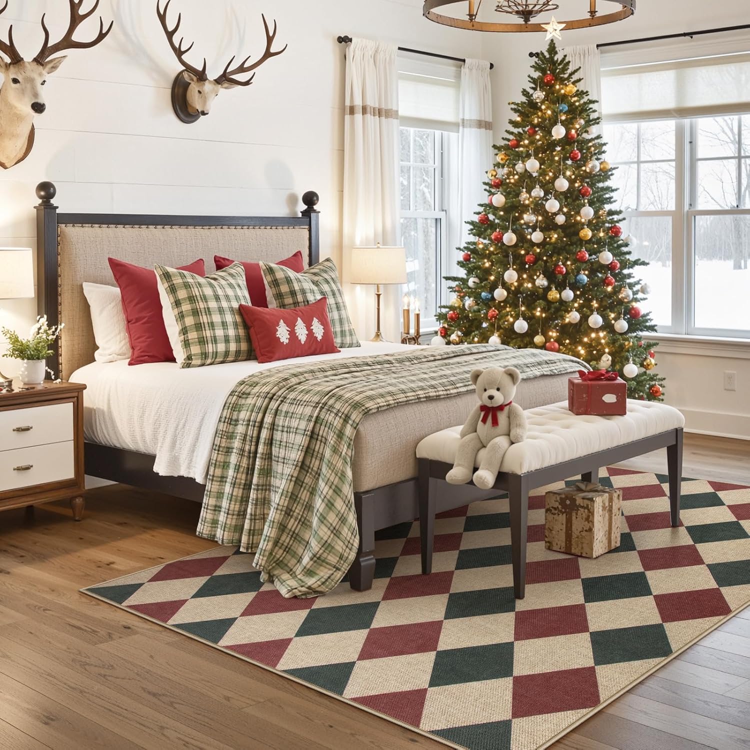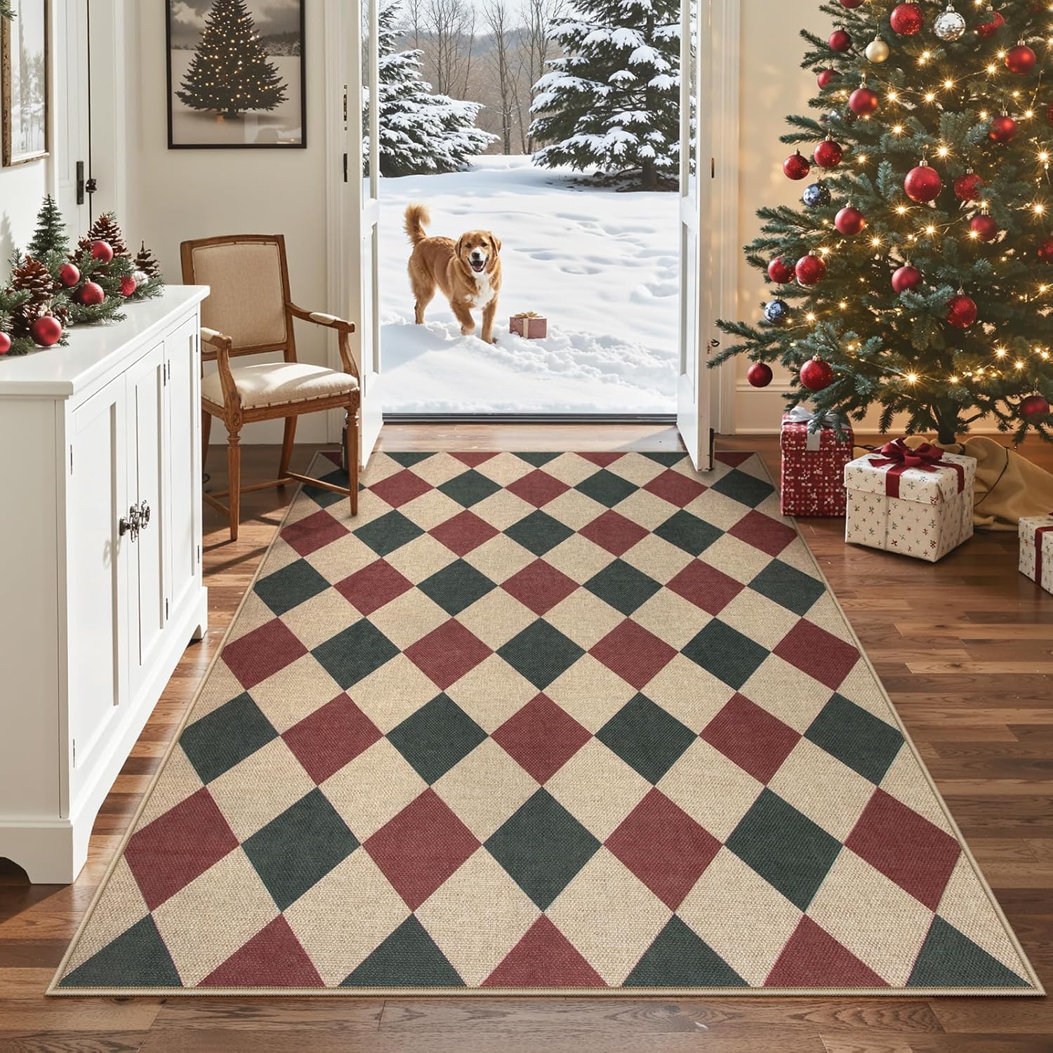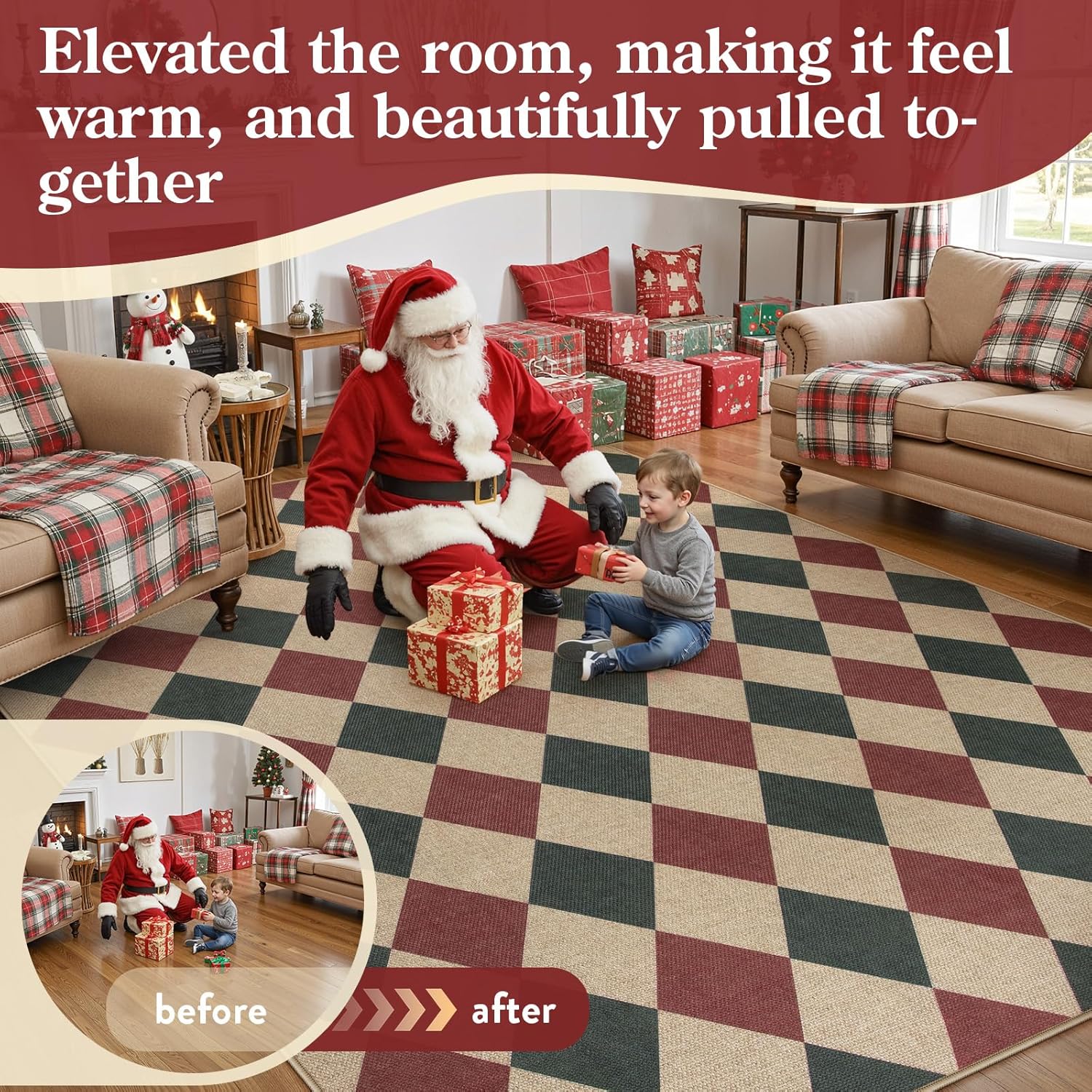 Festive Checkerboard Rug: Embrace retro holiday charm with a classic red-and-green checkerboard pattern. This timeless design pairs perfectly with vintage-style Christmas decorations, Christmas trees, and traditional porch displays for an instantly nostalgic seasonal indoor outdoor.