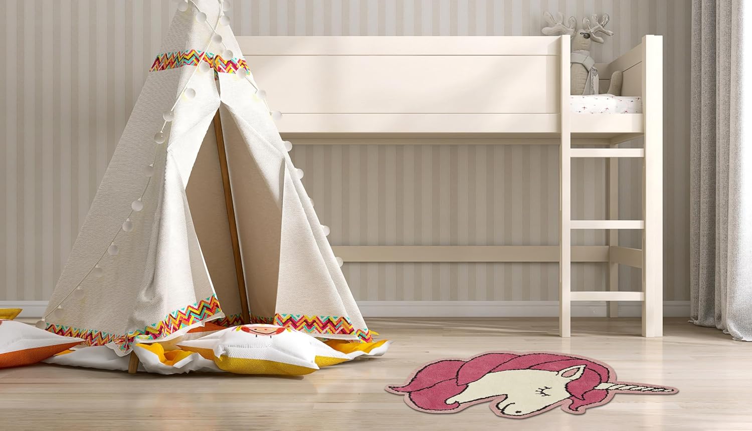 Una alfombra de unicornio con forma es un divertido giro caprichoso para un espacio juvenil