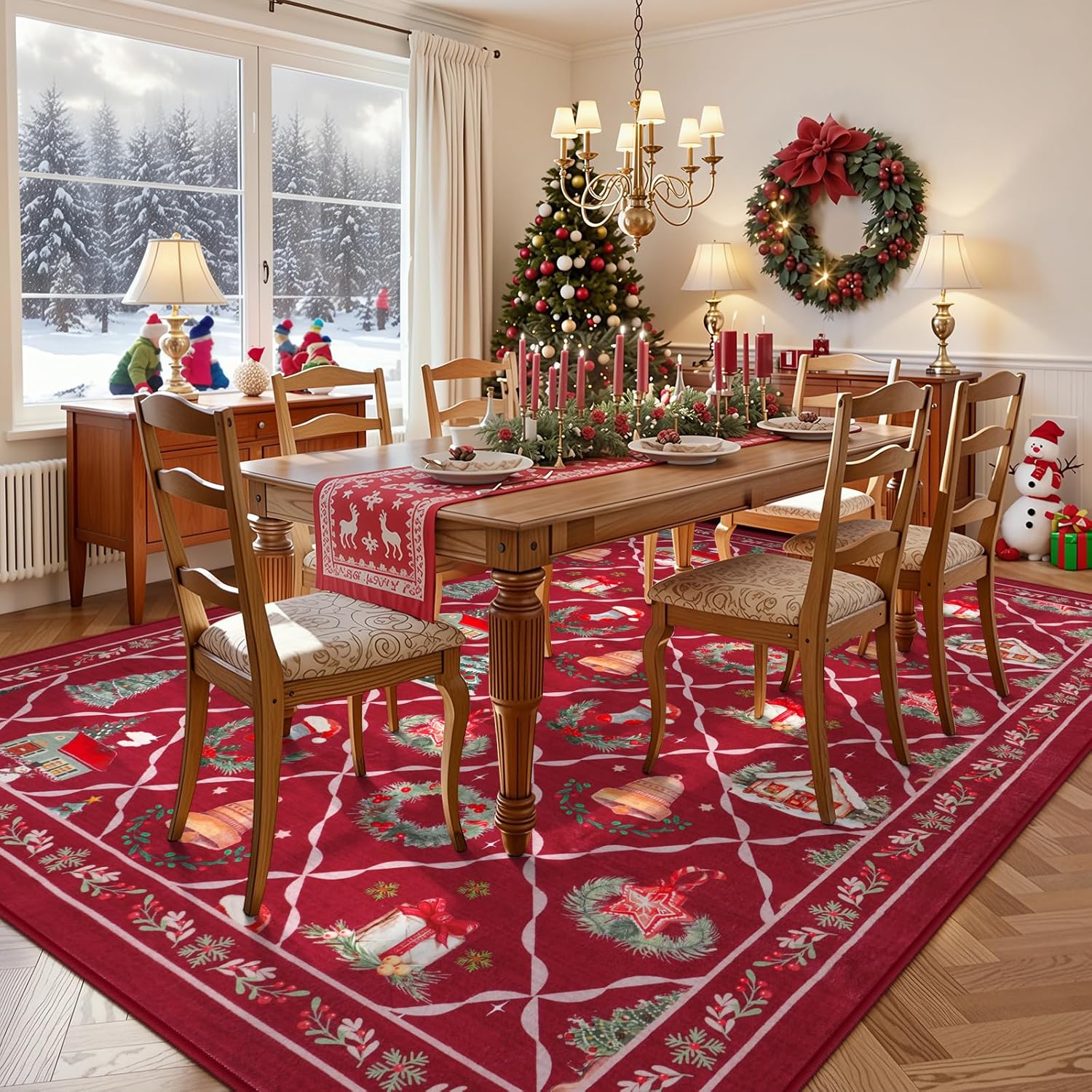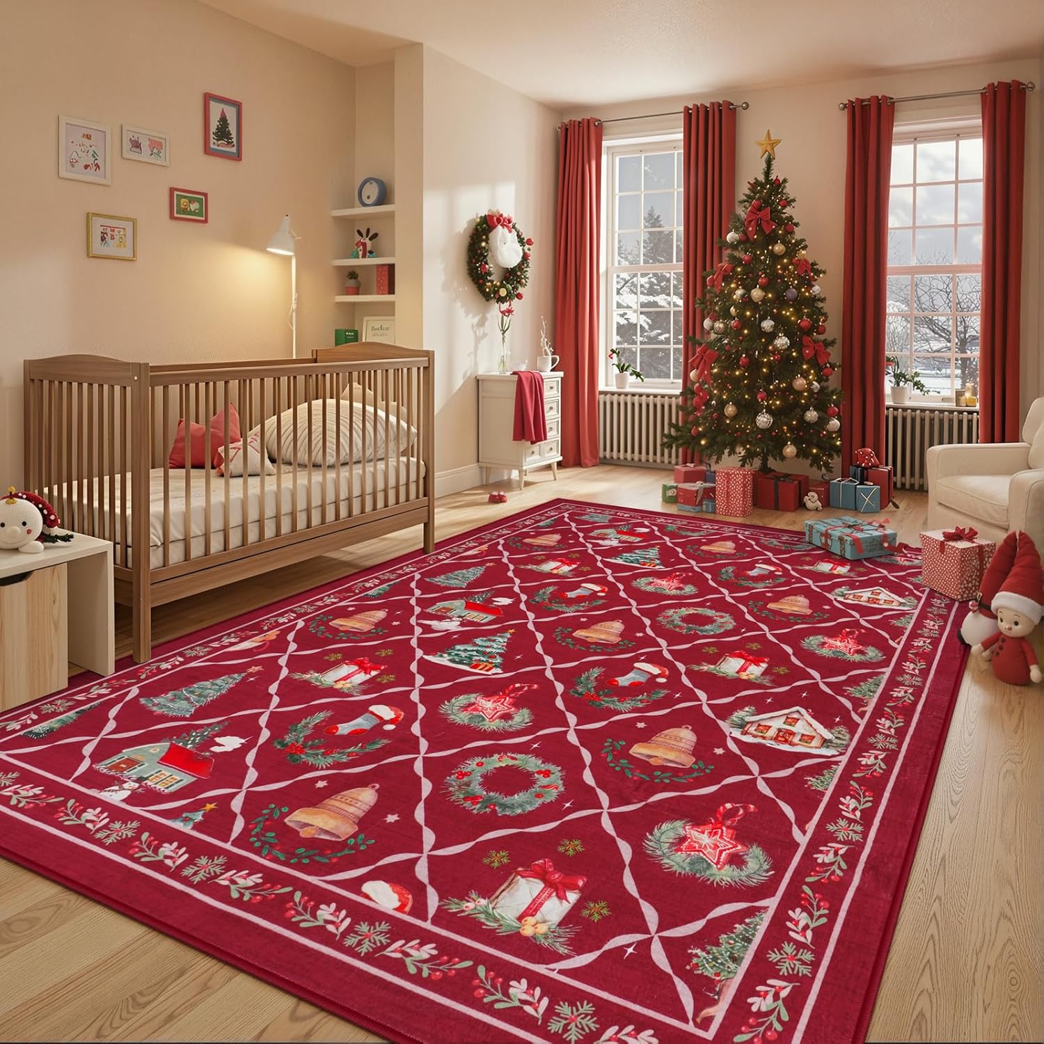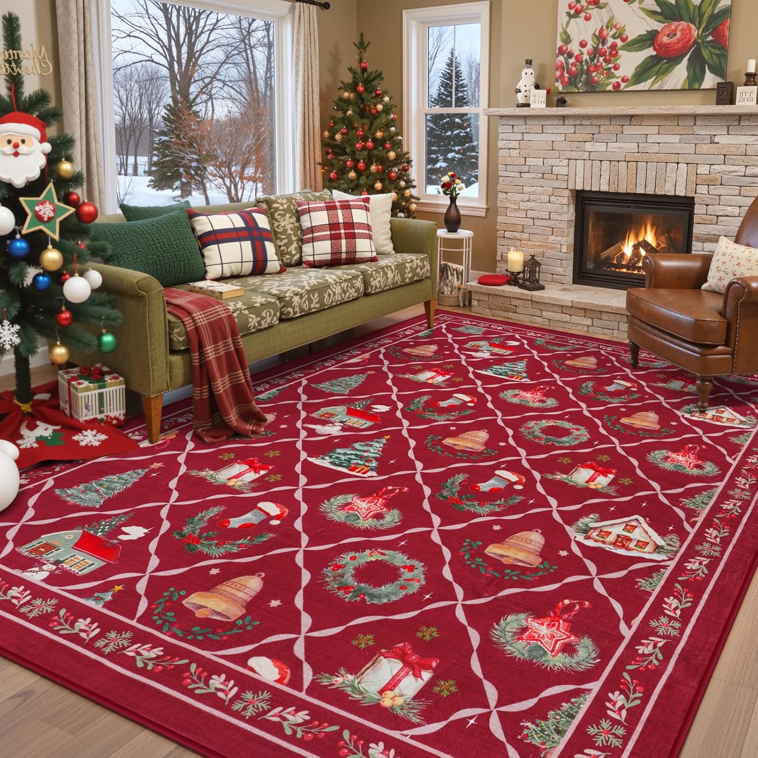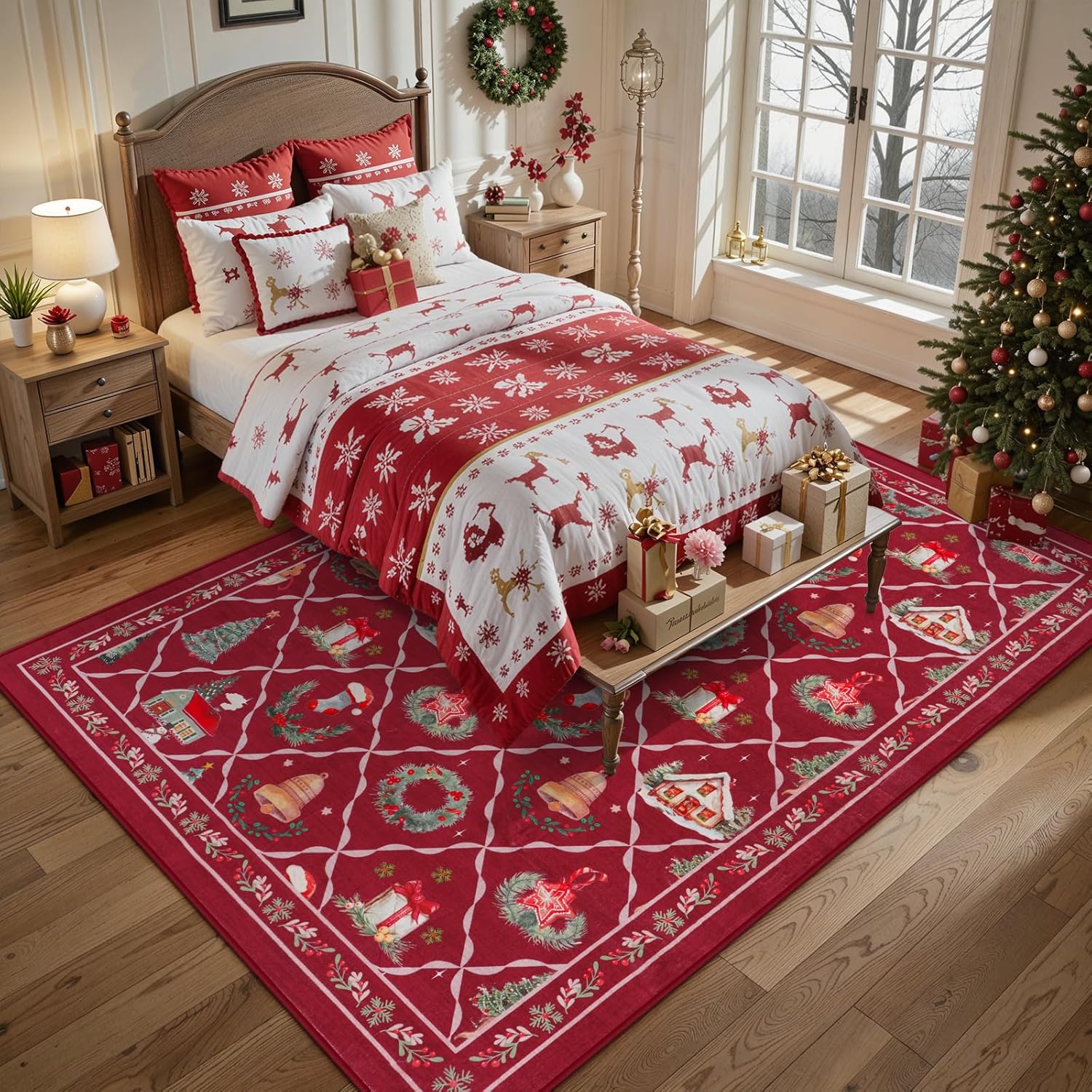 [Encanto festivo]: esta alfombra de Navidad muestra motivos navideños clásicos (coronas, bastones de caramelo, cabañas y árboles) bellamente dispuestos en un diseño de celosía. Su aspecto acogedor y alegre aporta calidez y espíritu estacional a cualquier hogar.