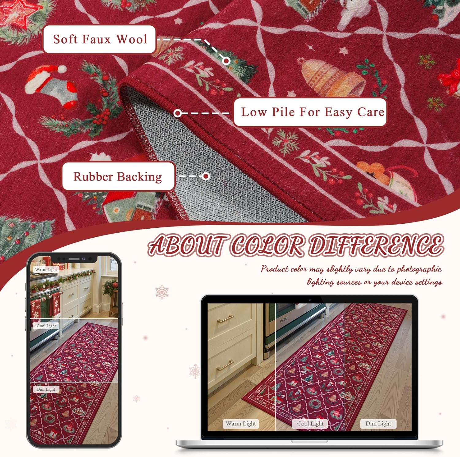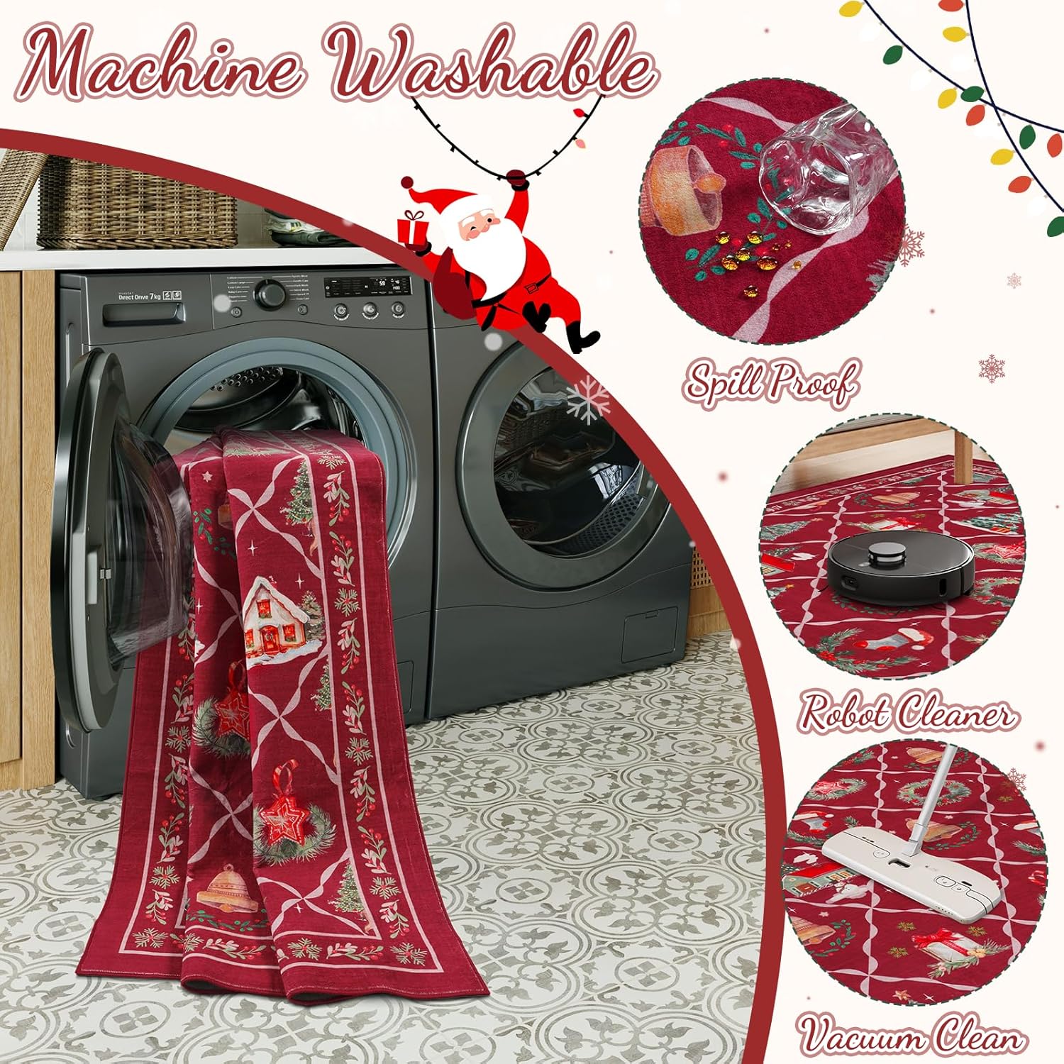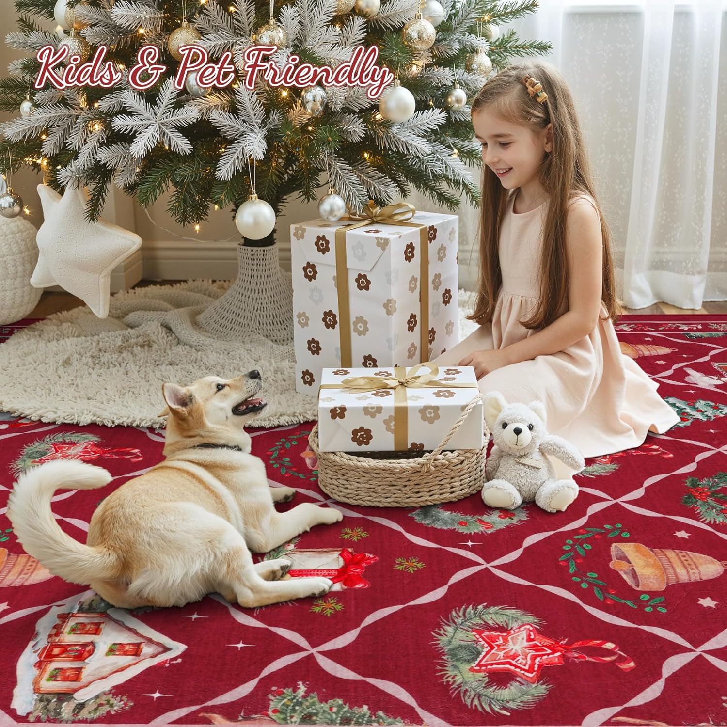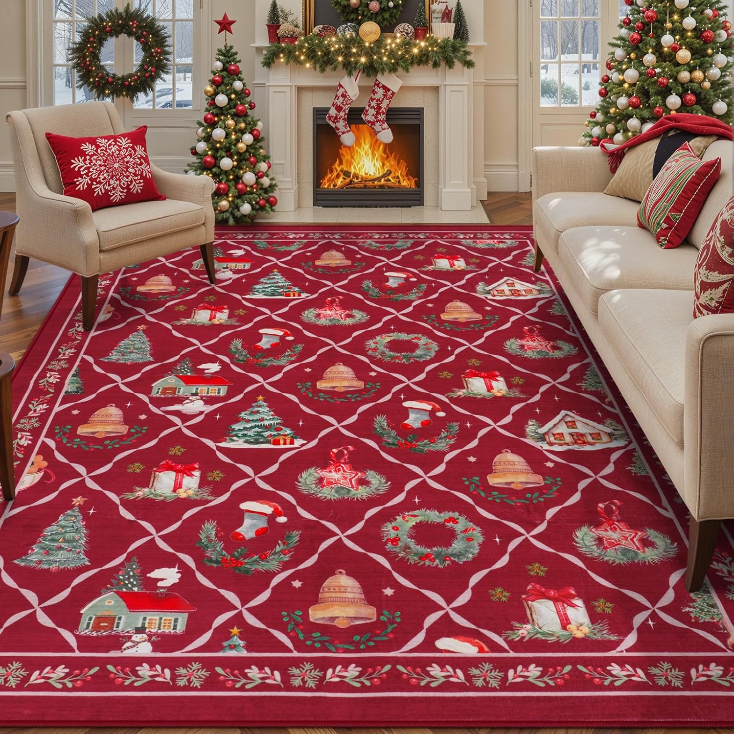 [Encanto festivo]: esta alfombra de Navidad muestra motivos navideños clásicos (coronas, bastones de caramelo, cabañas y árboles) bellamente dispuestos en un diseño de celosía. Su aspecto acogedor y alegre aporta calidez y espíritu estacional a cualquier hogar.