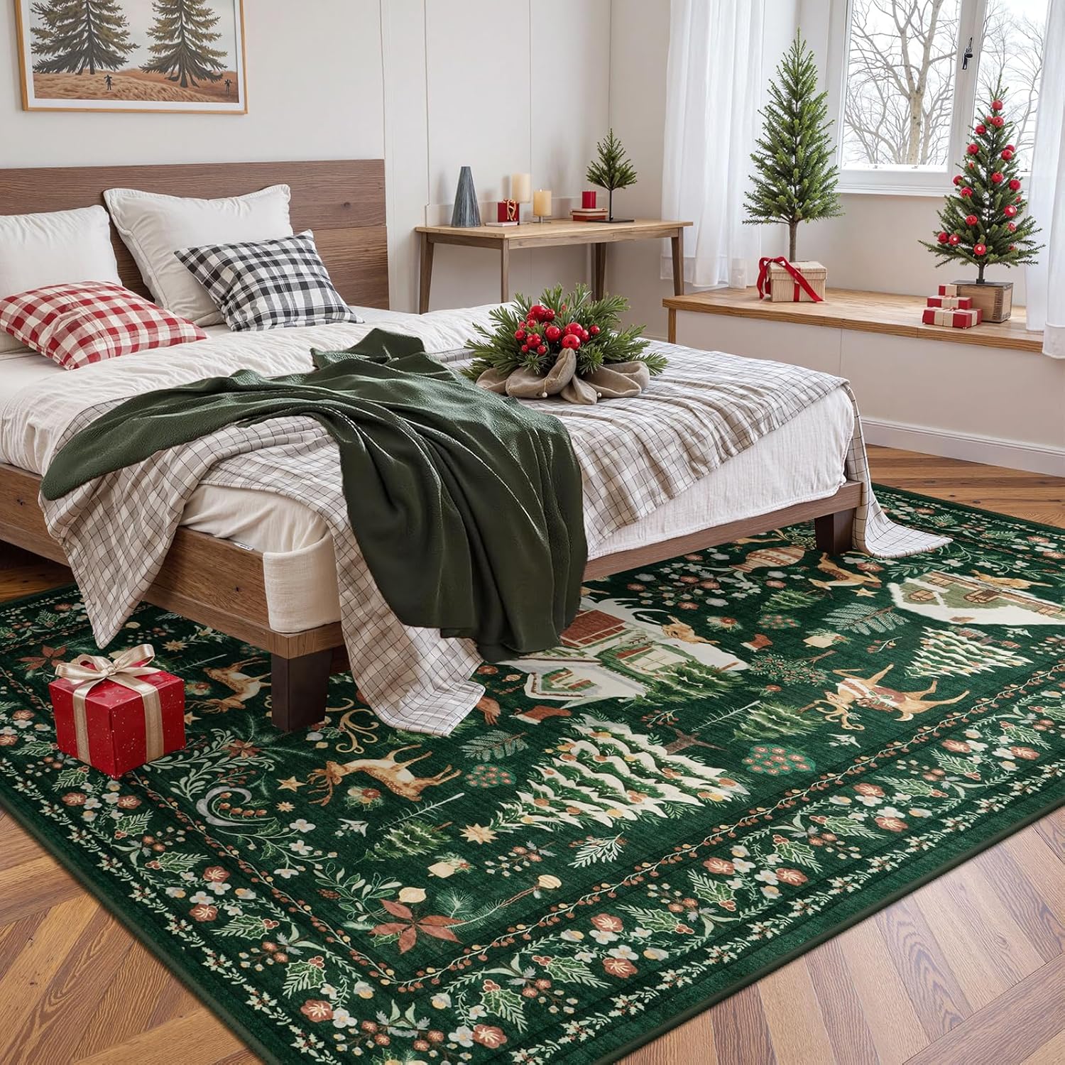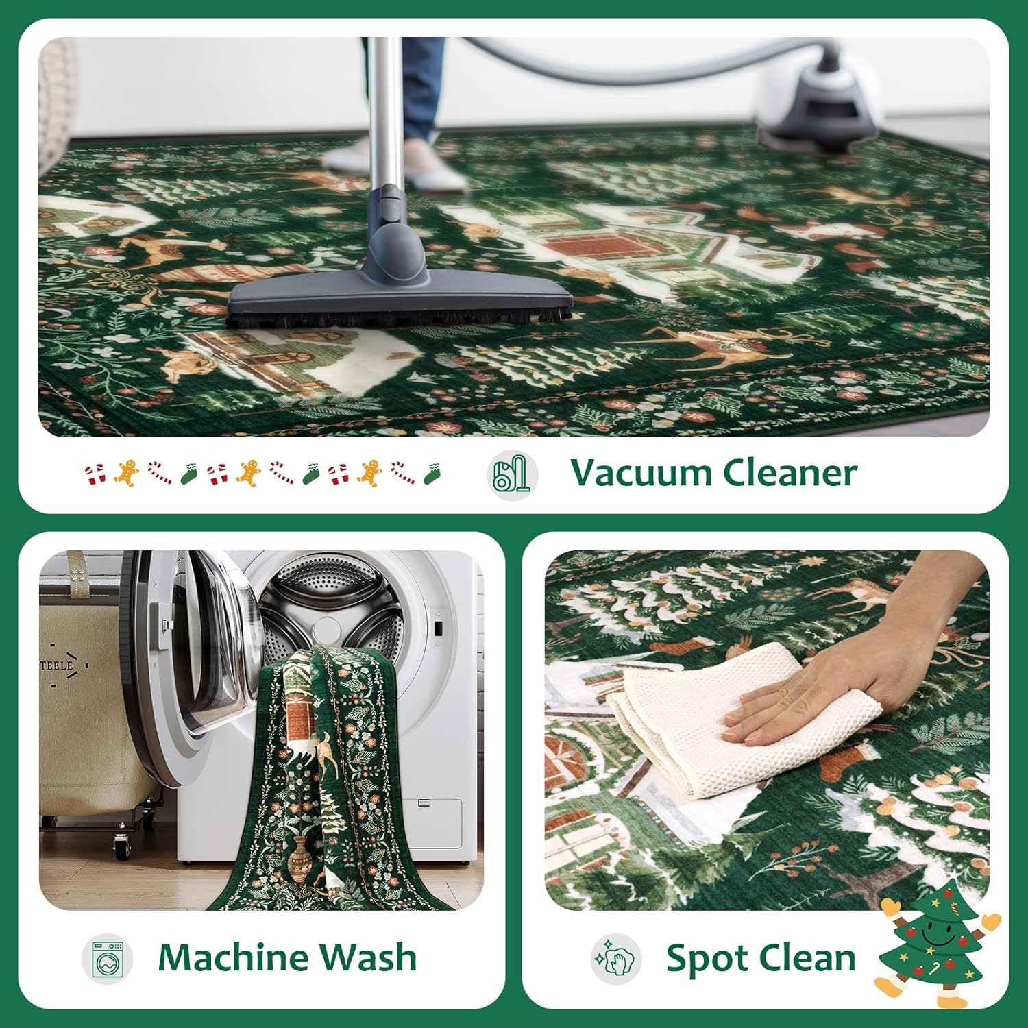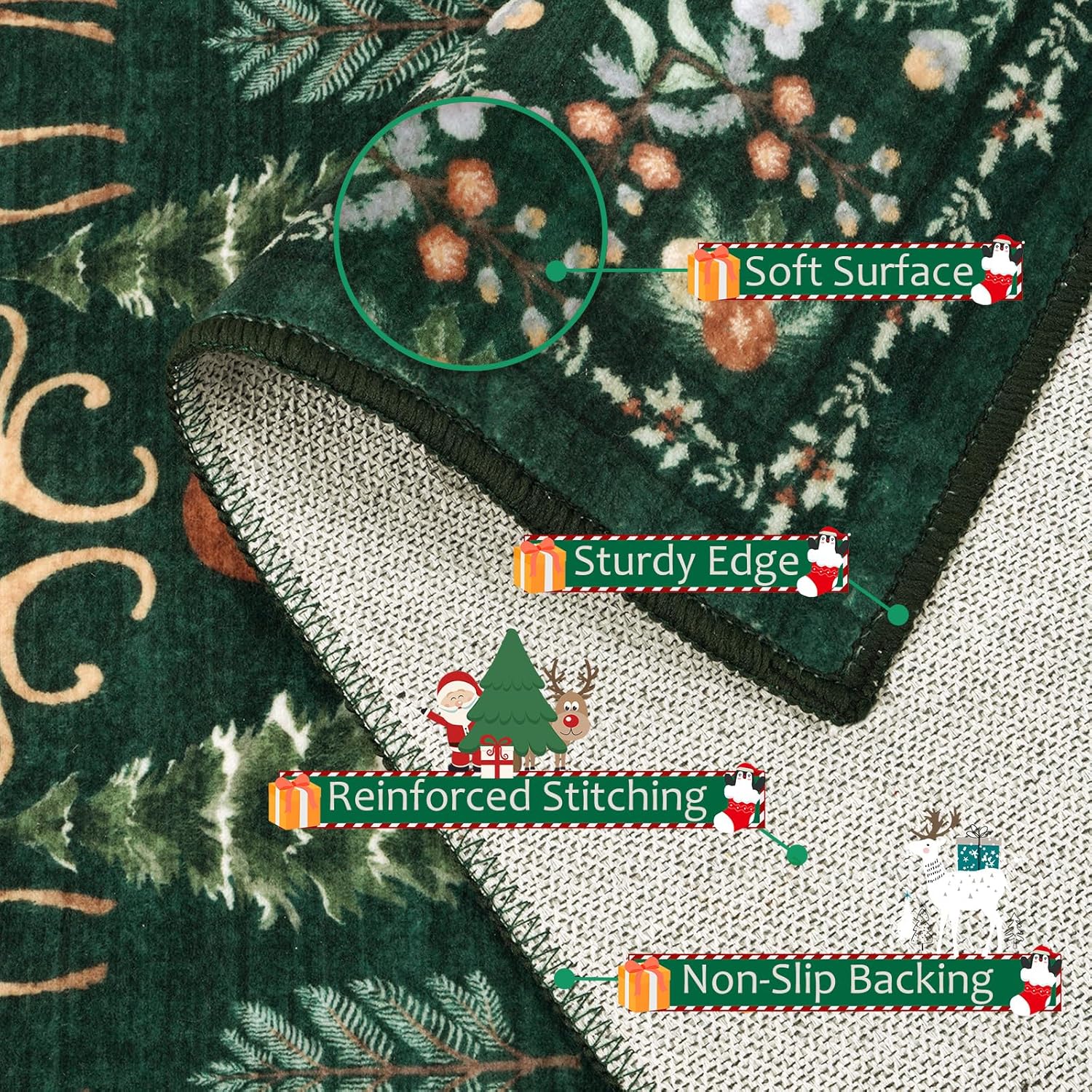 Diseño navideño festivo: esta alfombra combina el encanto bohemio con tonos verdes vintage, adornado con Papá Noel juguetón, reno y un motivo de árbol de Navidad bellamente decorado. Es perfecto para crear un ambiente alegre y festivo que da vida al espíritu navideño de una manera personalizada y acogedora