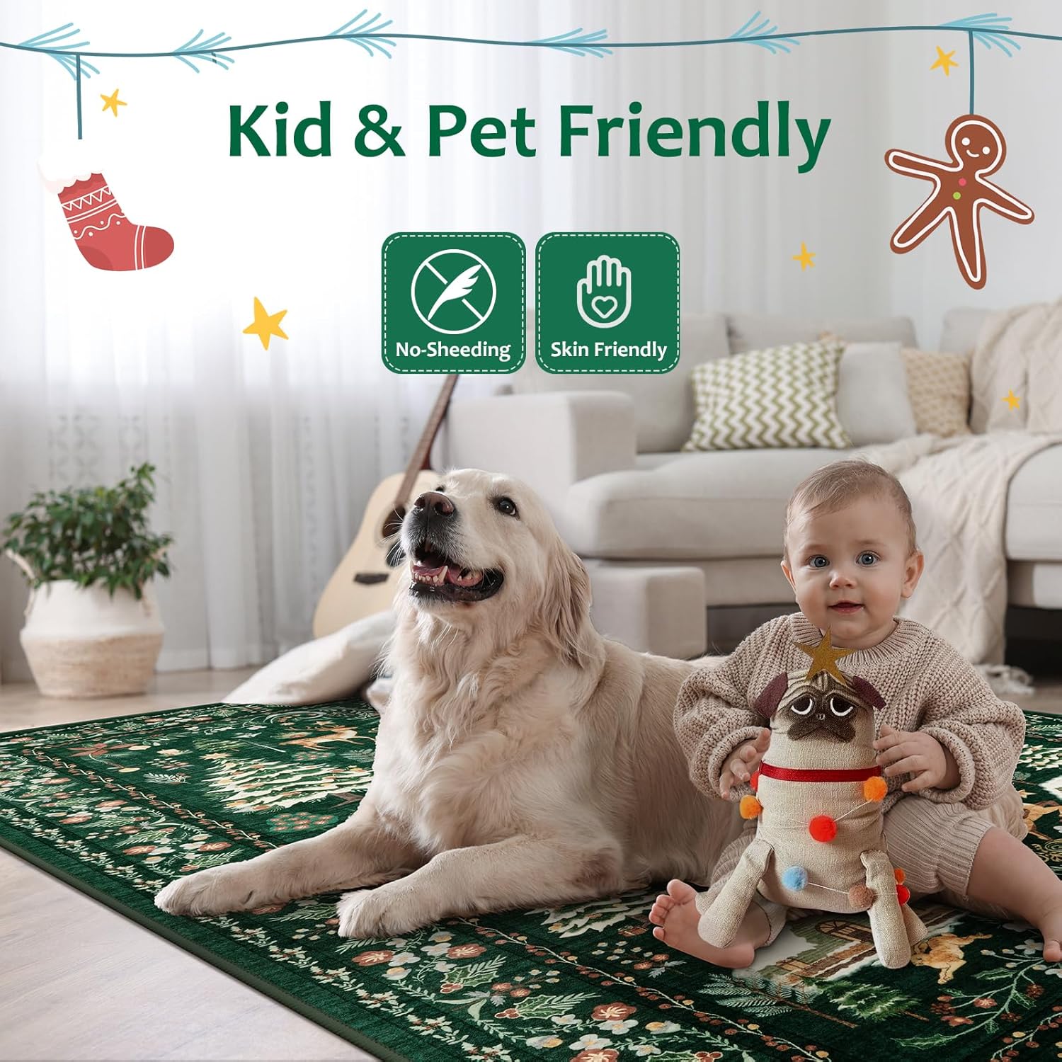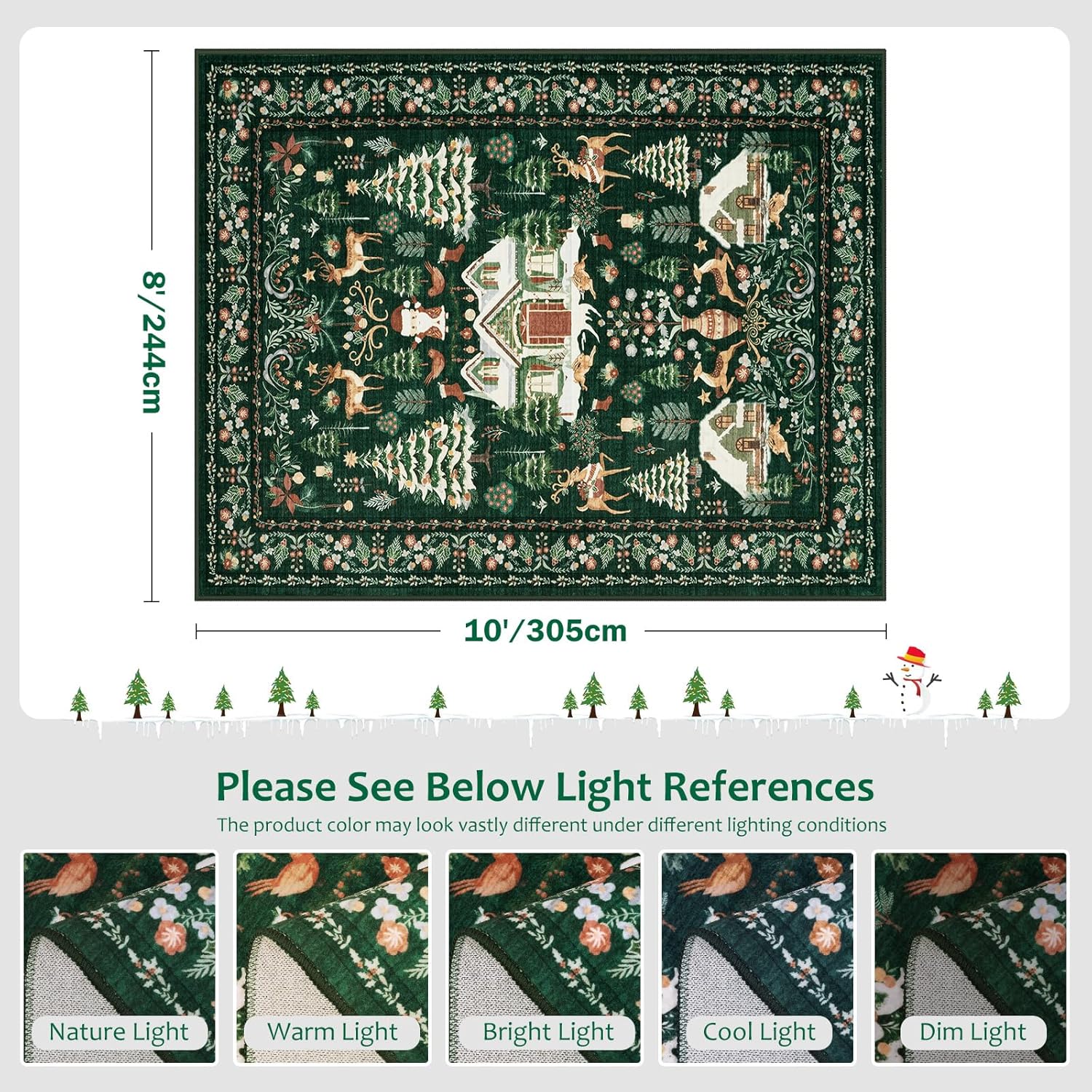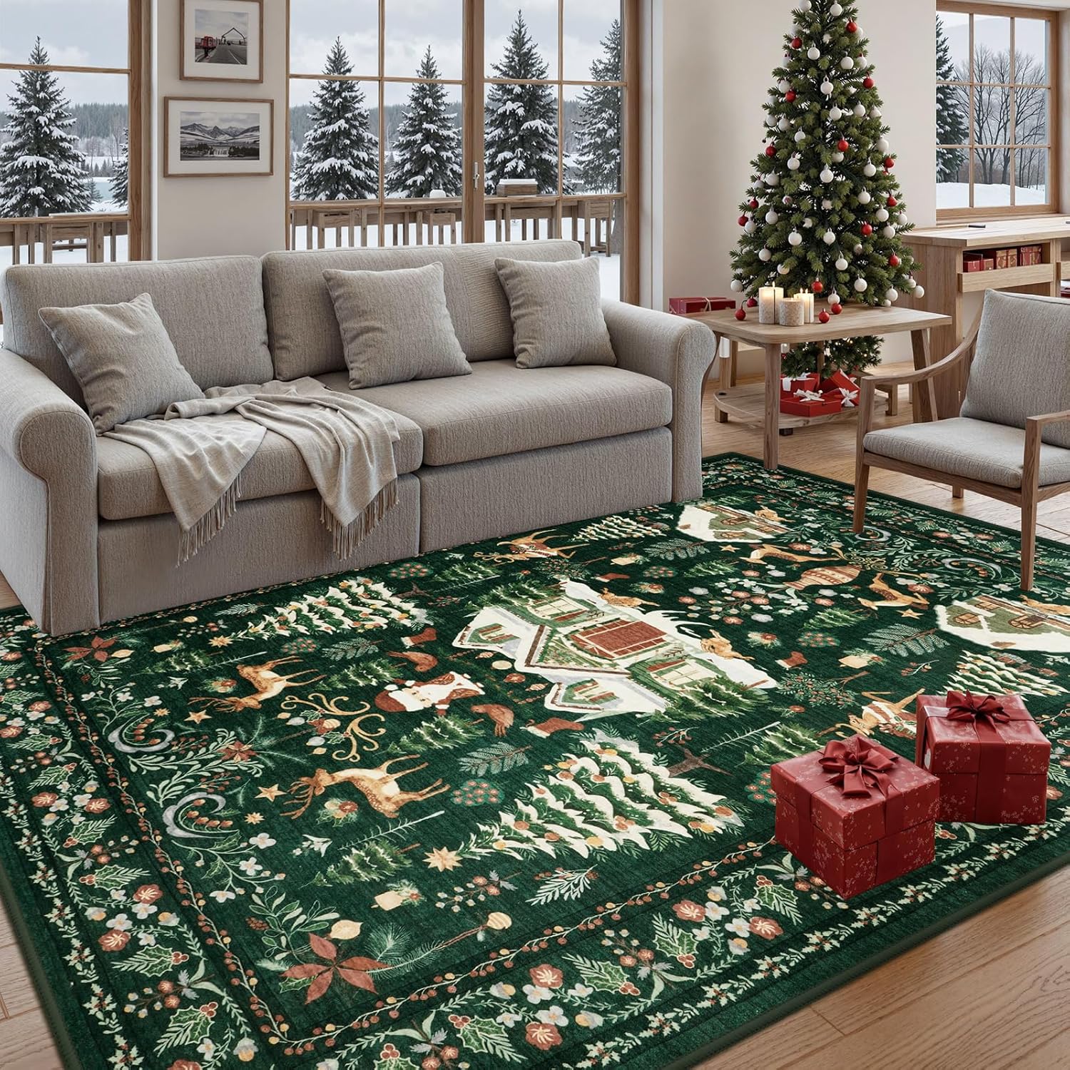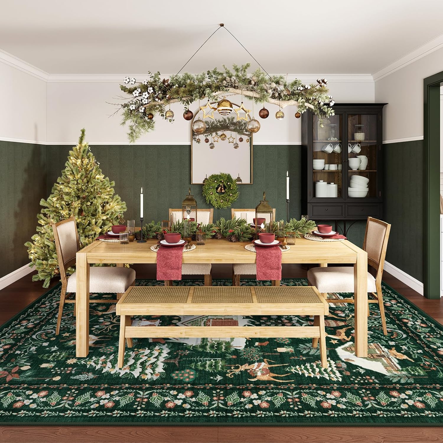 Diseño navideño festivo: esta alfombra combina el encanto bohemio con tonos verdes vintage, adornado con Papá Noel juguetón, reno y un motivo de árbol de Navidad bellamente decorado. Es perfecto para crear un ambiente alegre y festivo que da vida al espíritu navideño de una manera personalizada y acogedora