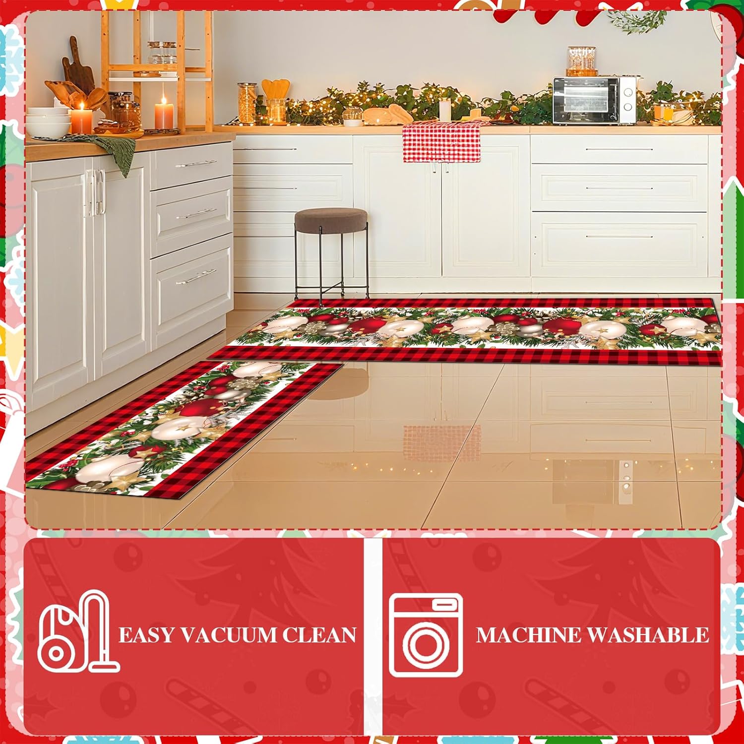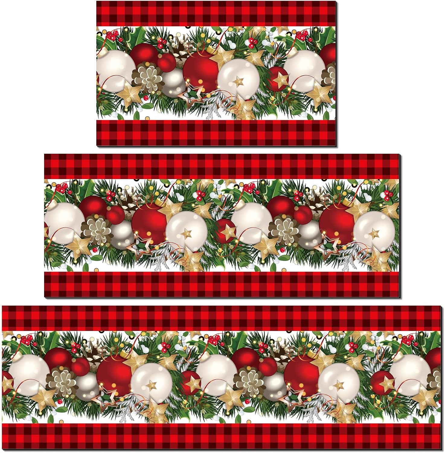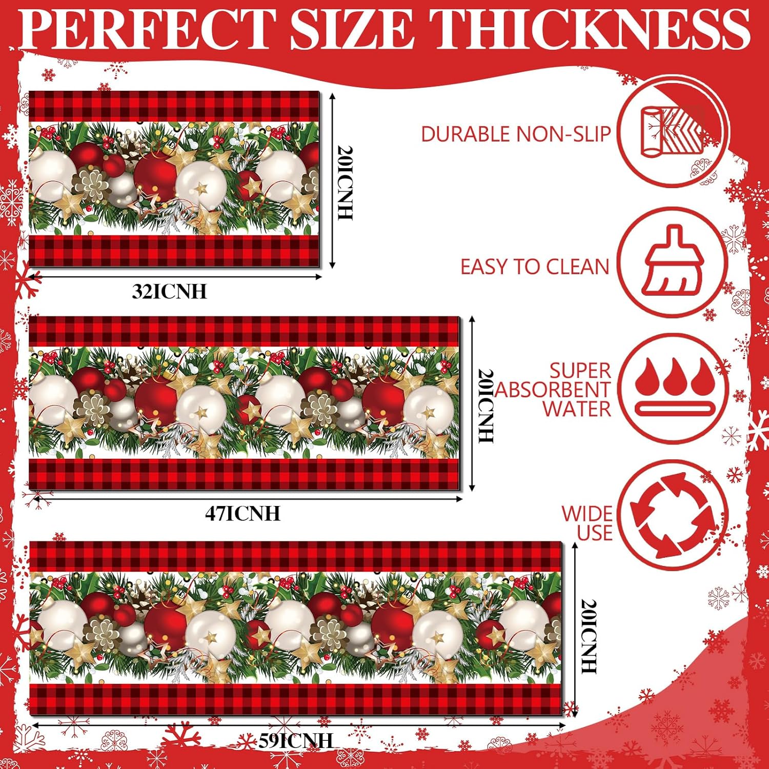 Alfombras y tapetes de cocina de Navidad: el paquete viene con 3 alfombras de cocina de Navidad, y están diseñadas con un tema navideño, impresas con bolas de color rojo y perla, añadiendo un ambiente navideño y añadiendo una sensación diferente a tu Navidad; el diseño de la alfombra de Navidad es llamativo y será un complemento adecuado a la decoración de la cocina