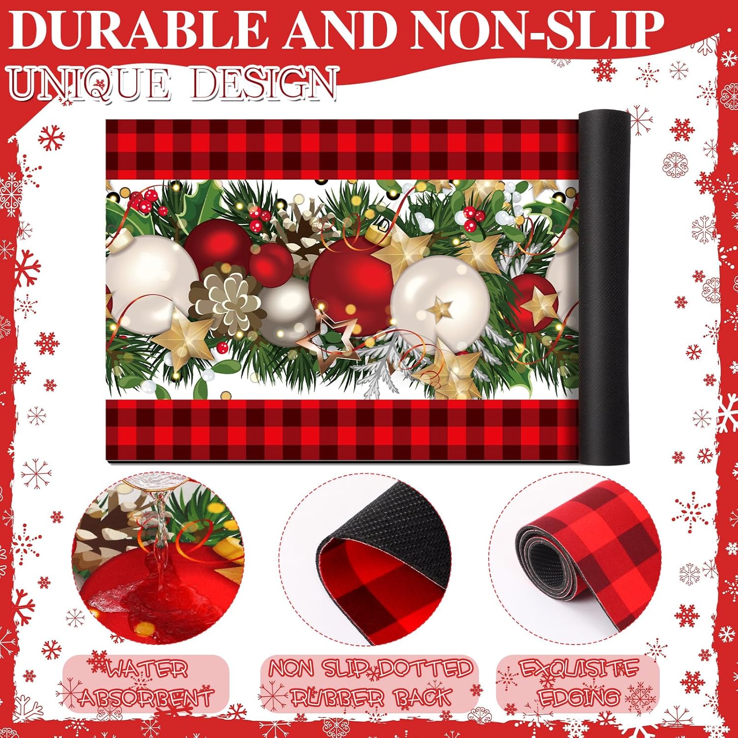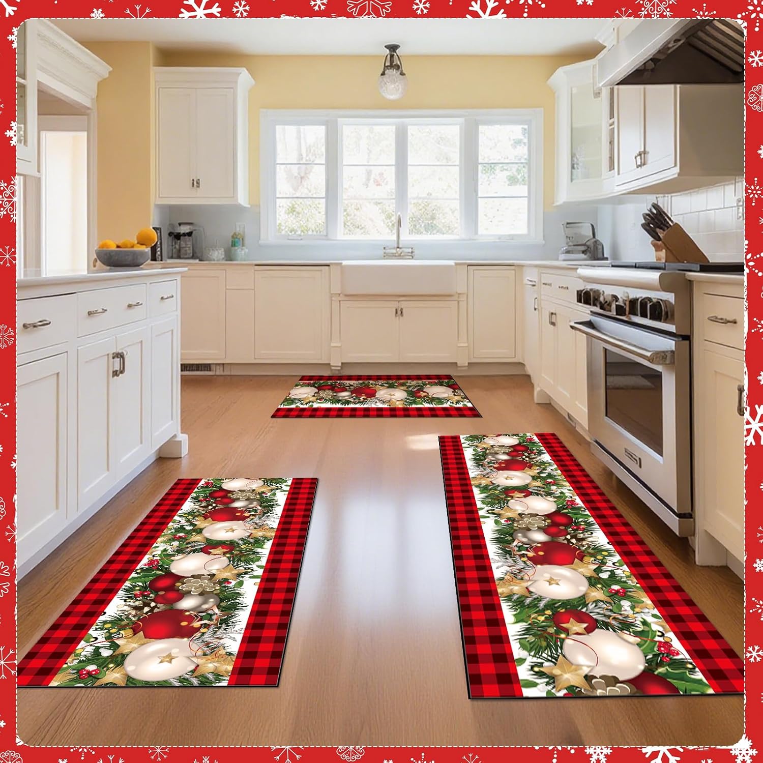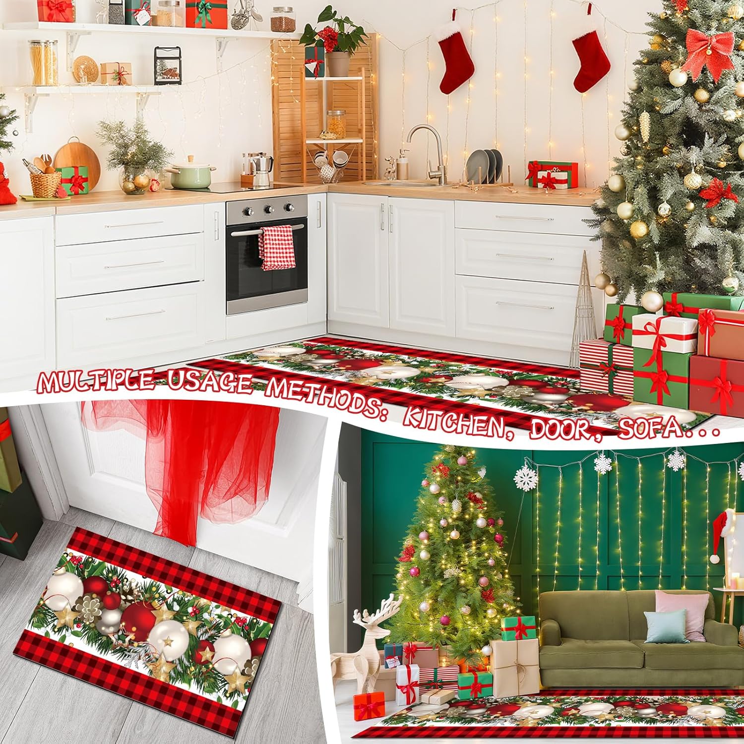 Alfombras y tapetes de cocina de Navidad: el paquete viene con 3 alfombras de cocina de Navidad, y están diseñadas con un tema navideño, impresas con bolas de color rojo y perla, añadiendo un ambiente navideño y añadiendo una sensación diferente a tu Navidad; el diseño de la alfombra de Navidad es llamativo y será un complemento adecuado a la decoración de la cocina