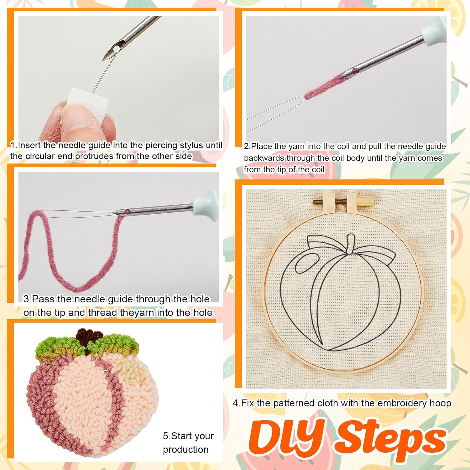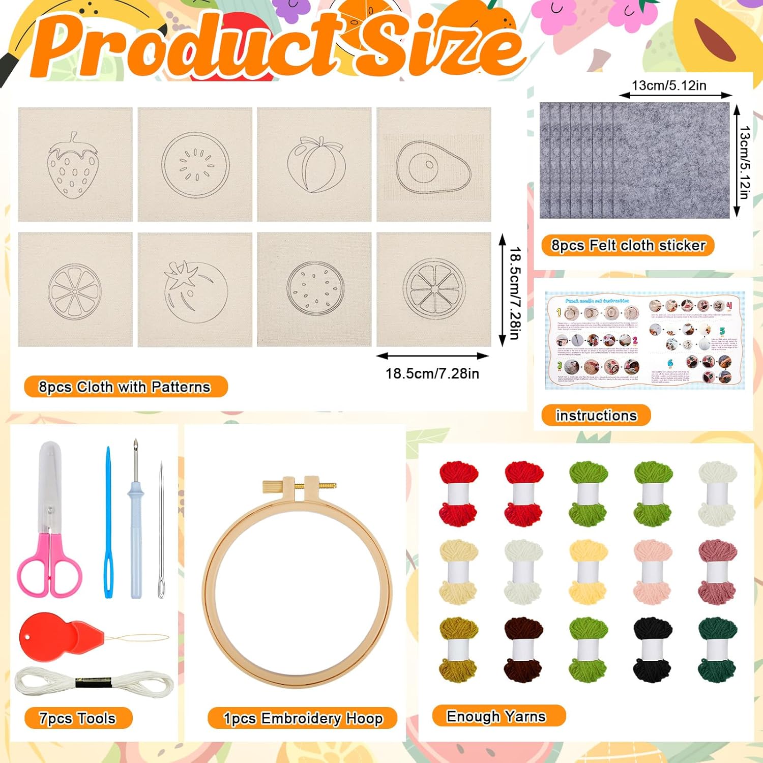 Paquete completo: el paquete incluye un total de 8 kits de agujas perforadoras de frutas equipadas con paños de fieltro, bolígrafos, tijeras, aro de bordado, hilos de bordar, agujas de bordar, enhebradores de hilos, instrucciones en inglés, etc. ; Teniendo la mayoría de las herramientas necesarias a mano, puede comenzar su proyecto de bricolaje inmediatamente sin la necesidad de compras adicionales