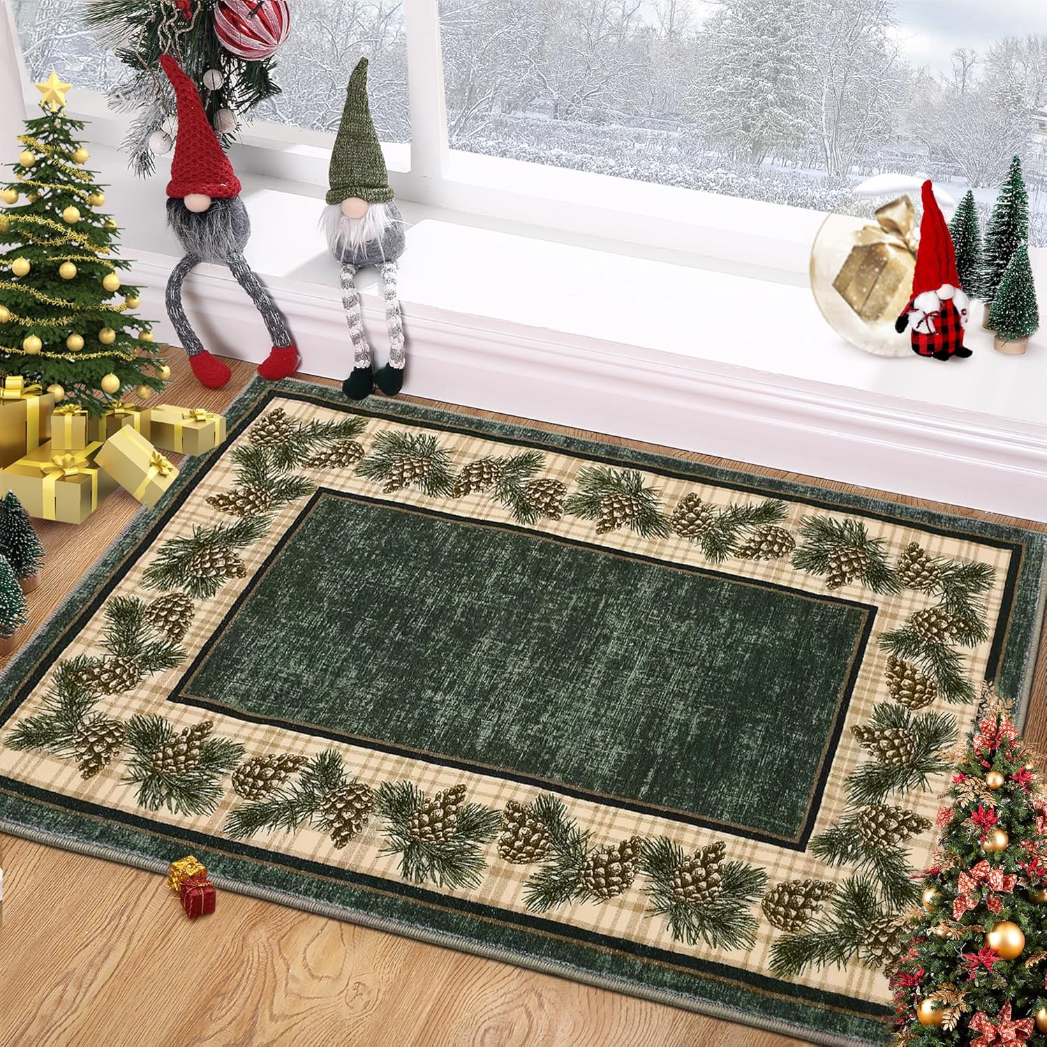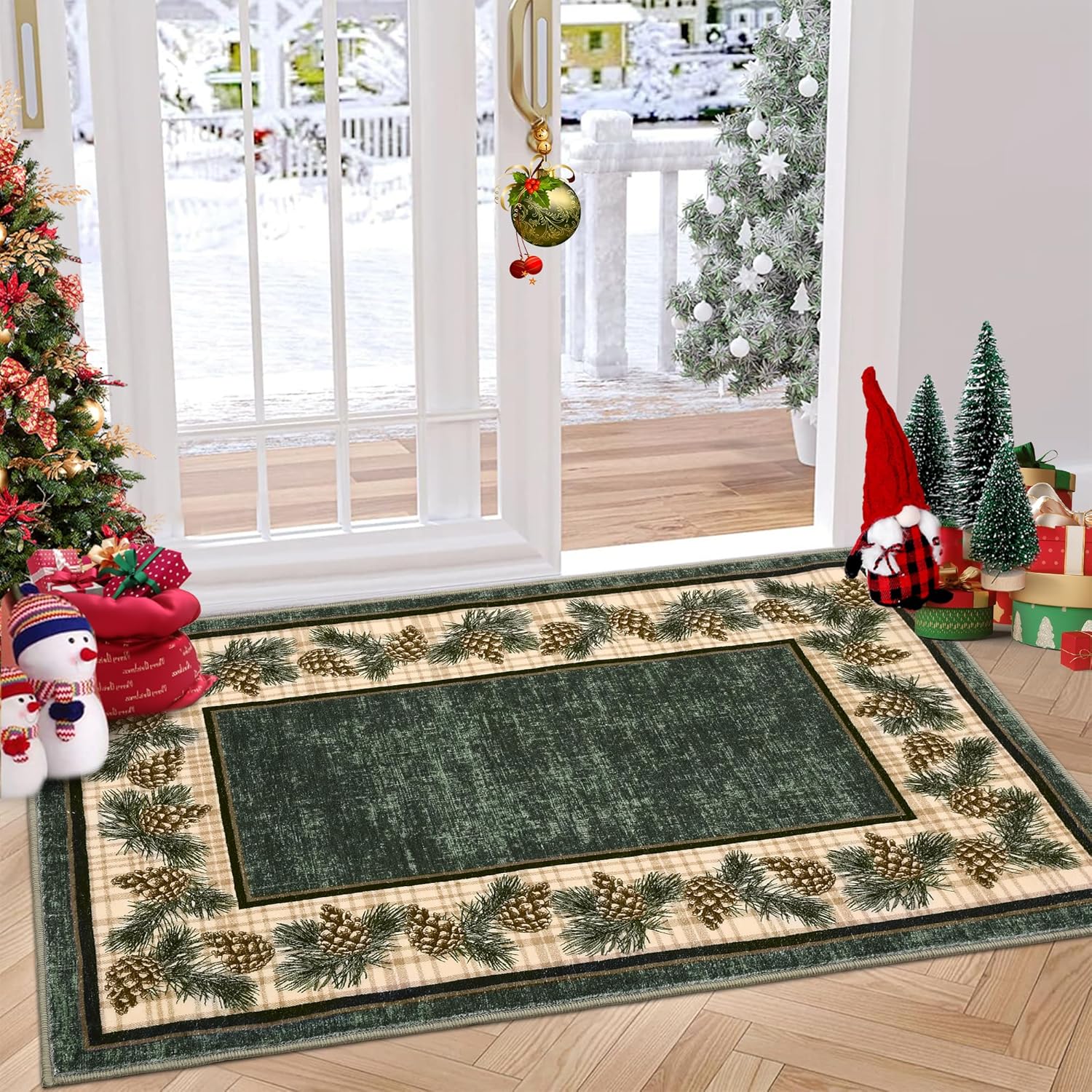 RUGSREAL Tapete de Navidad de 2 x 3 pulgadas, con parte trasera antideslizante, con cono de pino de Navidad, tapete para interiores, resistente a las manchas, lavable, tapete de acento abstracto para