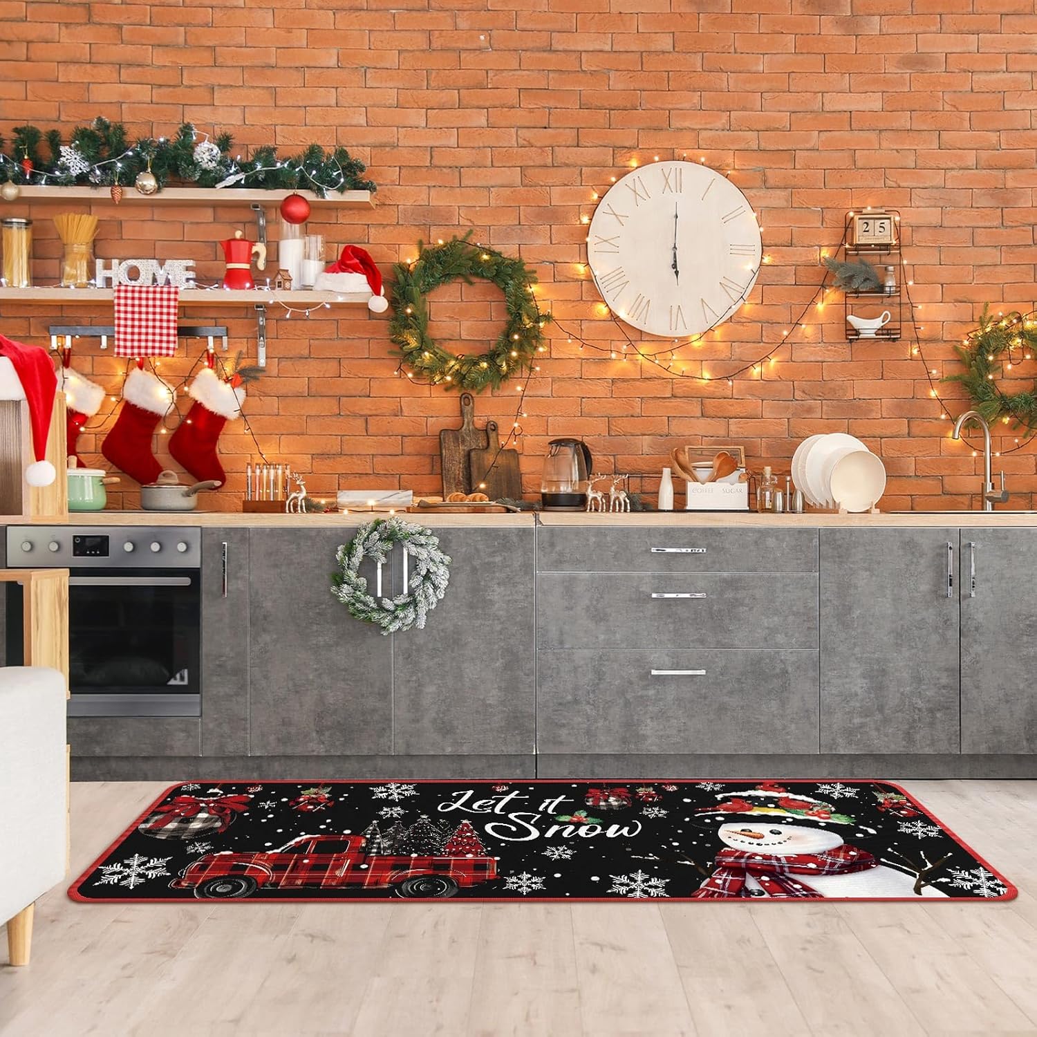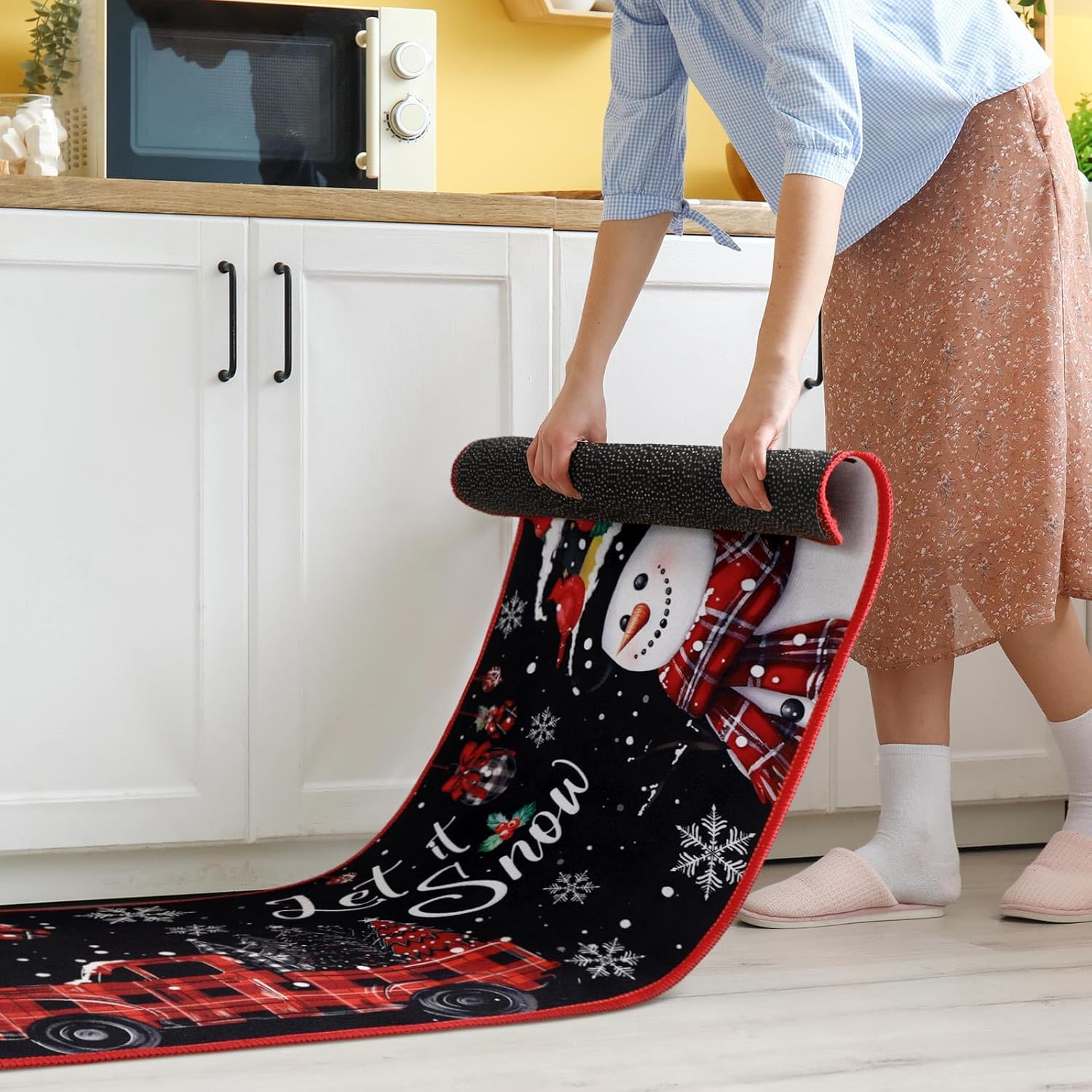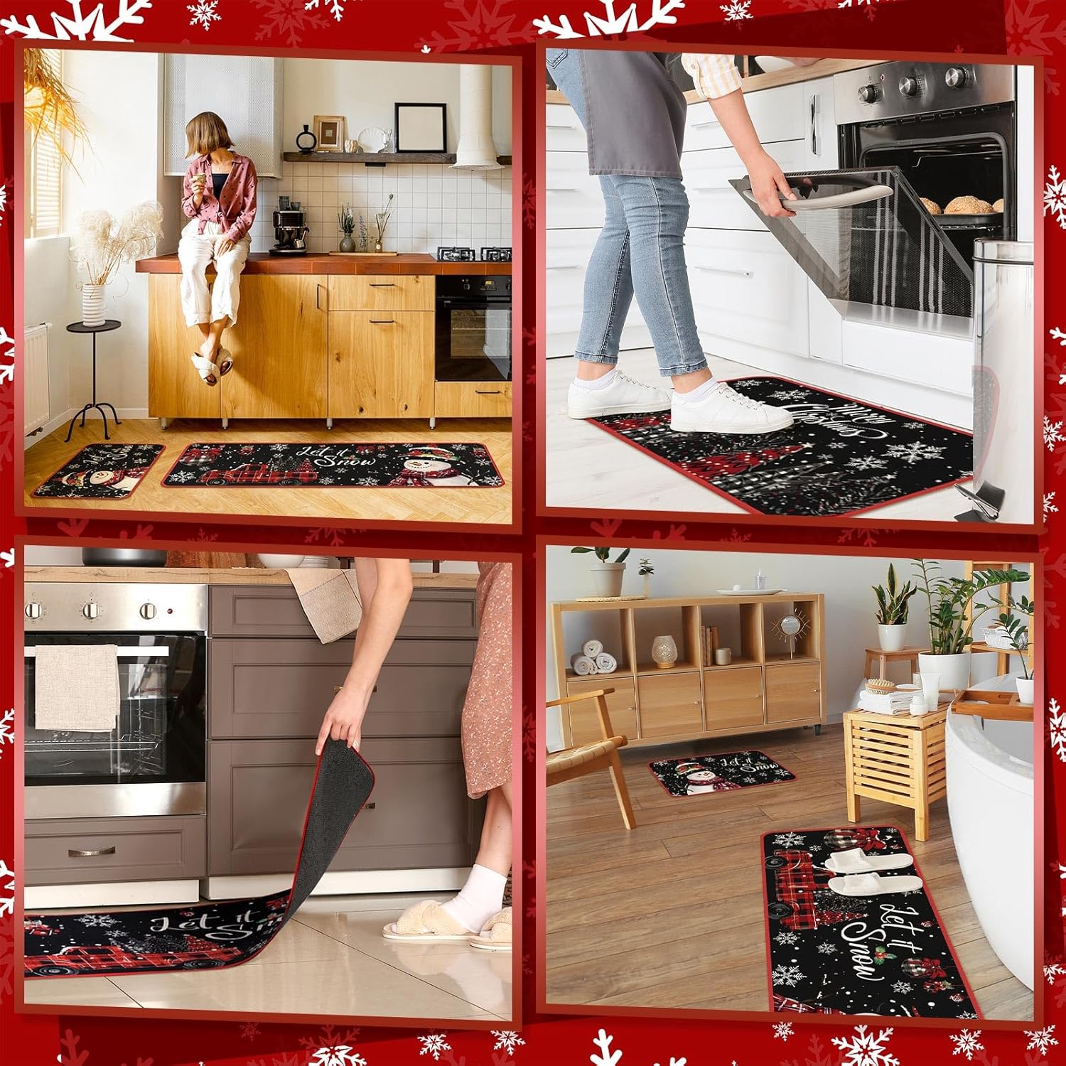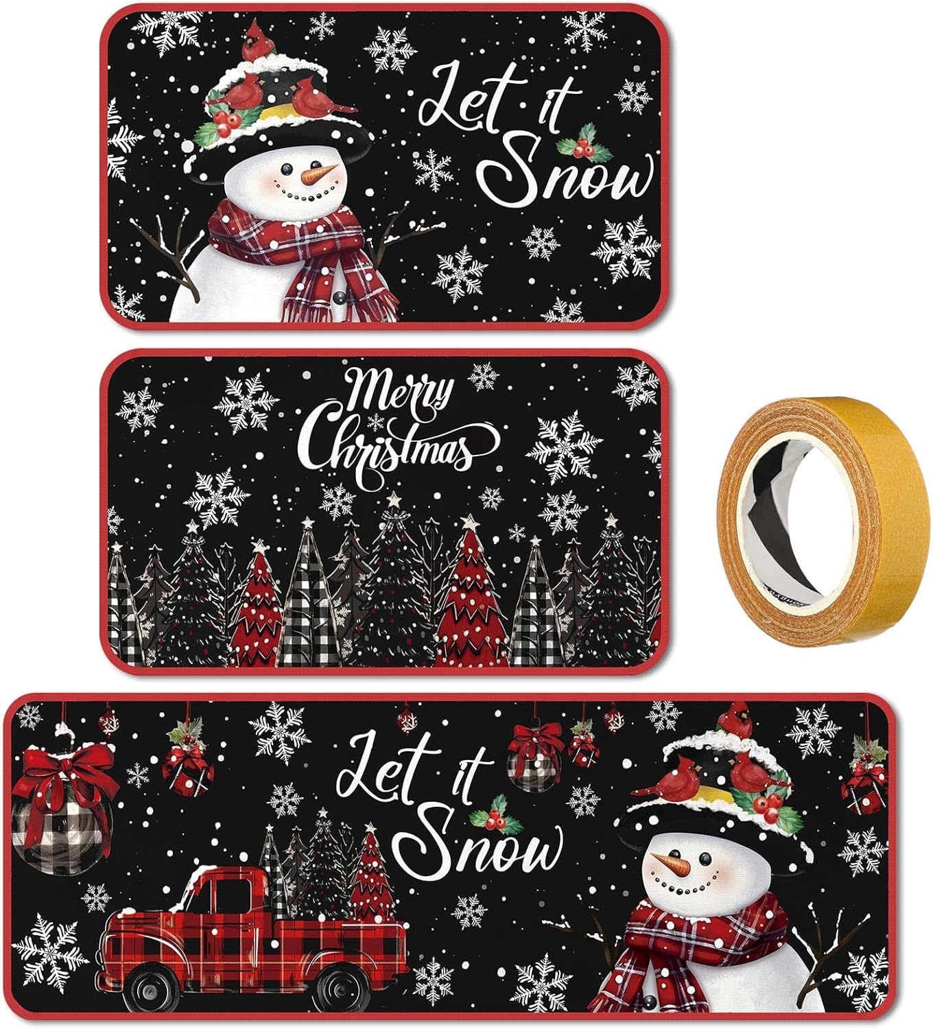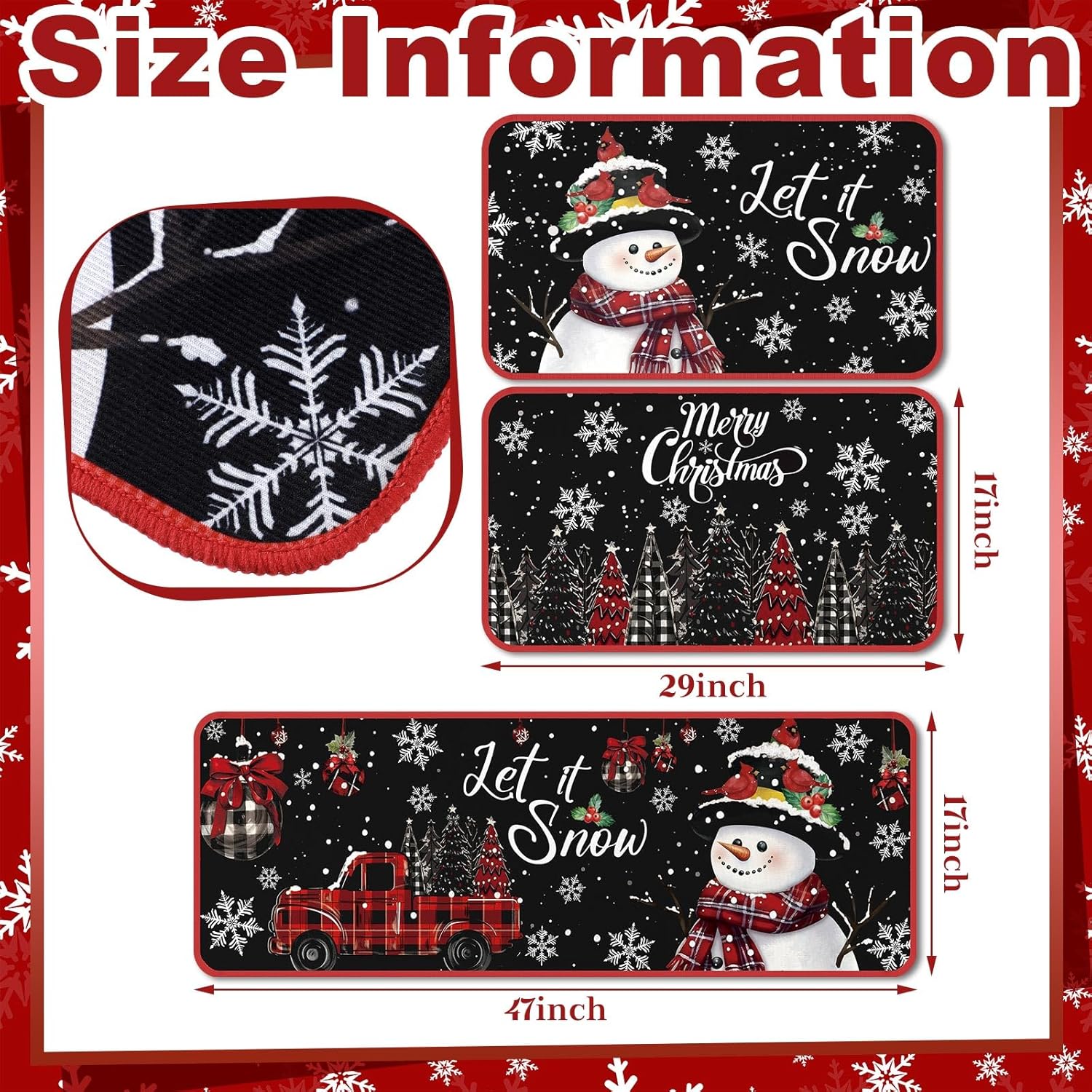 Diseño temático de Navidad: el juego de alfombras de cocina está cuidadosamente diseñado pensando en el tema clásico de Navidad; el fondo negro, impreso con copos de nieve, cascanueces, Papá Noel, camión, palabras de [let it snow] y más, mejora sin esfuerzo la decoración navideña interior de tu hogar mientras mantiene un atractivo fresco y vibrante