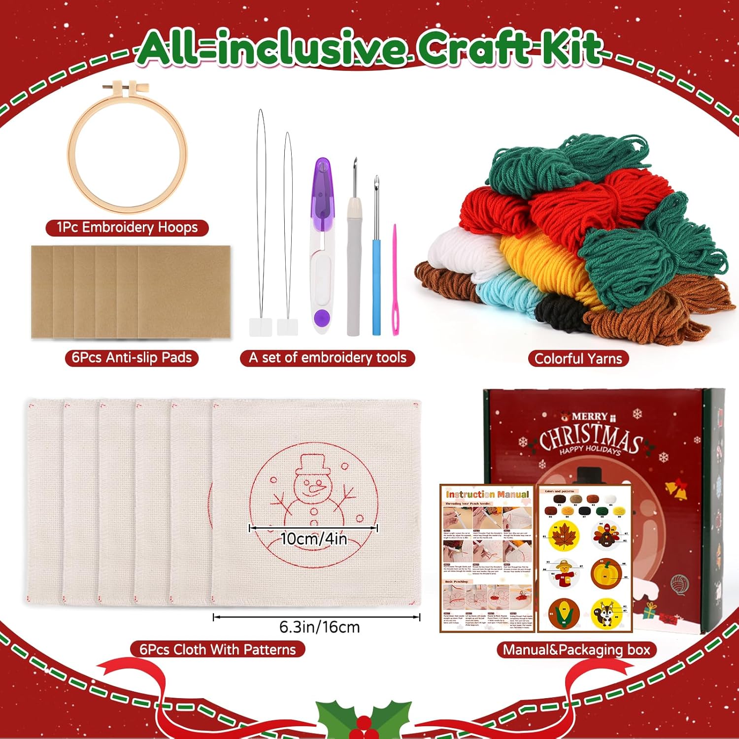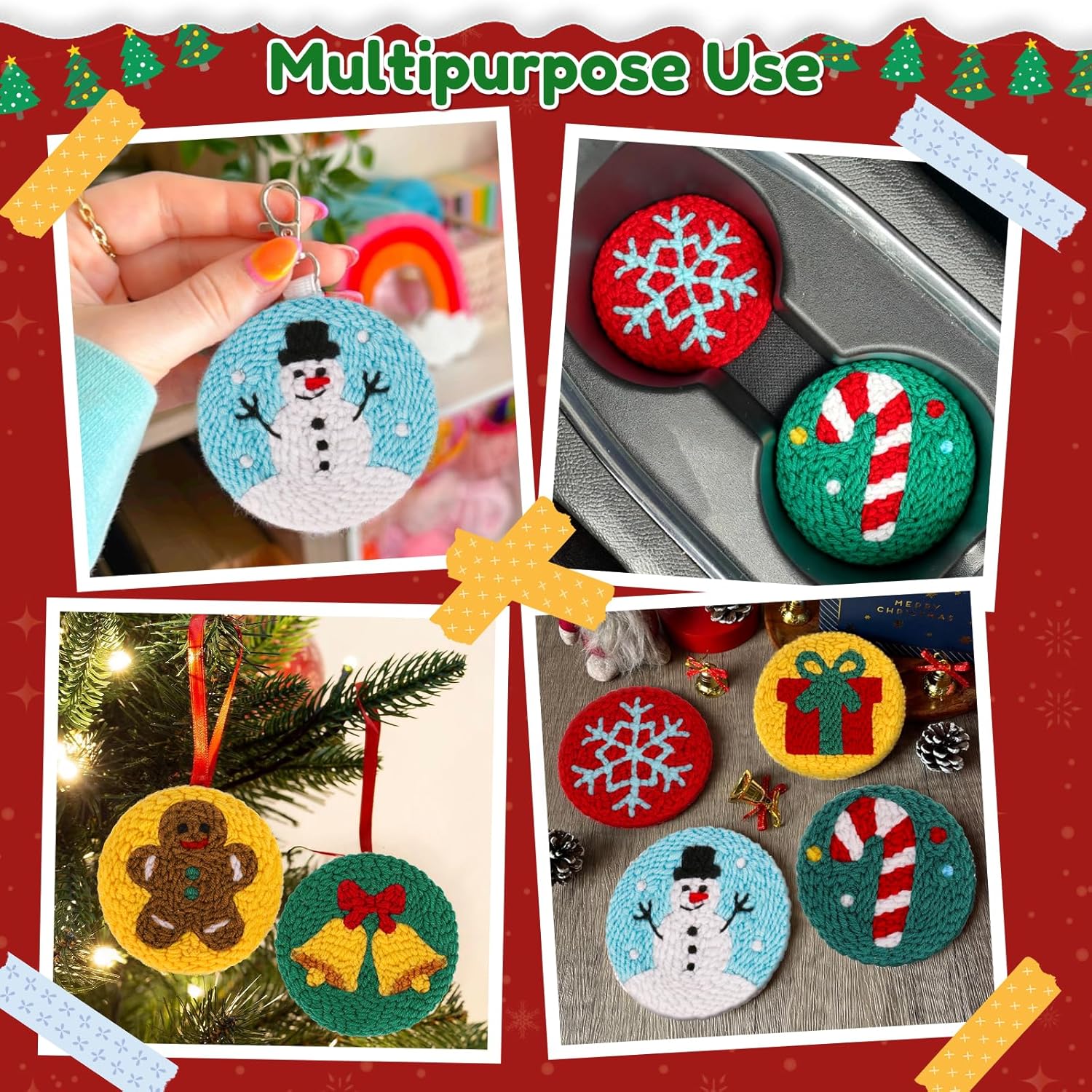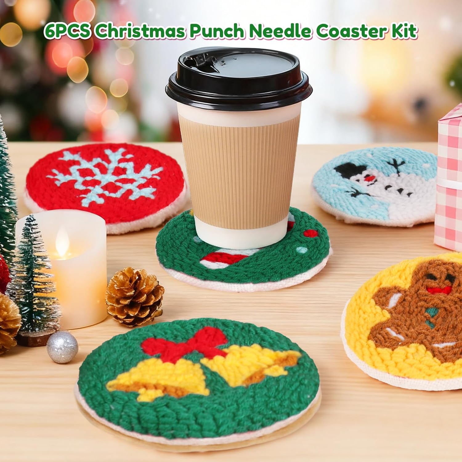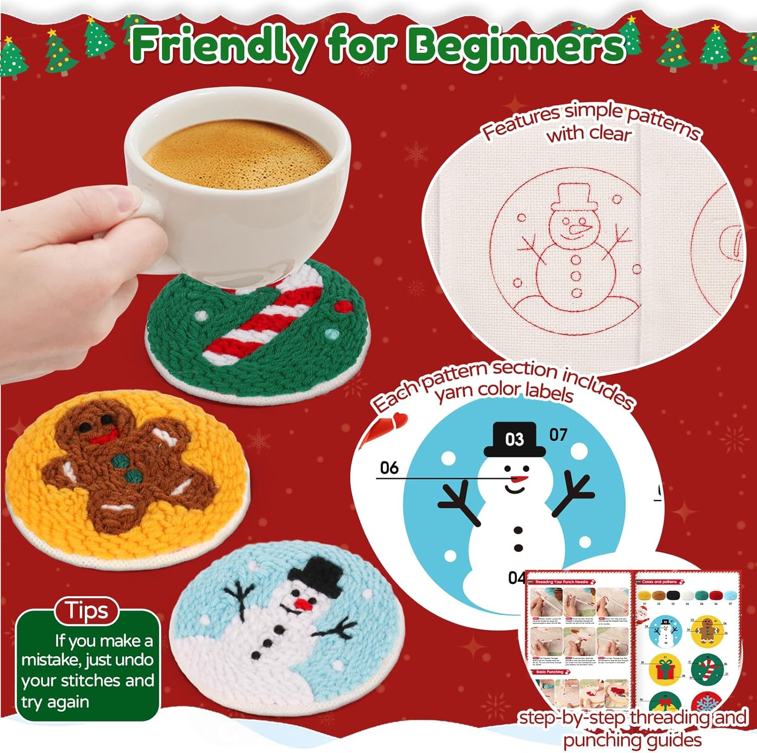 Sukhumvit Juego de 6 posavasos de aguja de punzonado de Navidad, juego de agujas de perforación para principiantes con 6 patrones copetudos, hilos, aros y almohadillas adhesivas, kit de posavasos