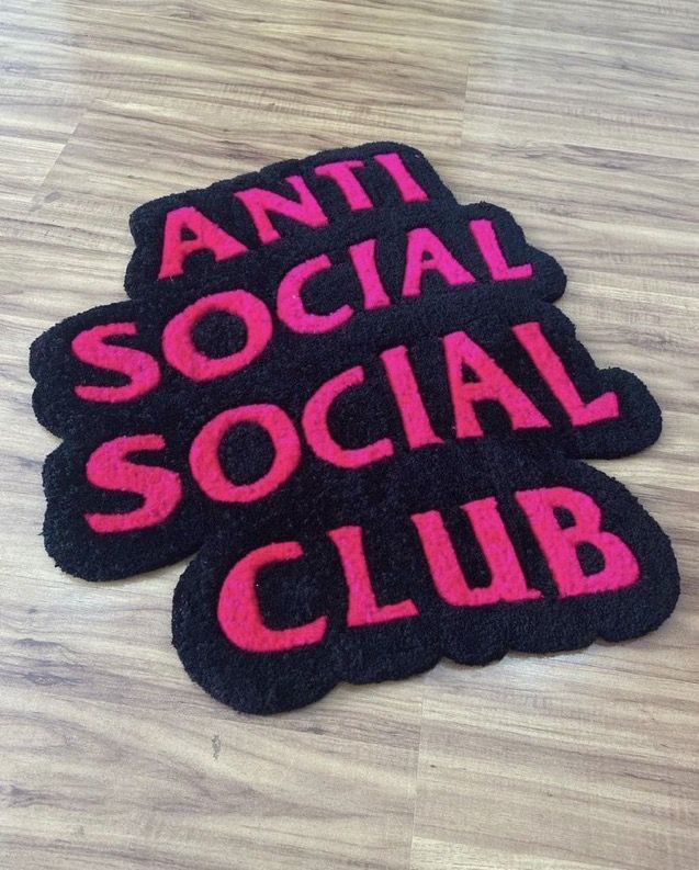 Tapete de diseño temático basado en el logo de la popular marca de ropa Anti Social Social Club (ASSC). El tapete es de forma irregular, siguiendo el contorno del texto de la marca. El fondo es de un negro profundo y las letras son de un rosa vibrante o fucsia con un estilo de fuente sans-serif en mayúsculas, dispuestas en tres líneas. La combinación de negro y rosa neón es una característica distintiva de la estética de la marca. Es una pieza de decoración de nicho que apela directamente a los entusiastas de la cultura hypebeast y streetwear