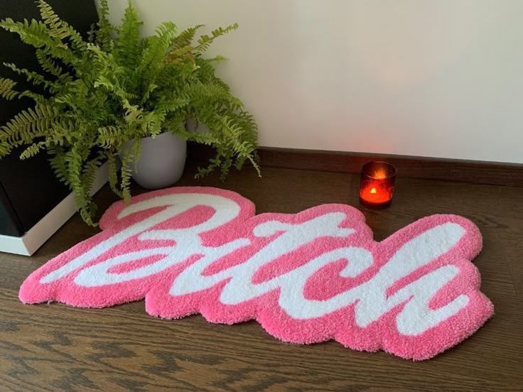 Tapete de acento con una silueta que sigue el contorno de la palabra. La palabra “Bitch” está tejida en una fuente cursiva y fluida de color blanco. El diseño tiene un contorno grueso de rosa chicle o fucsia que hace que el texto resalte de manera llamativa. La pieza tiene un estilo provocador y humorístico (sarcastic pop), y está ambientada junto a una planta y una vela, lo que subraya su uso como una pieza de declaración en un interior moderno