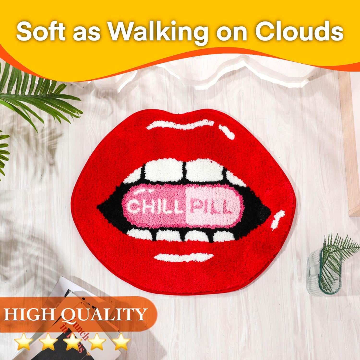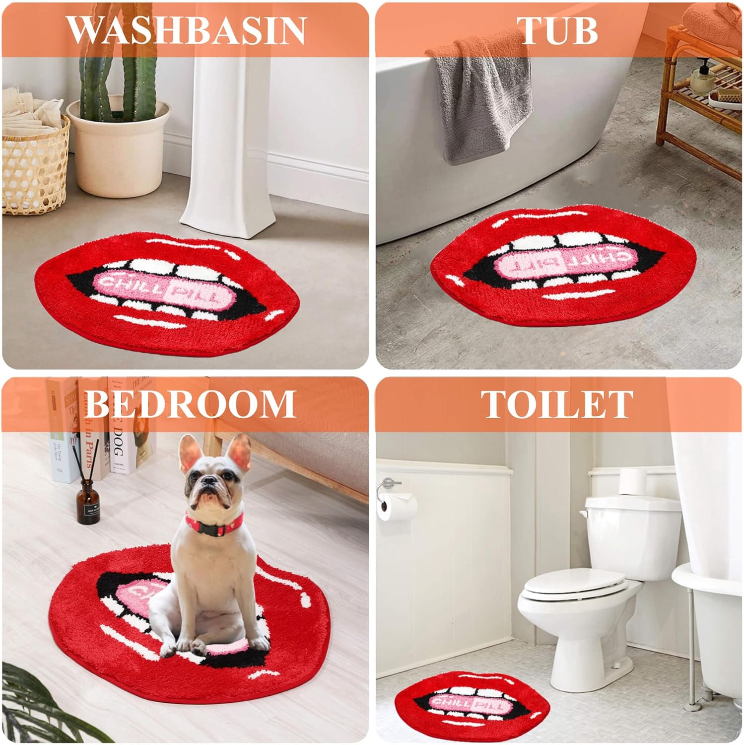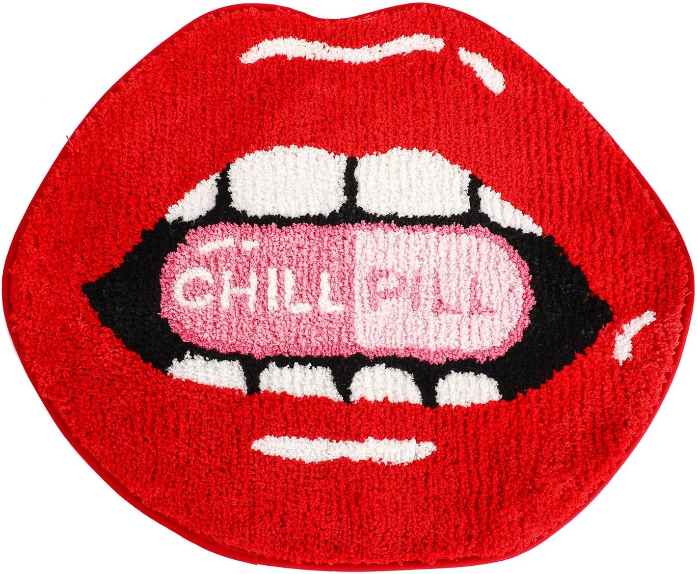 【Diseño único de labios rojos sexy】: el tapete de baño antideslizante con forma de labio retro con diseño CHILL PILL es francamente adorable y seguramente se convertirá en el punto focal de cualquier habitación. Tamaño pequeño y delicado pero súper lindo. Nunca te cansarás de mirarlo. Aporta una sensación táctil cómoda, te hace sentir suave como caminar sobre las nubes, añade encanto adicional al baño.