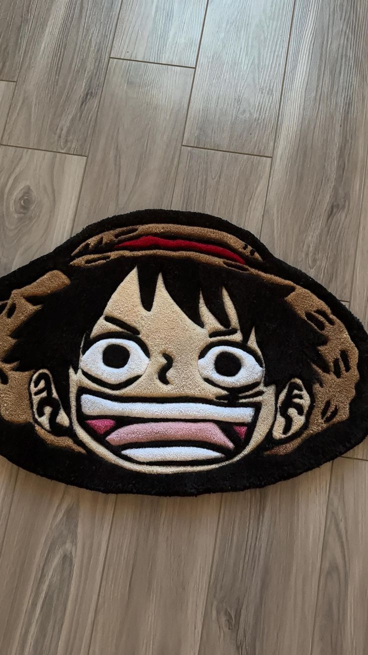 Tapete de diseño temático basado en el popular anime y manga One Piece. El tapete está recortado para tomar la forma de la cara de Monkey D. Luffy, el protagonista. La pieza se centra en su rostro con una expresión de boca abierta y ojos grandes, junto con el elemento más distintivo del personaje: su Sombrero de Paja (Mugiwara). El cabello es negro y el sombrero es de tonos marrones. La textura es gruesa y suave, ideal para ser una alfombra de entrada o decorativa para un fanático de la serie
