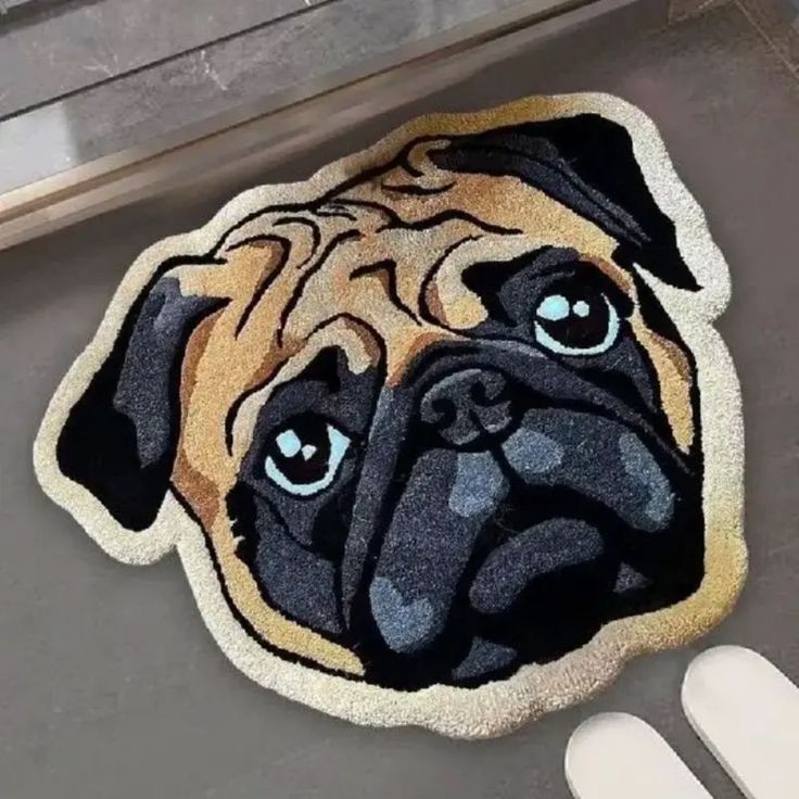 Tapete con la forma de la cabeza de un perro de raza Carlino (Pug), diseñado con un estilo ligeramente caricaturesco. El rostro del perro se representa en tonos de beige/marrón claro y negro para el hocico, la máscara facial y las orejas. El diseño enfatiza las expresiones arrugadas y los ojos grandes y tristes característicos de la raza. El contorno exterior está delineado con un hilo de color beige claro. Es una pieza decorativa de nicho, popular entre los dueños y fanáticos de los pugs