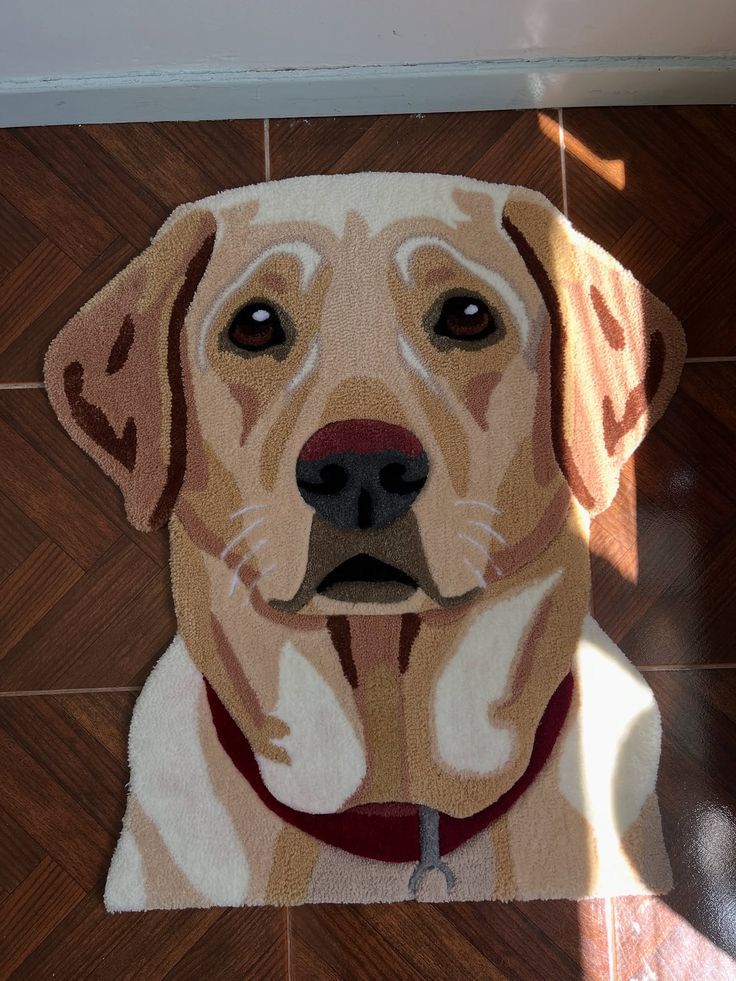 Tapete de área con la silueta de la cabeza de un perro, recreando el retrato de un Labrador Retriever de color amarillo o canela. El diseño es muy detallado, utilizando varios tonos de beige, marrón claro y blanco para capturar la textura del pelaje y las expresiones faciales, incluyendo los ojos marrones y la nariz negra. El perro lleva un collar de color rojo oscuro en la base del cuello. Es una pieza de arte textil personalizada y emotiva, diseñada para los amantes de los perros y colocada sobre un suelo de baldosas de madera