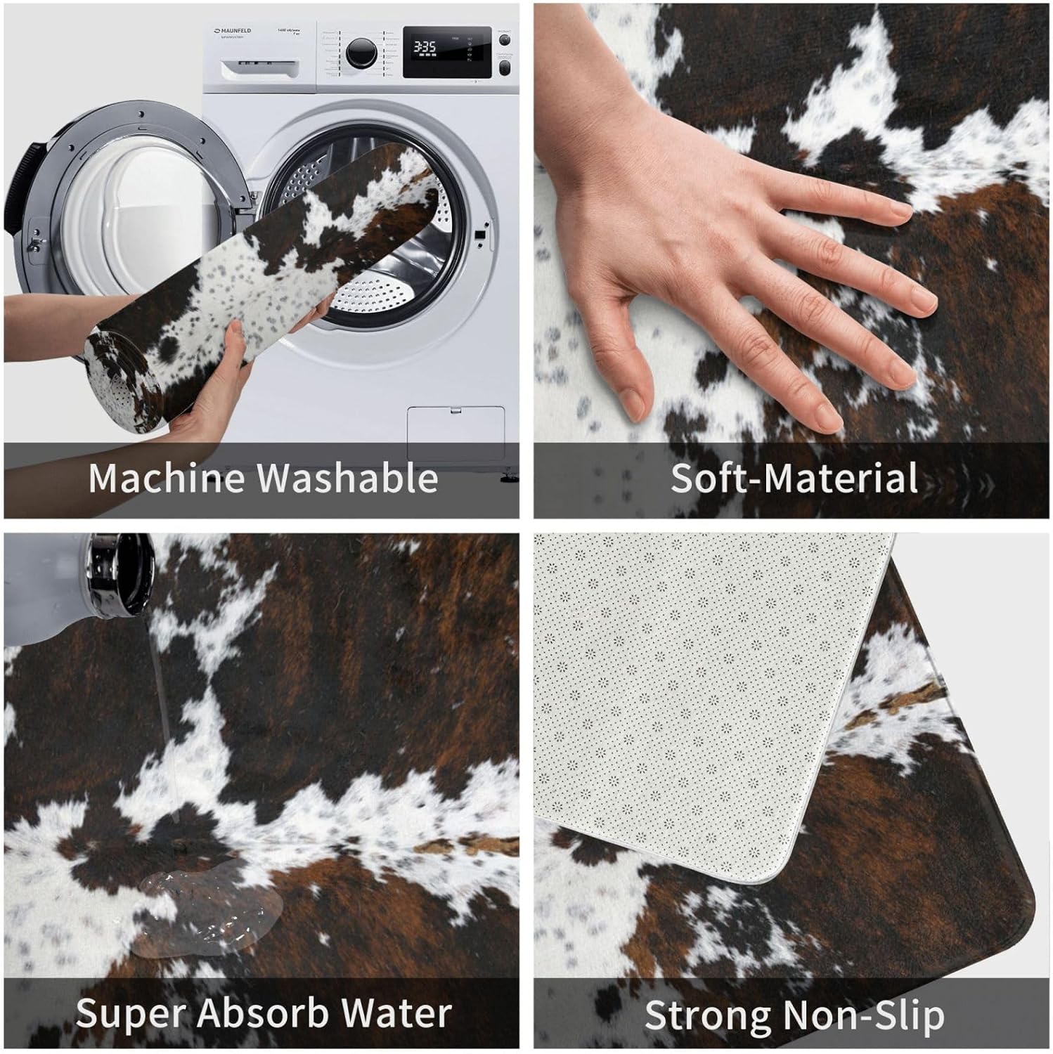 Alfombra de baño suave: nuestras alfombras de baño con estampado de vaca occidental están hechas de 100% poliéster, franela súper suave, gruesa y cómoda. Muy absorbente y de secado rápido, habrá una sensación de apoyo y más comodidad cuando pises sobre él. Protege tus pies del suelo frío al mismo tiempo que protege tu suelo de la humedad