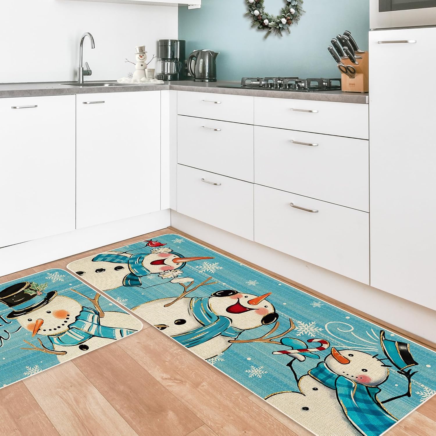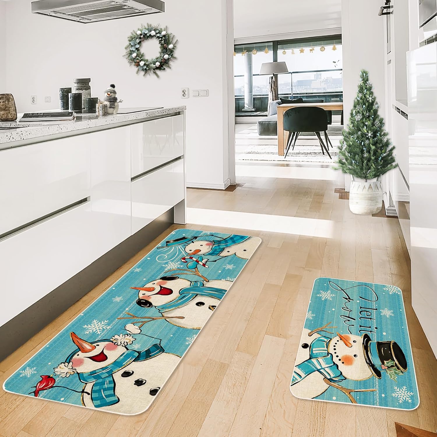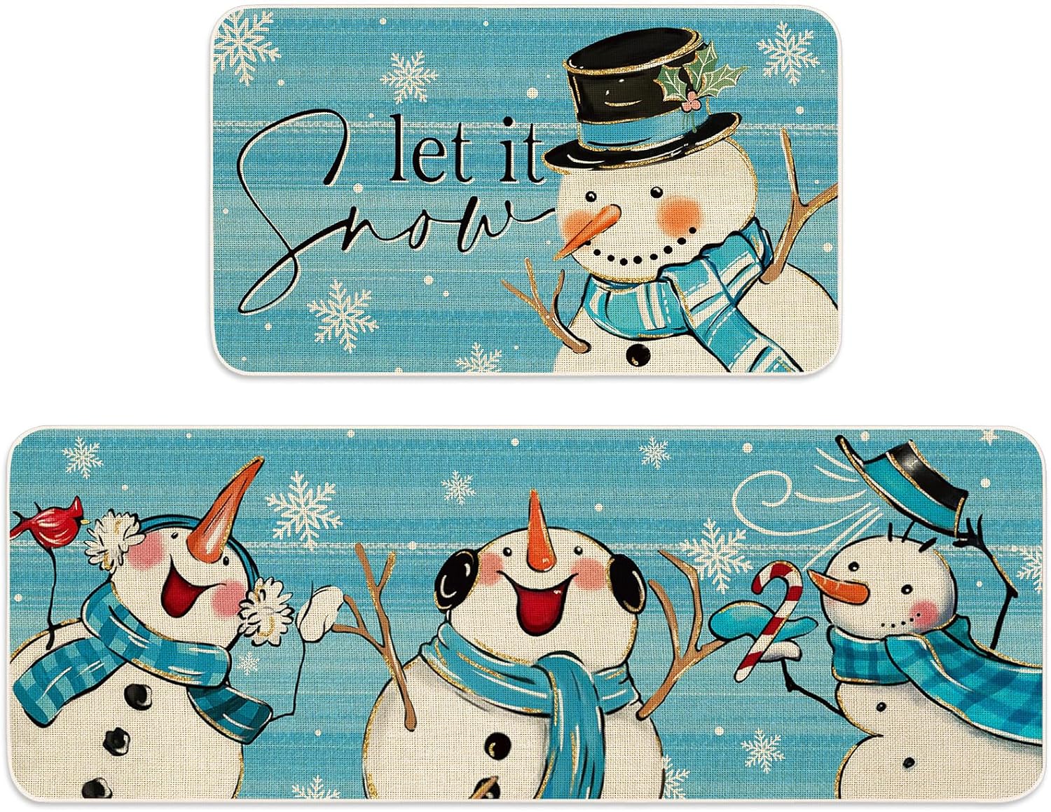 TEMA DE INVIERNO: Nuestros tapetes de cocina están tomando azul como fondo, estampado con muñeco de nieve y copo de nieve, e impreso con las palabras de let it snow, exquisito y lindo, lleno de ambiente festivo, grandes suministros para la decoración de tu hogar
