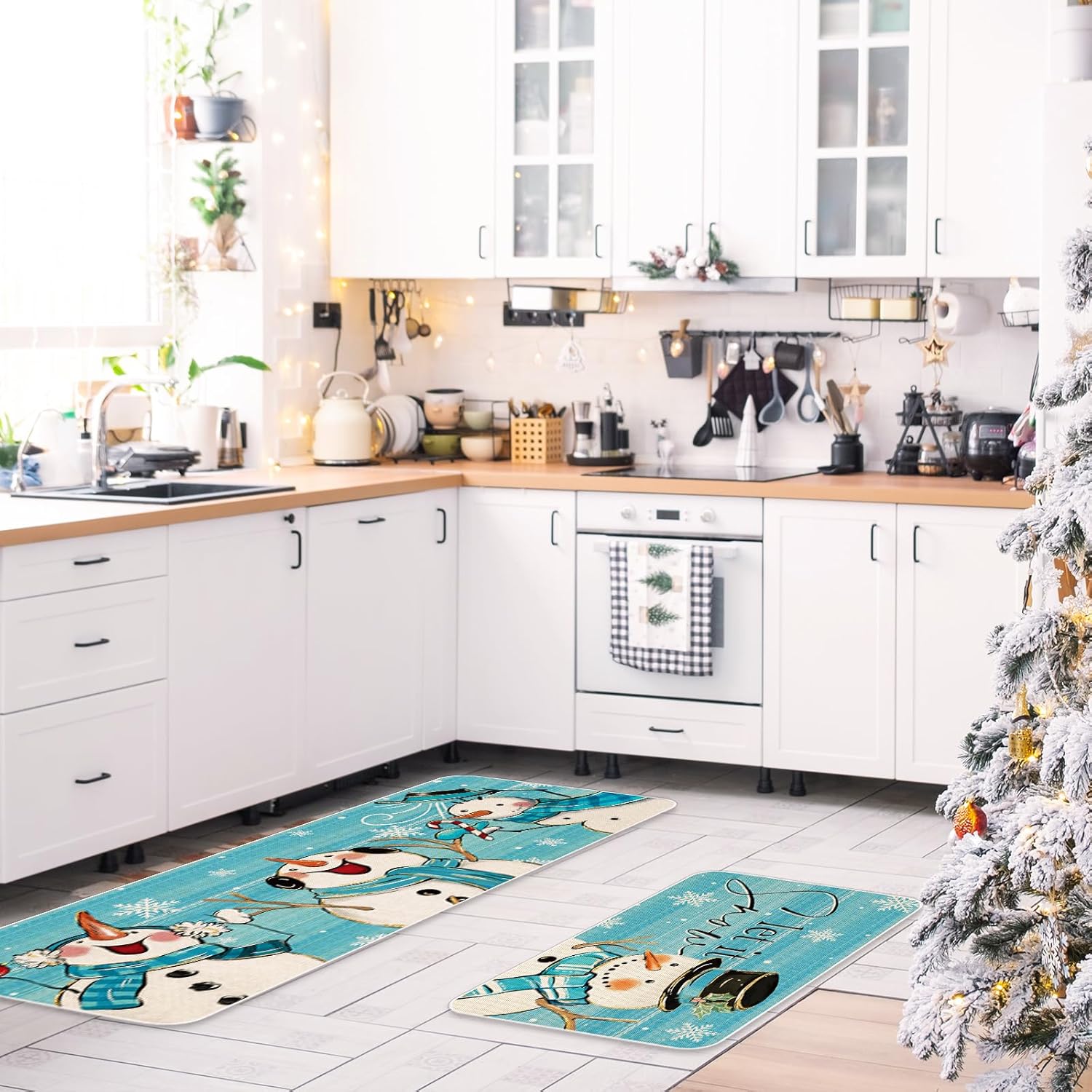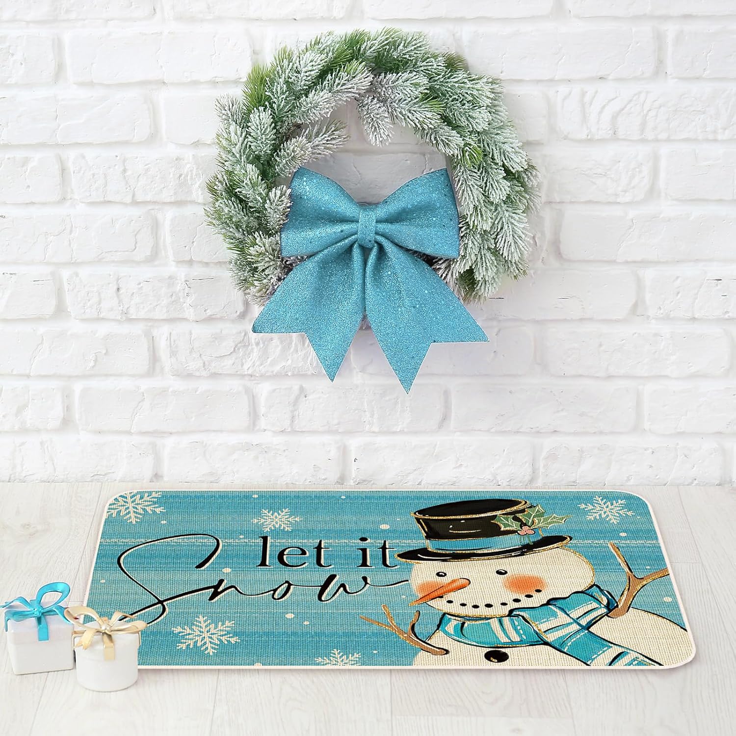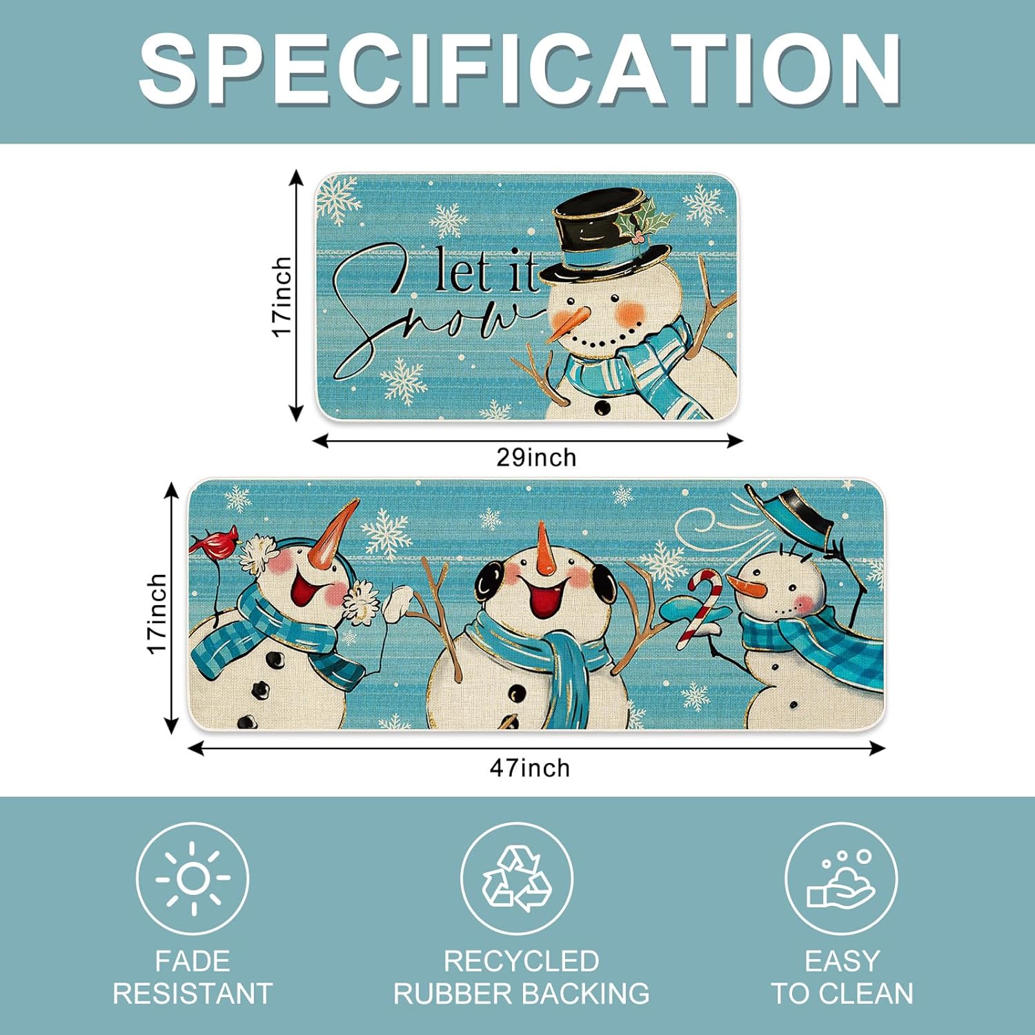 TEMA DE INVIERNO: Nuestros tapetes de cocina están tomando azul como fondo, estampado con muñeco de nieve y copo de nieve, e impreso con las palabras de let it snow, exquisito y lindo, lleno de ambiente festivo, grandes suministros para la decoración de tu hogar