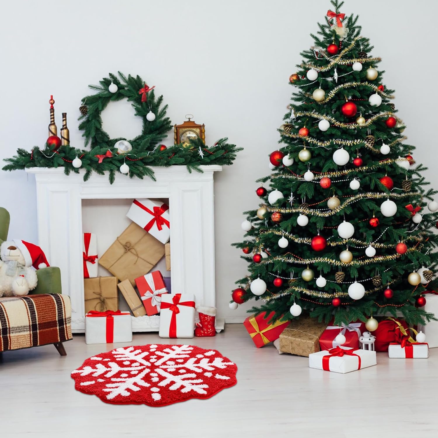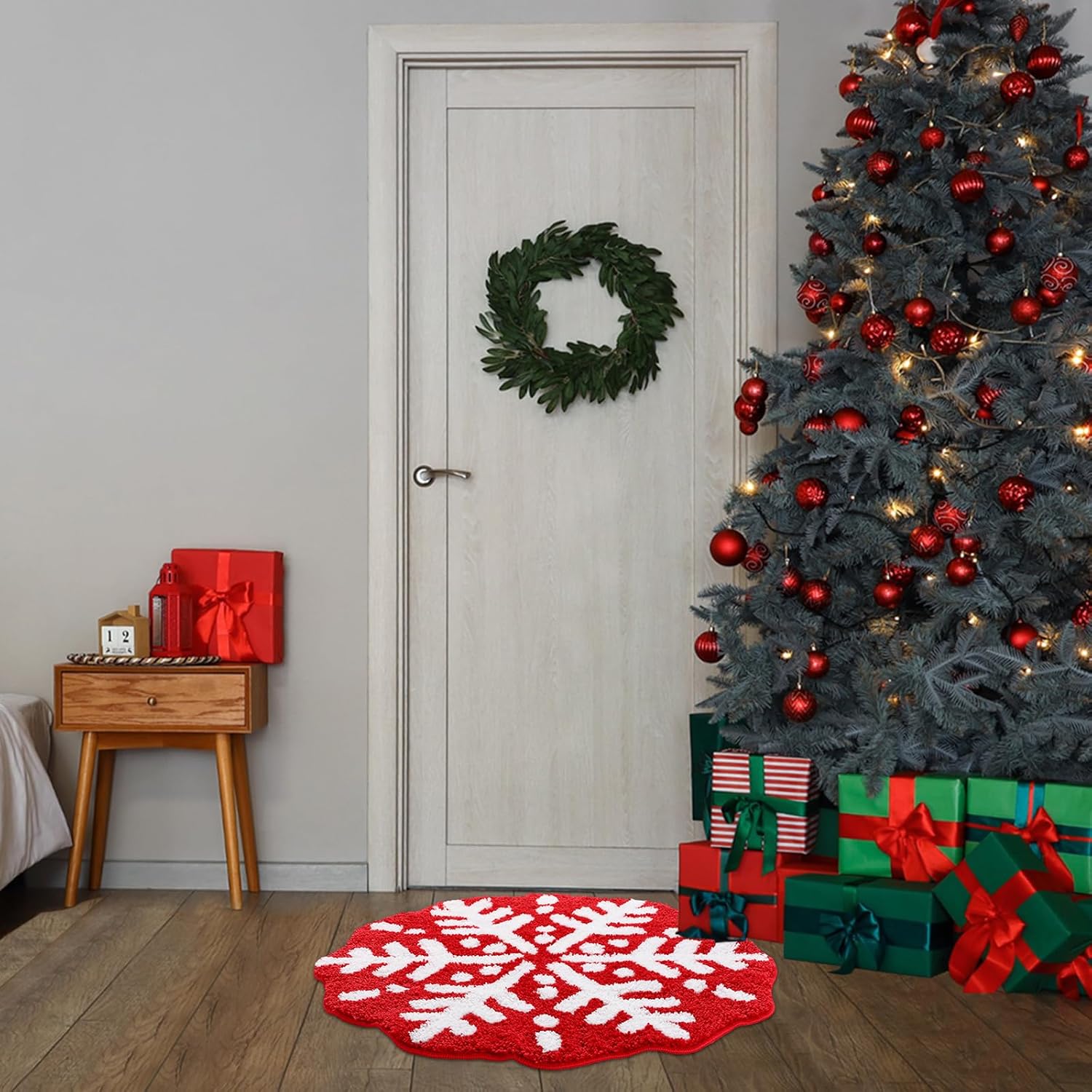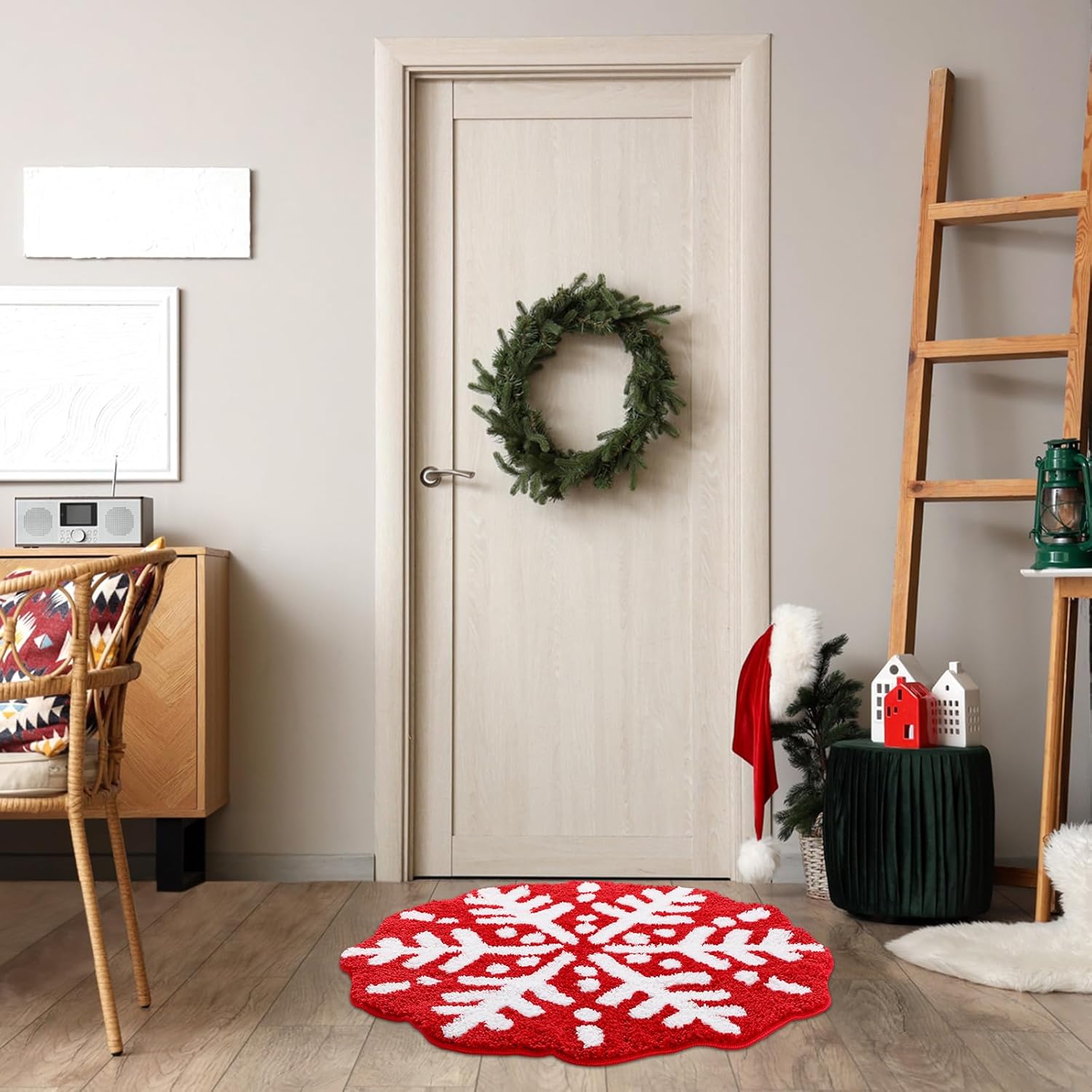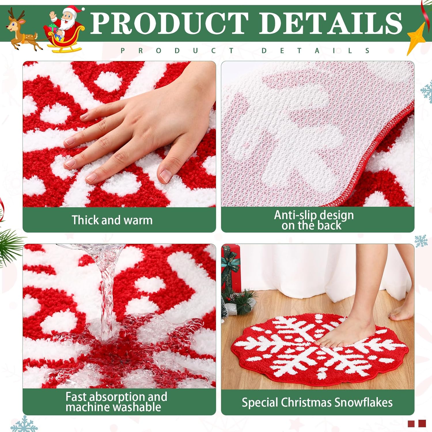 Estilo de copo de nieve: la alfombra de baño de invierno está diseñada con estilo de copo de nieve, linda y divertida, con colores clásicos rojos y blancos a juego, ofreciendo una adición alegre a tu decoración navideña mientras proporciona una barrera práctica entre la suciedad de los zapatos y tu hogar