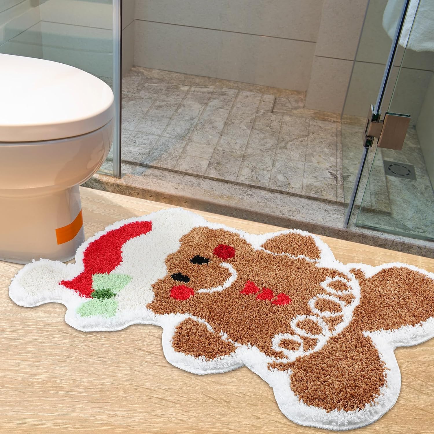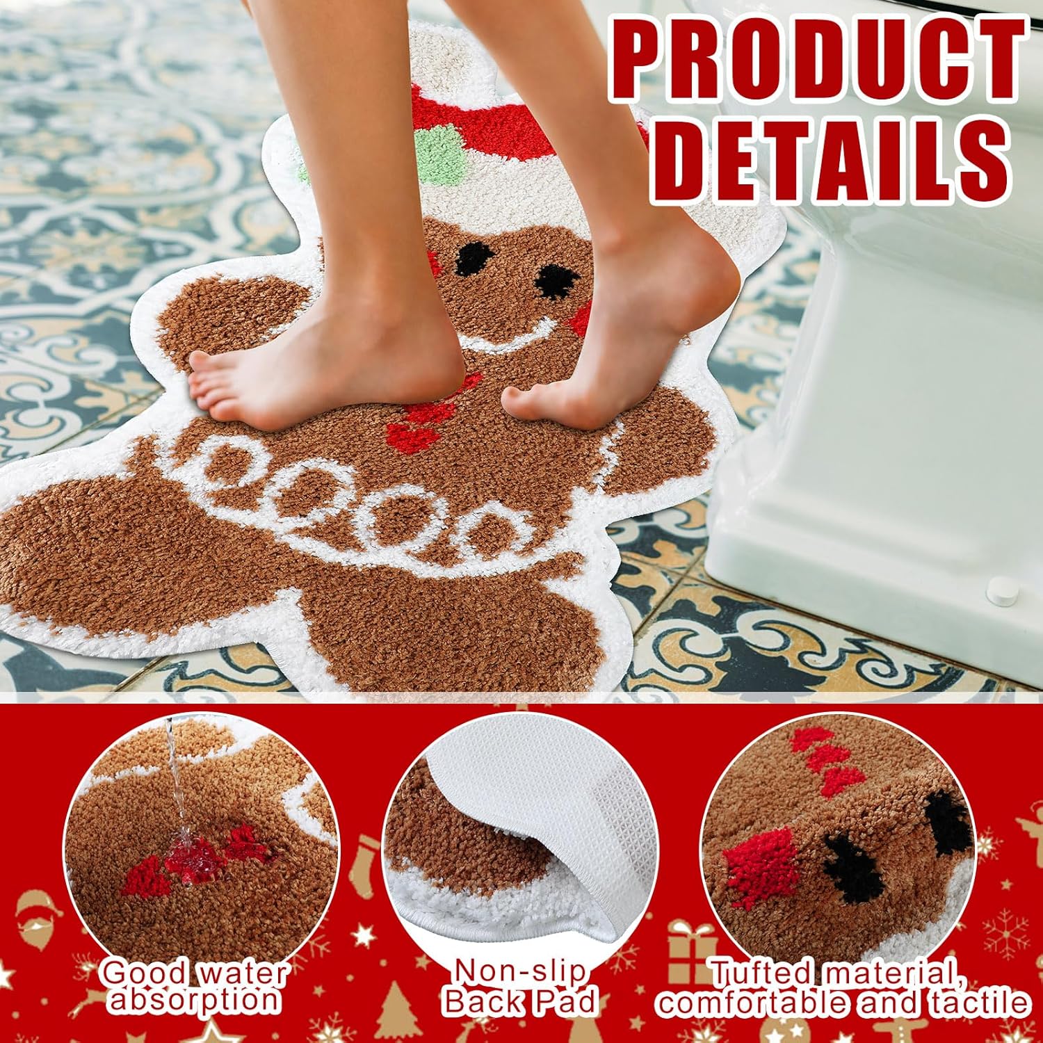 Aumenta tu alegría navideña: abraza la temporada navideña con nuestra colorida alfombra de baño de pan de jengibre; su divertido diseño de pan de jengibre eleva la atmósfera de cualquier espacio, sumergiéndote profundamente en el ambiente navideño; hecho para traer risas y ambiente festivo alegre directamente a tu puerta