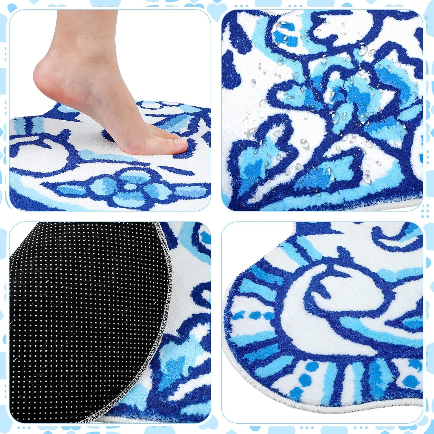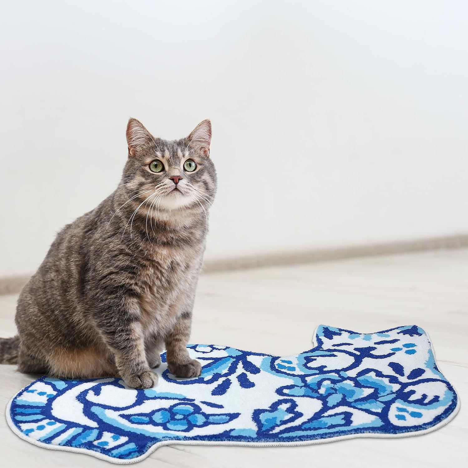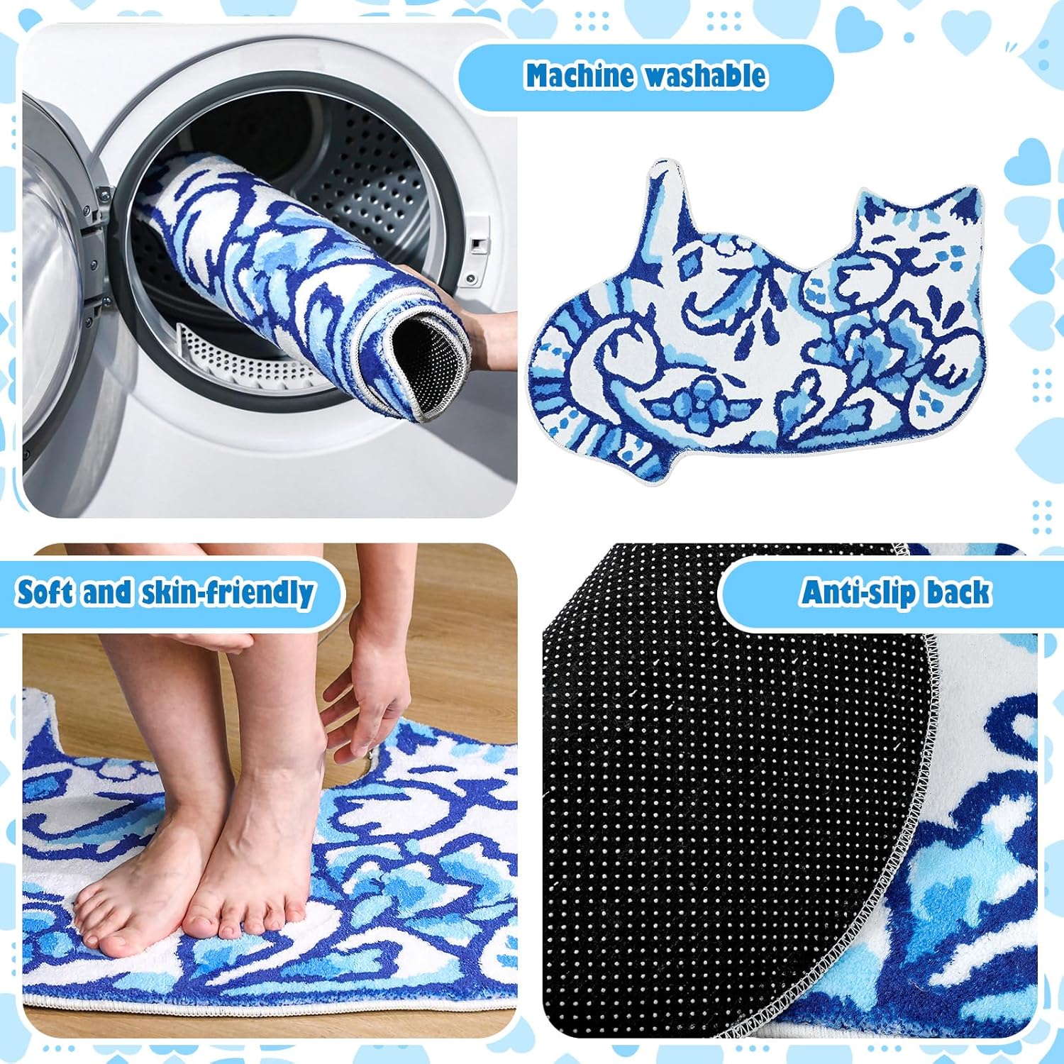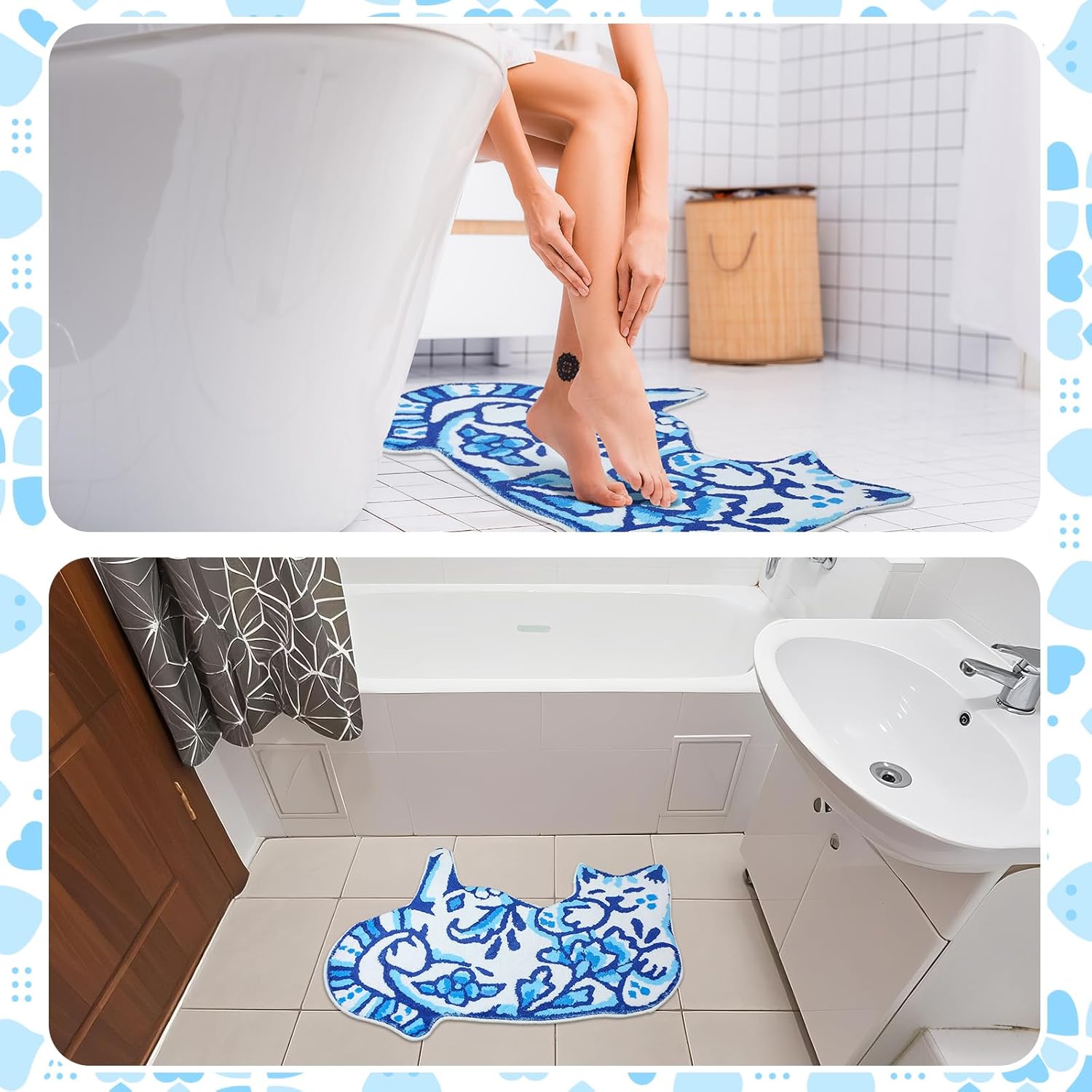 Suavidad y comodidad: experimenta una comodidad inigualable con nuestra alfombrilla de baño azul Delft con forma de gato, hecha de 100% microfibra; las fibras muy suaves proporcionan una sensación encantadora y acogedora cada vez que sales de la ducha