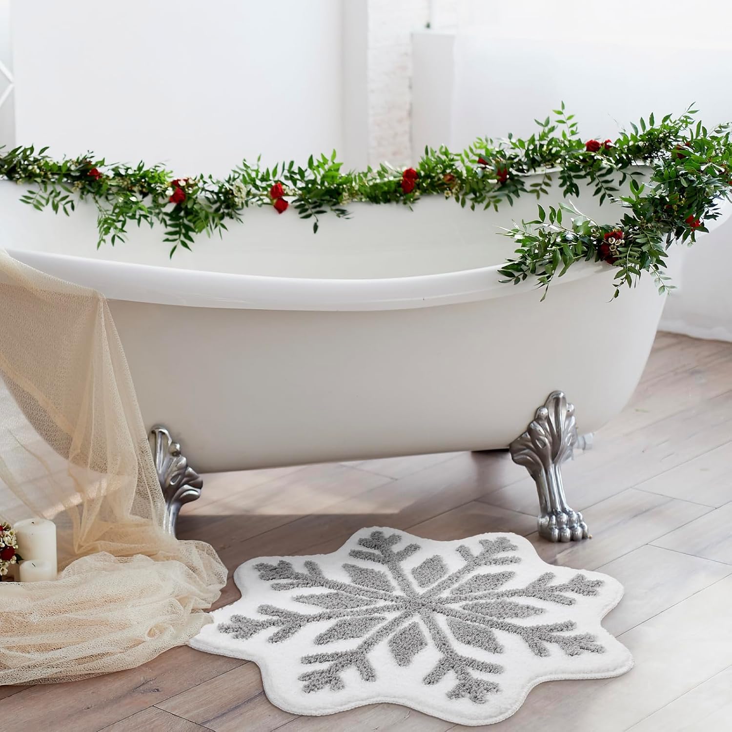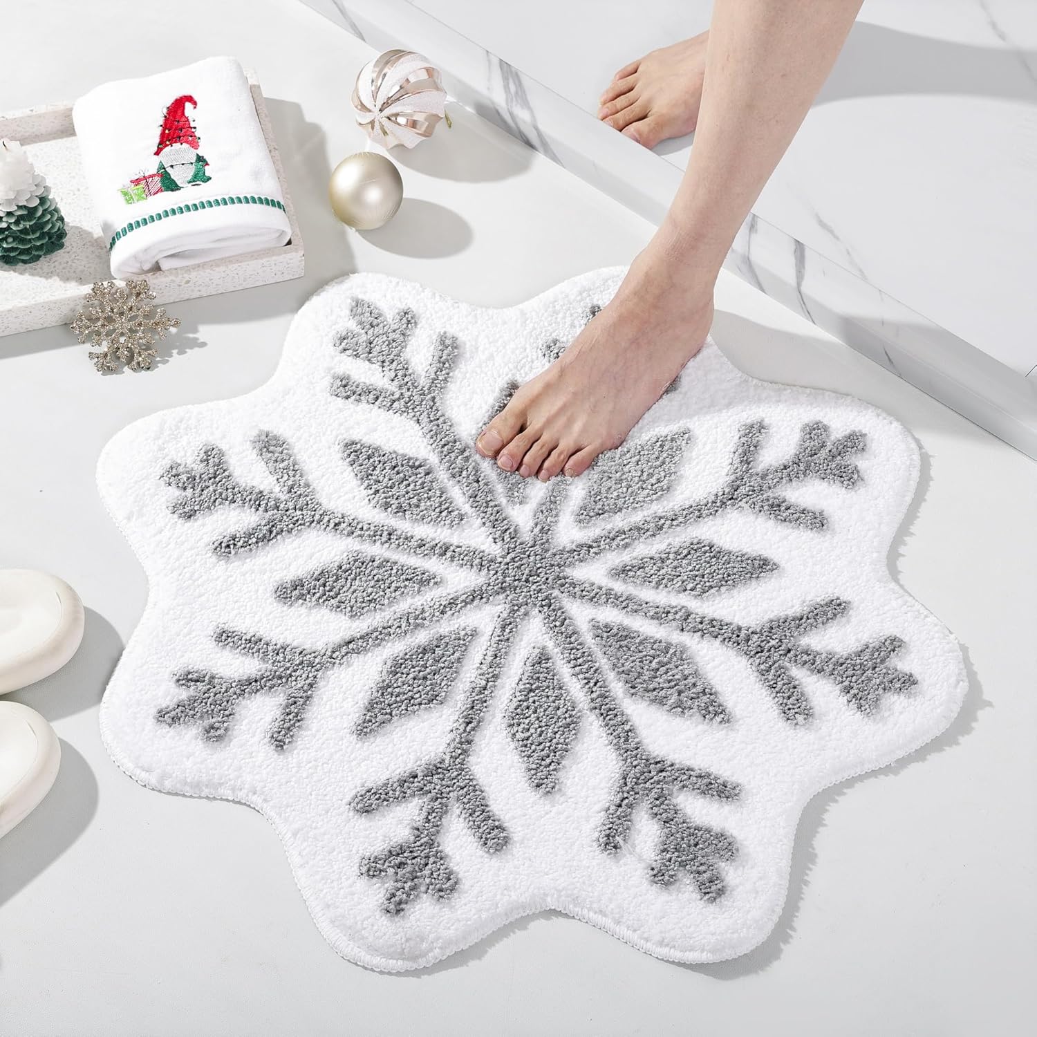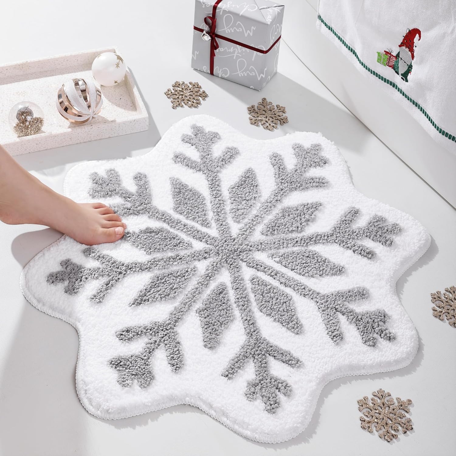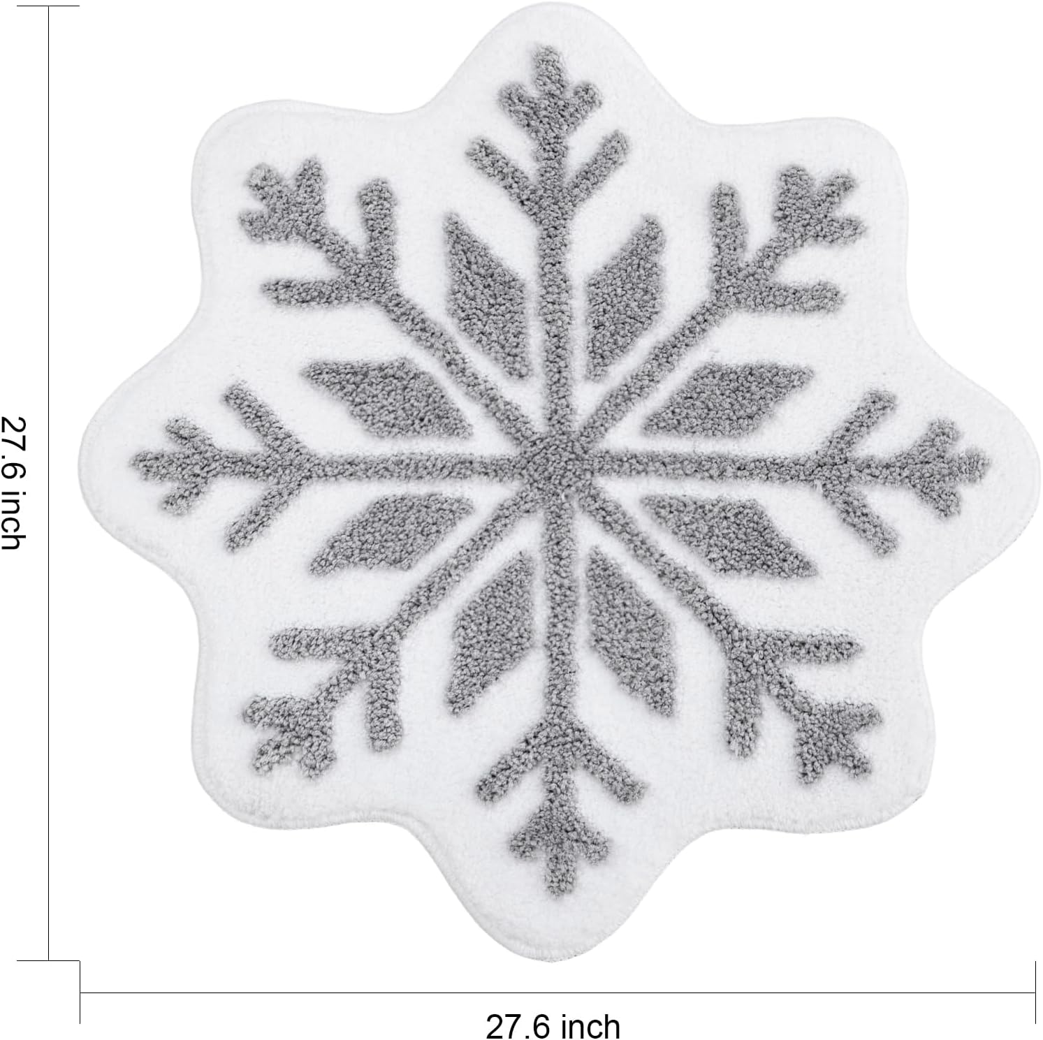 Diseño único y divertido: el tamaño de la alfombra de baño antideslizante en forma de copo de nieve blanco y gris es de 27.6 x 27.6 (aprox. 70.1 cm), el patrón de copo de nieve de la alfombra de baño semicírculo es súper lindo y suave