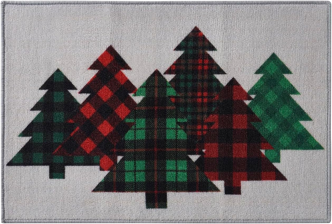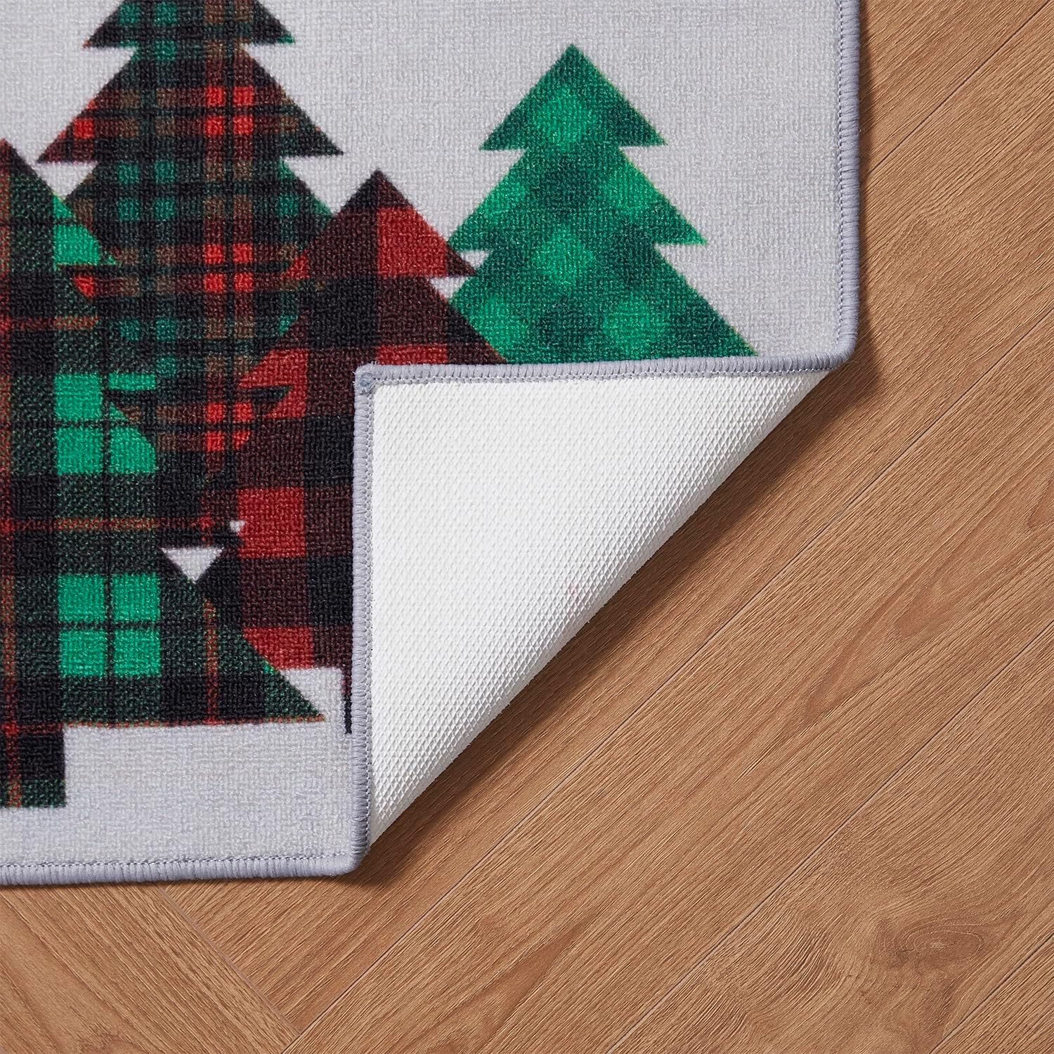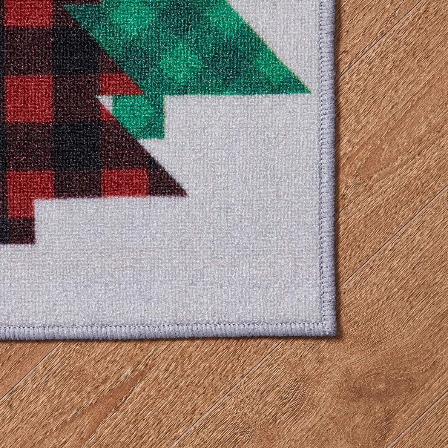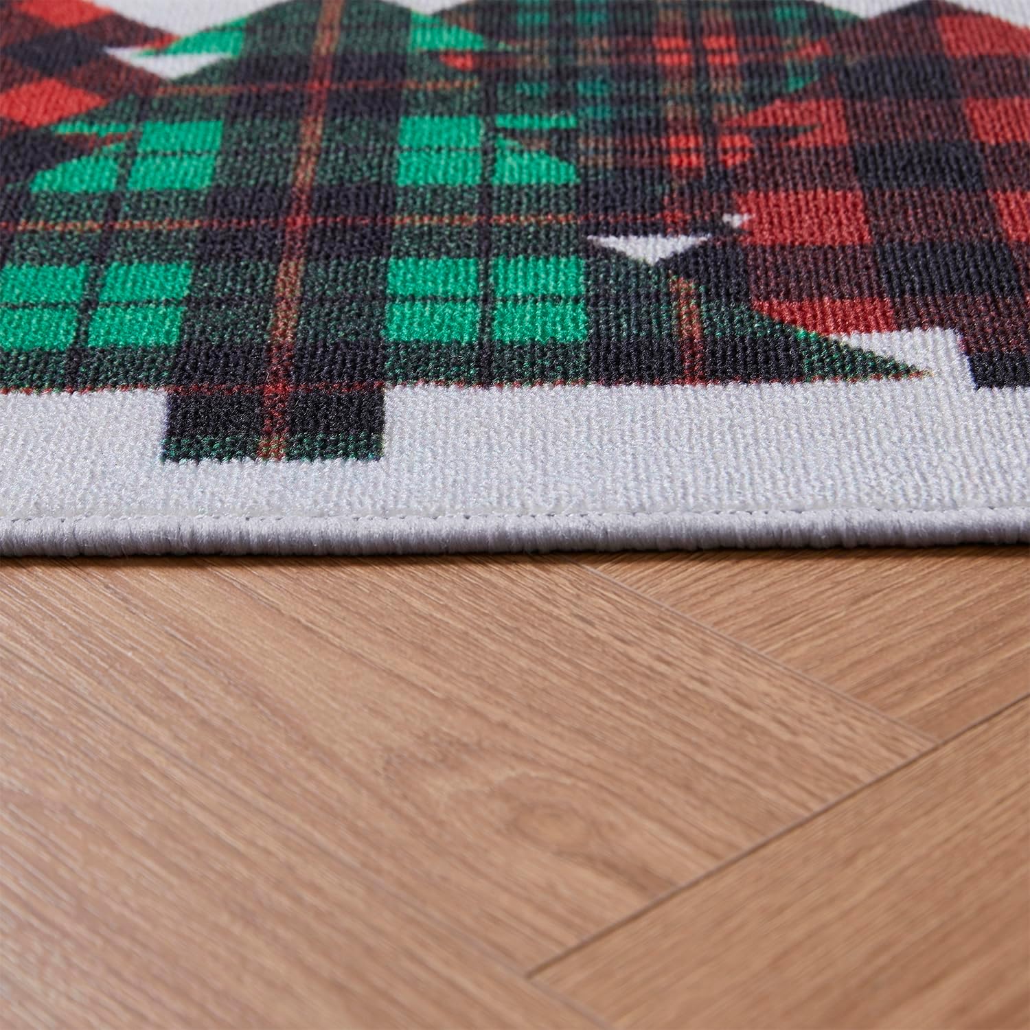 Decoración navideña festiva: una adición atemporal a tu decoración navideña de interior, esta alfombra decorativa tiene estampados de árboles con estampado de cuadros rojos y verdes sobre un fondo gris.