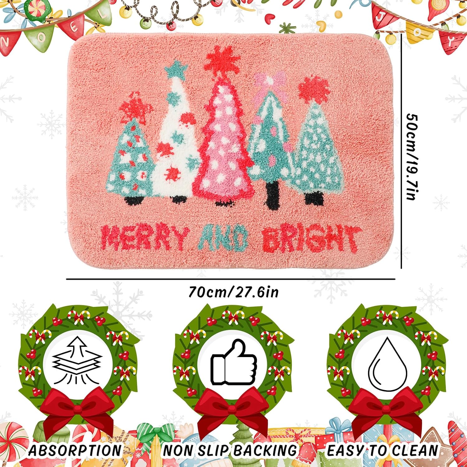 Tema de Navidad rosa: nuestras alfombras de baño tienen temática navideña rosa, están estampadas con árboles de Navidad, copos de nieve, estrellas, puntos, etc., impresas con las palabras alegre y brillante, lo que creará un fuerte ambiente festivo para el hogar y la fiesta.