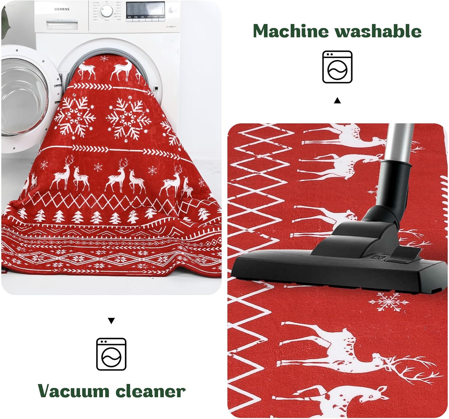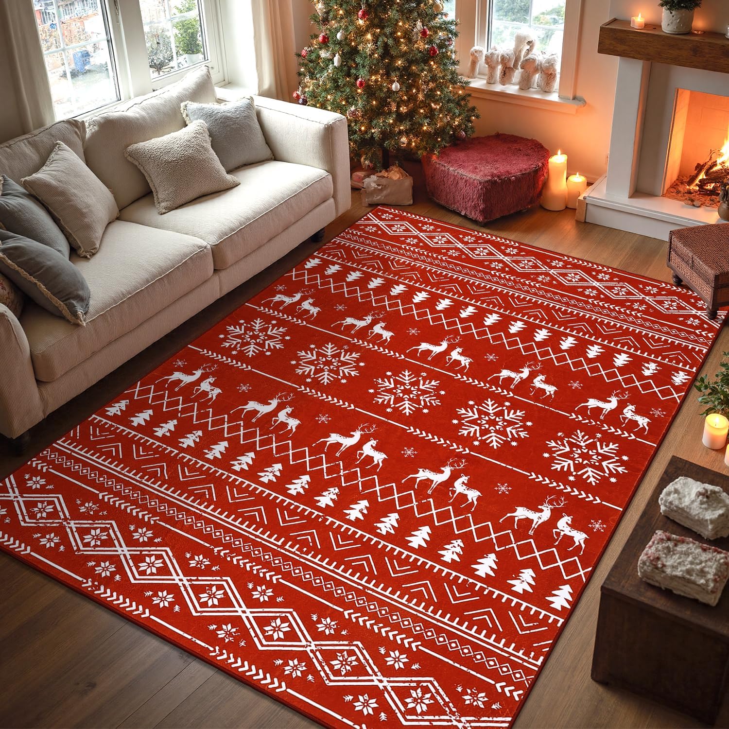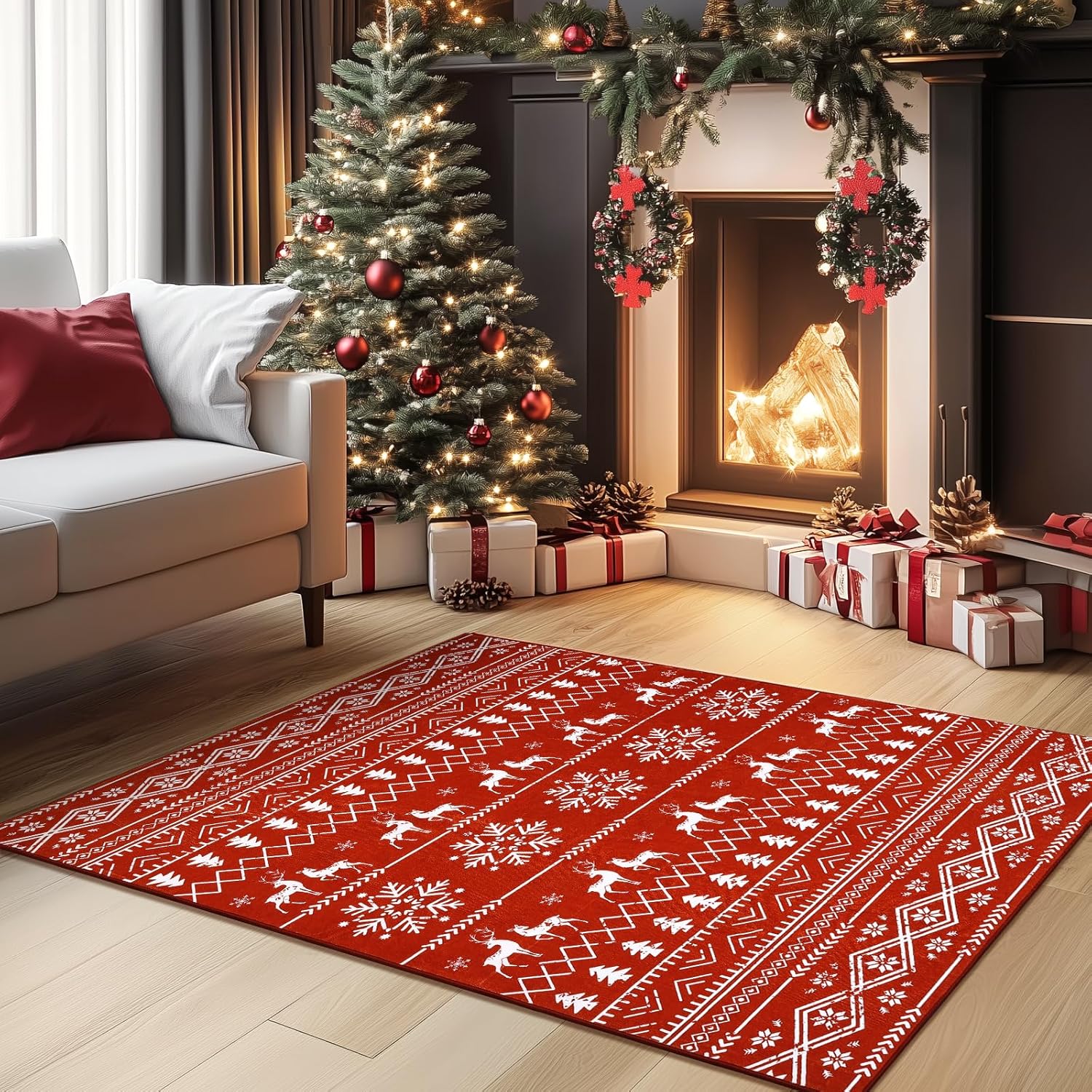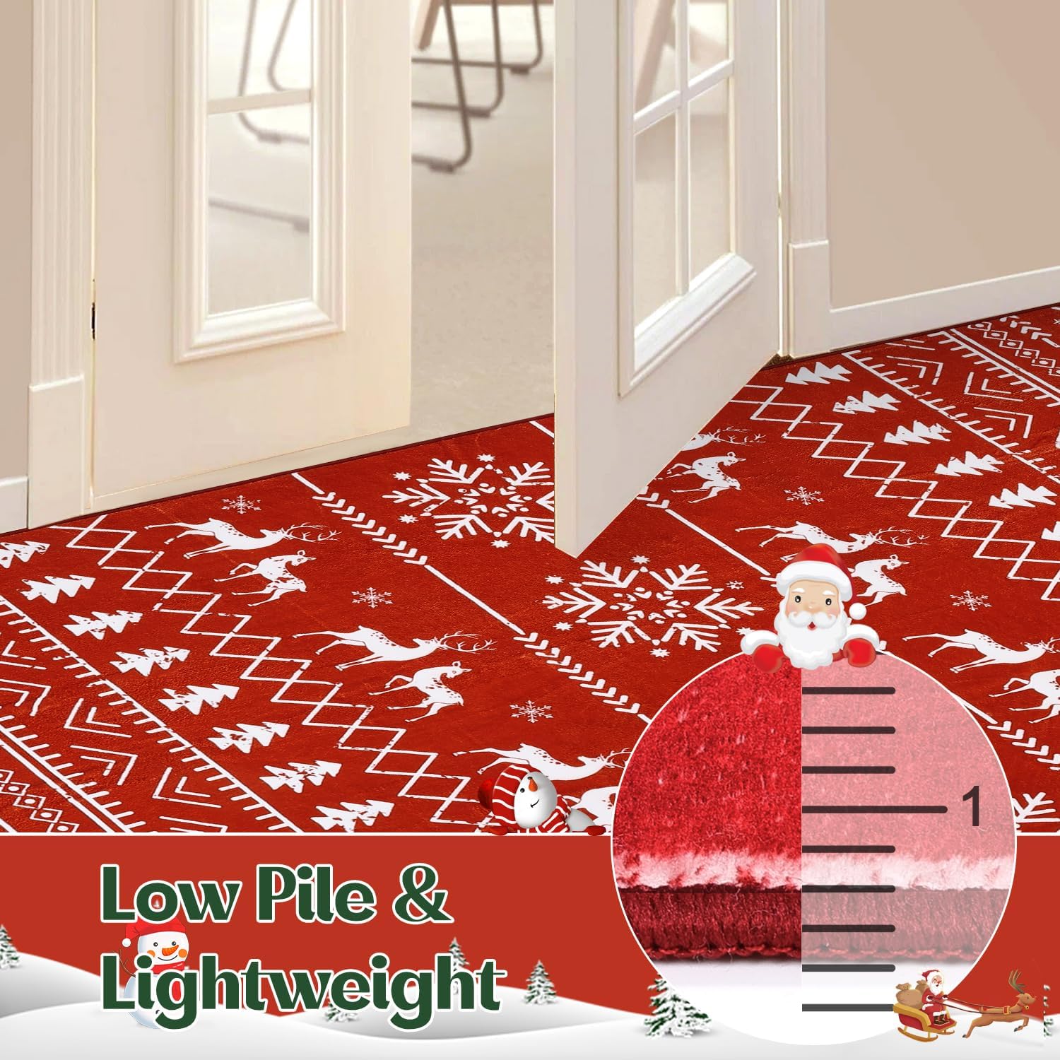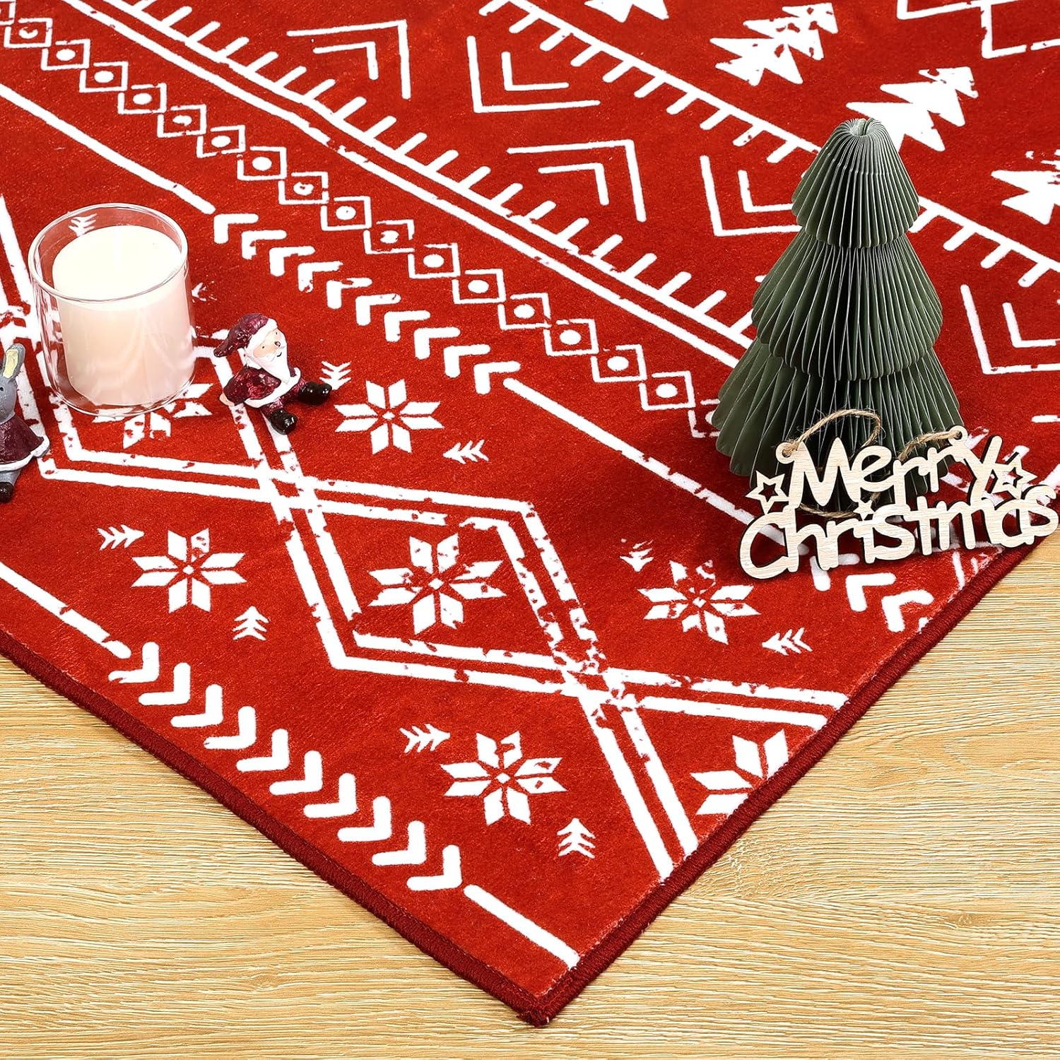 Diseño navideño y alfombra suave: la alfombra de Navidad de Yamaziot está hecha de 100% lana sintética de poliéster que es suave de lujo bajo los pies y amigable con los pies descalzos. Esta alfombra de Navidad cuenta con un encantador patrón impreso con árbol de Navidad, copo de nieve y otros elementos festivos. Añade un toque acogedor de calidez y estilo festivo a tu hogar con nuestra alfombra de Navidad